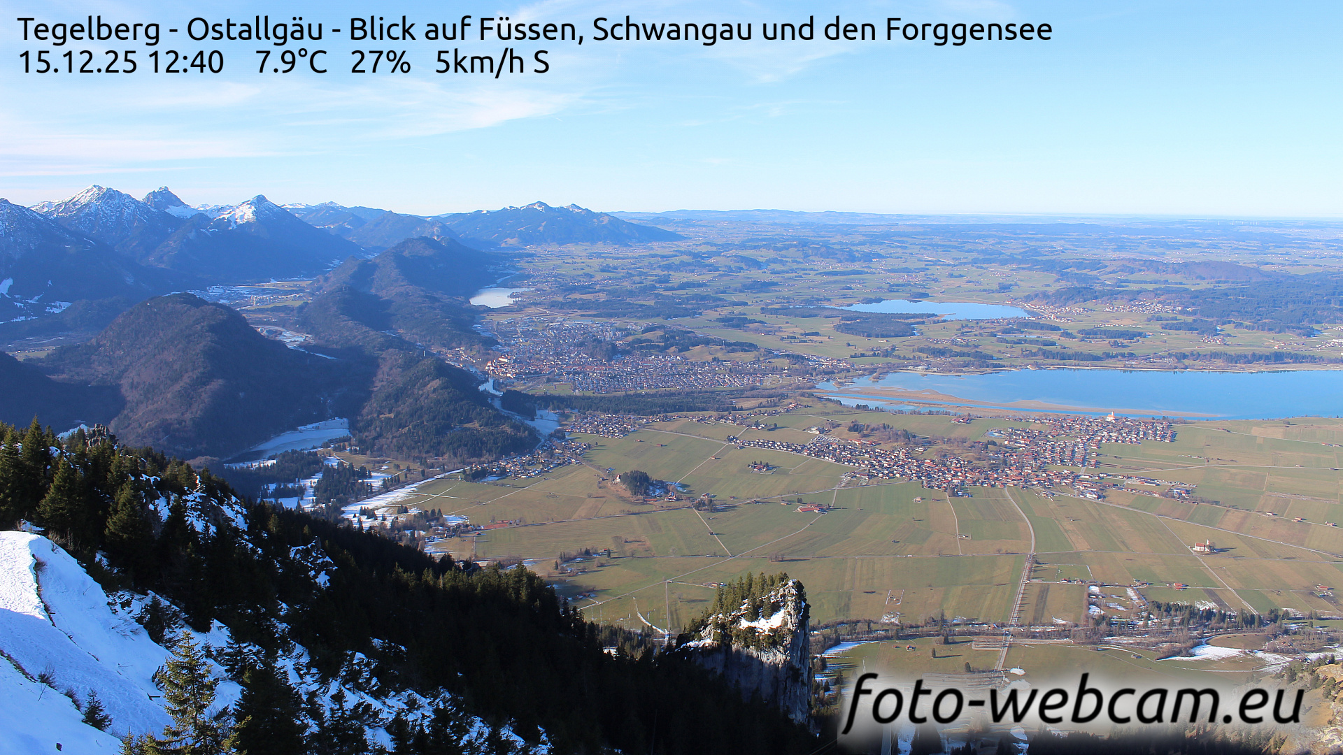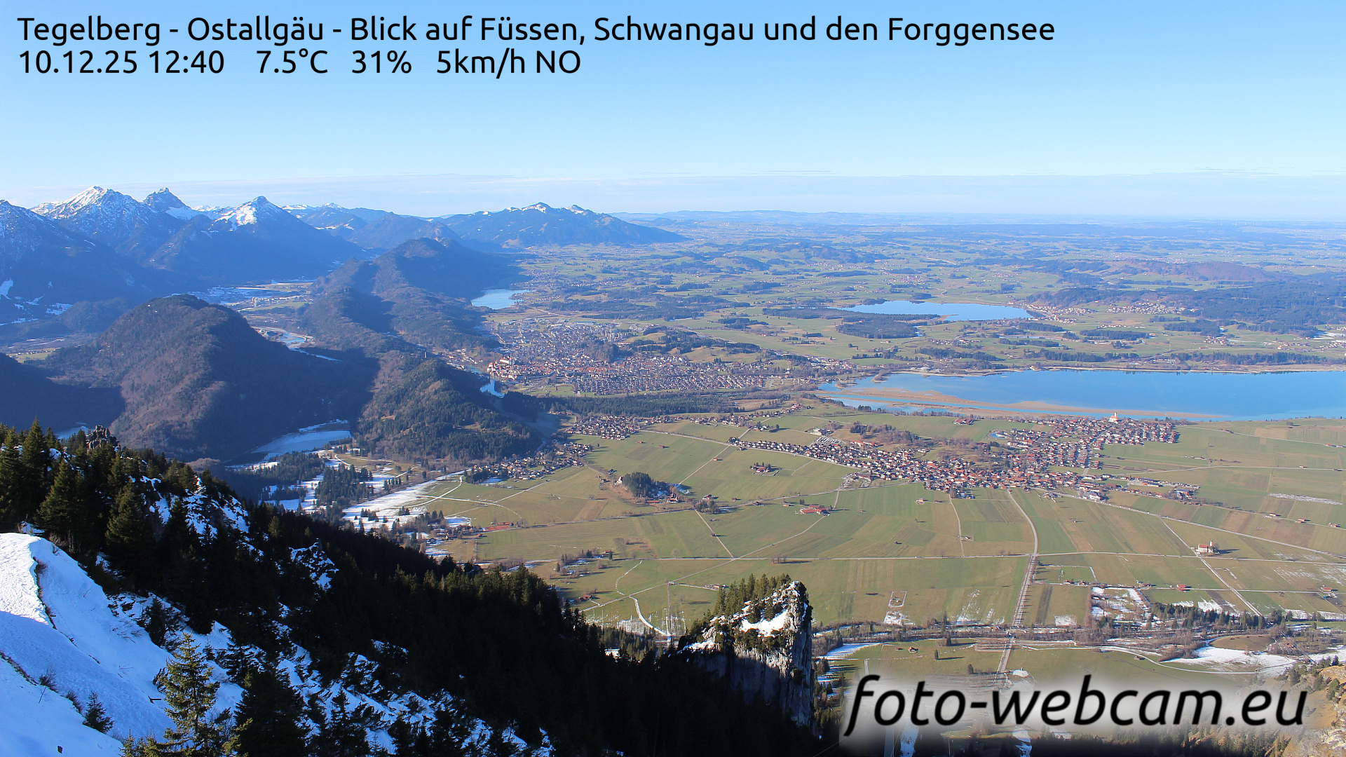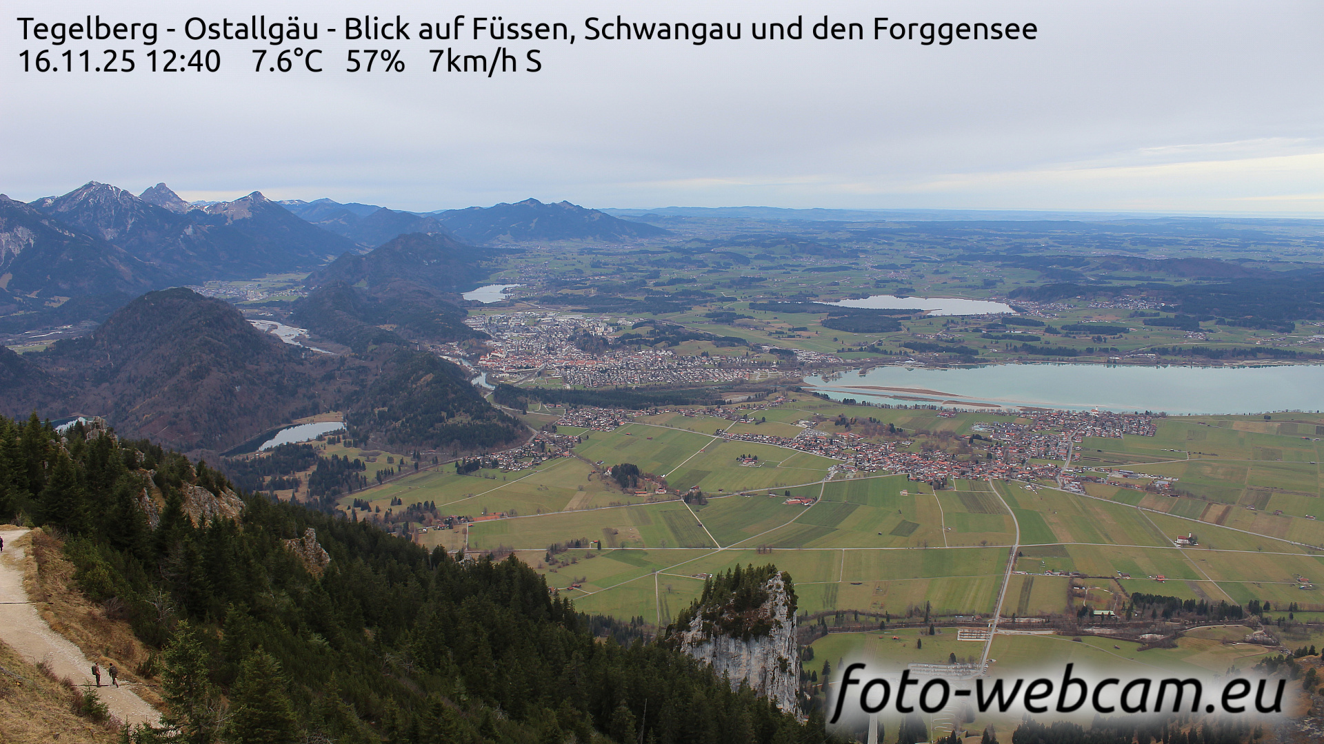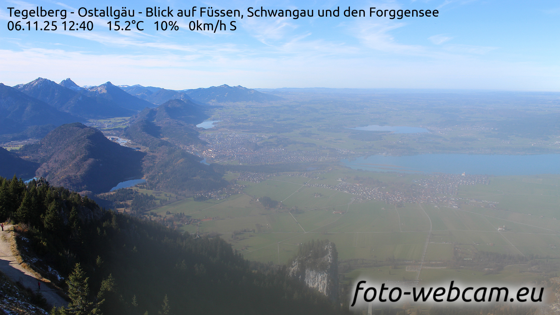 Schwangau, Deutschland - 1.1 km von Alterschrofen: HD-Blick auf Füssen und Forggensee - Der Blick zeigt nach Nordwesten. Etwas links von der Mitte liegt Füssen. Rechts ist der südliche Teil des Forggensees und der Ort Schwangau.