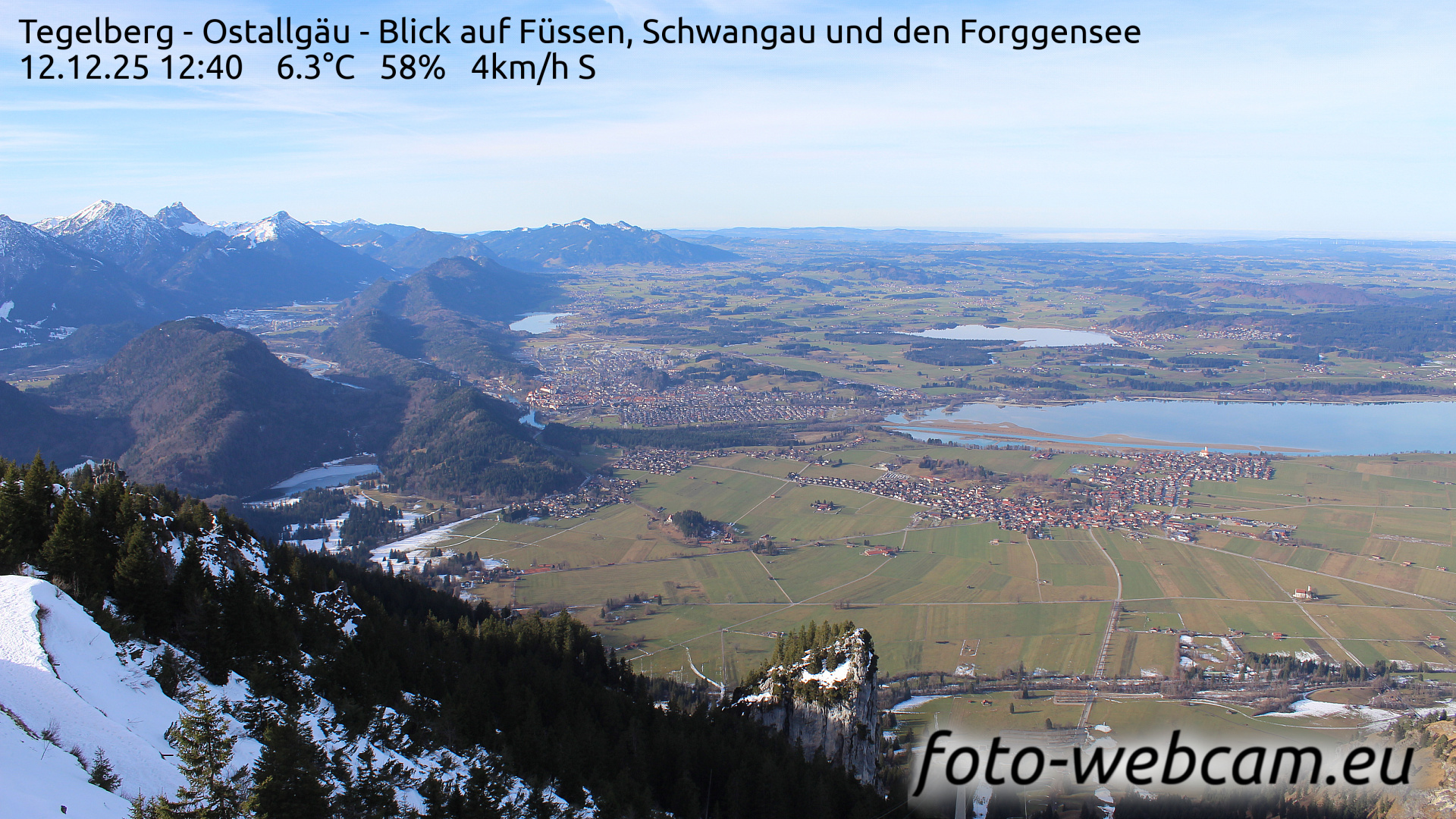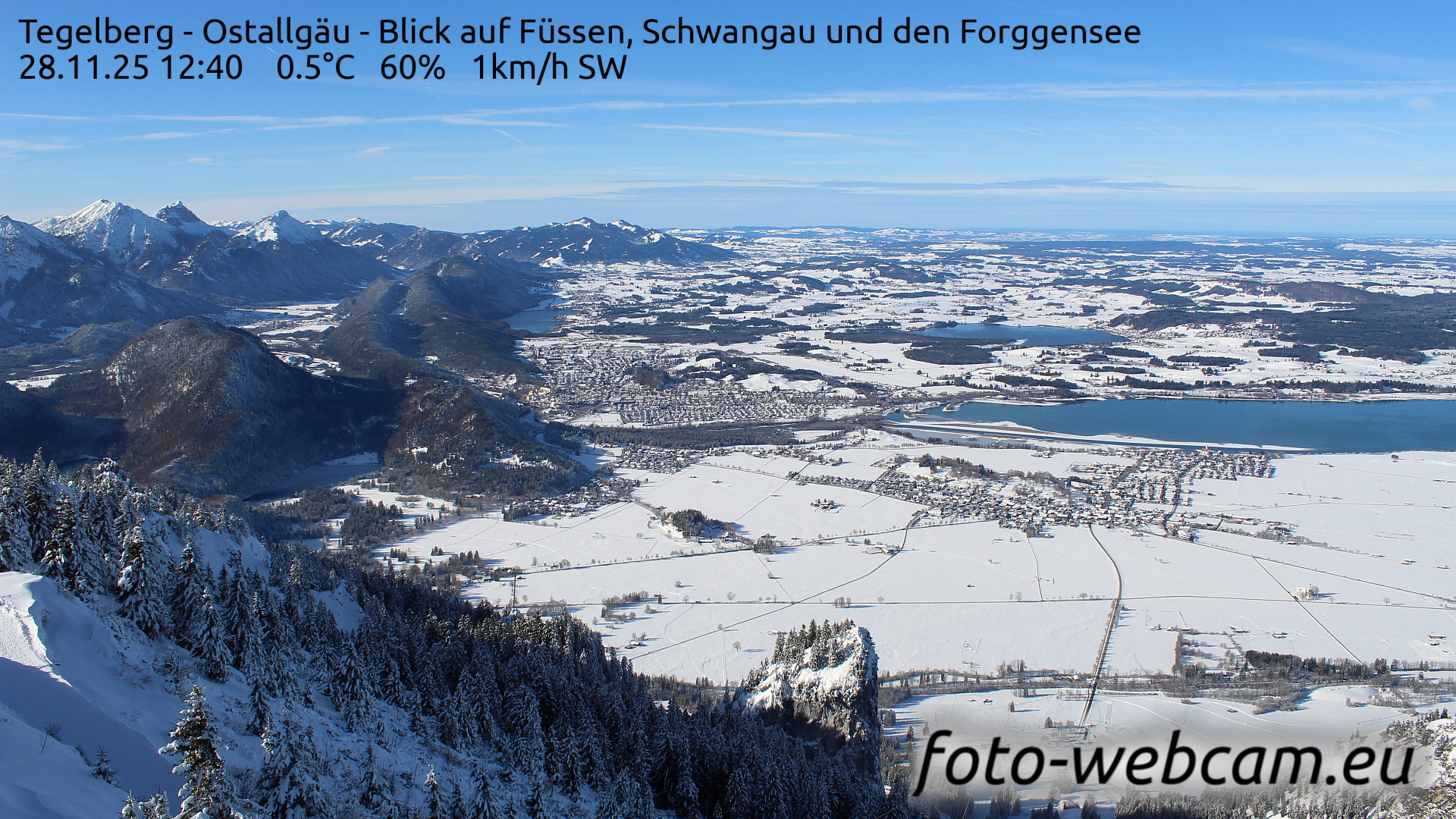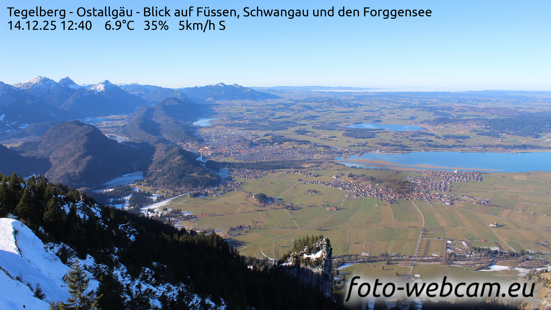 Schwangau, Deutschland - 1.1 km von Alterschrofen: HD-Blick auf Füssen und Forggensee - Der Blick zeigt nach Nordwesten. Etwas links von der Mitte liegt Füssen. Rechts ist der südliche Teil des Forggensees und der Ort Schwangau.