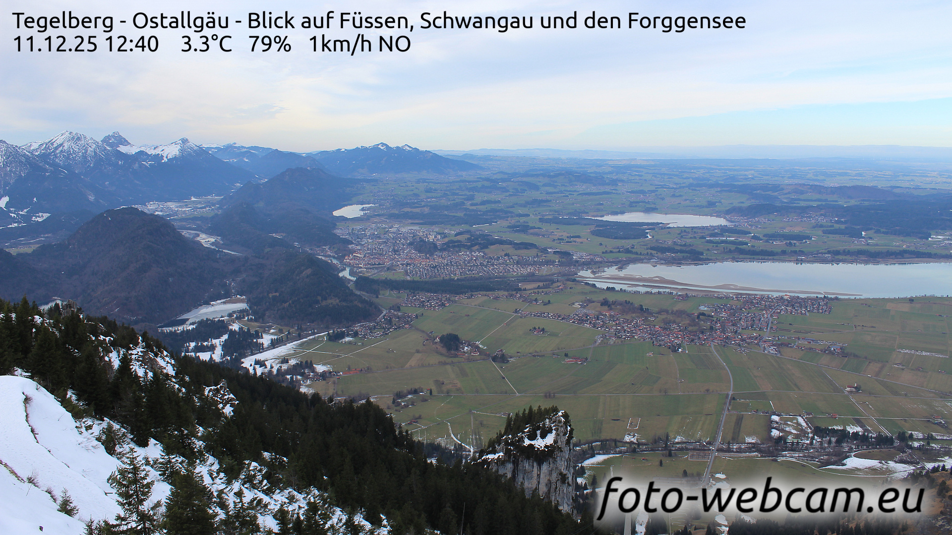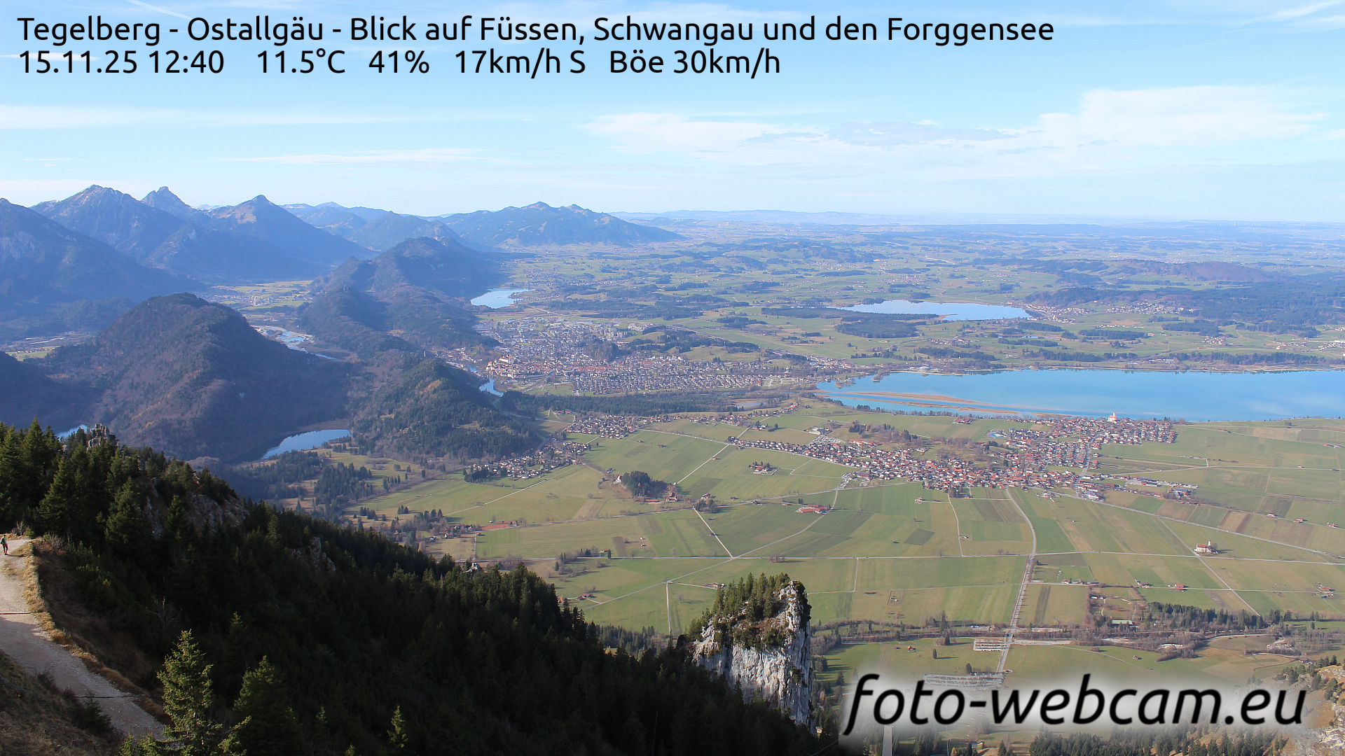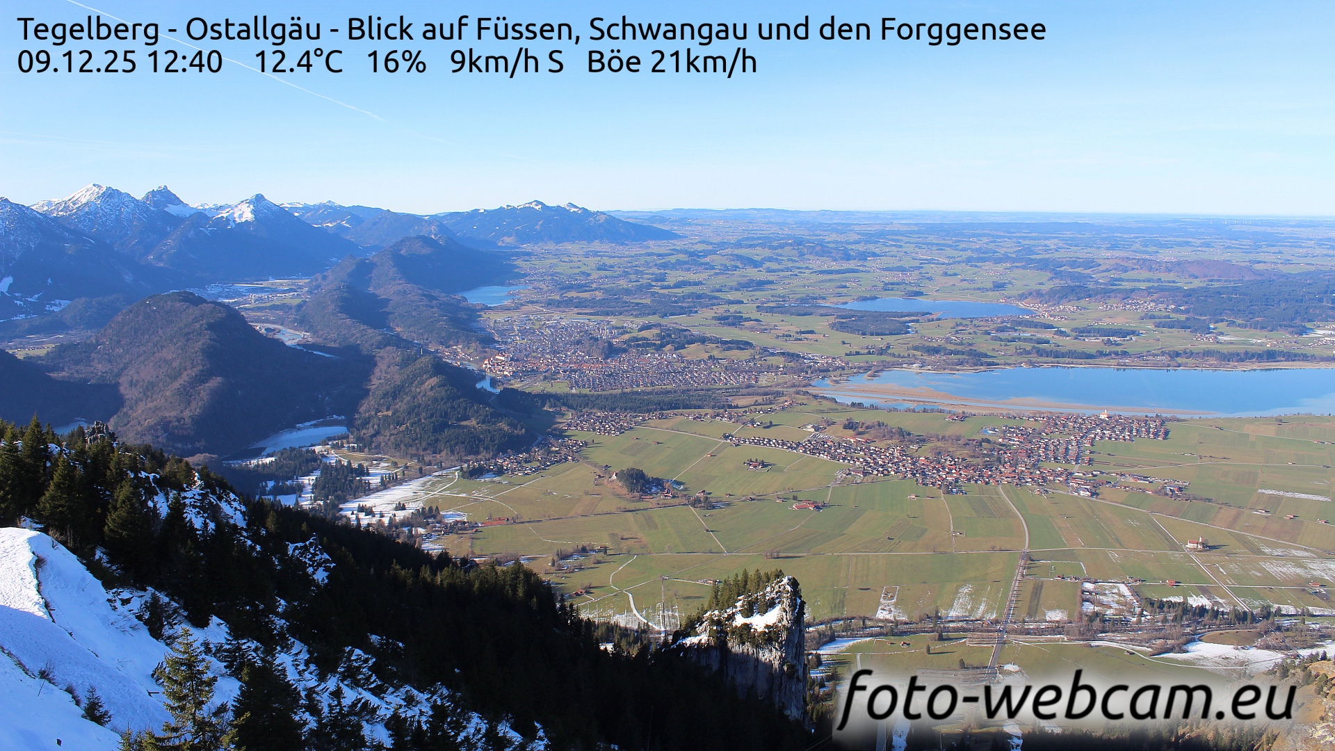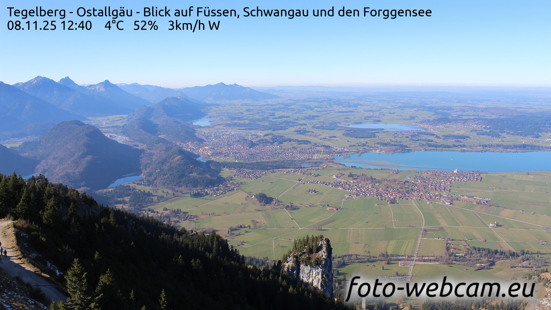 Schwangau, Deutschland - 1.1 km von Alterschrofen: HD-Blick auf Füssen und Forggensee - Der Blick zeigt nach Nordwesten. Etwas links von der Mitte liegt Füssen. Rechts ist der südliche Teil des Forggensees und der Ort Schwangau.