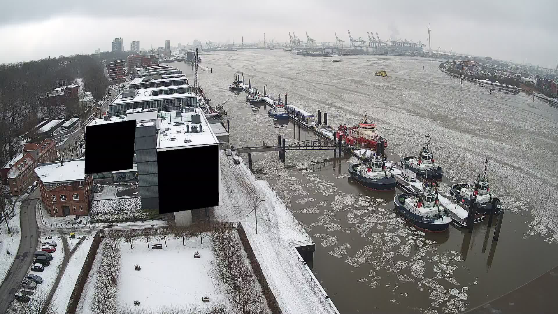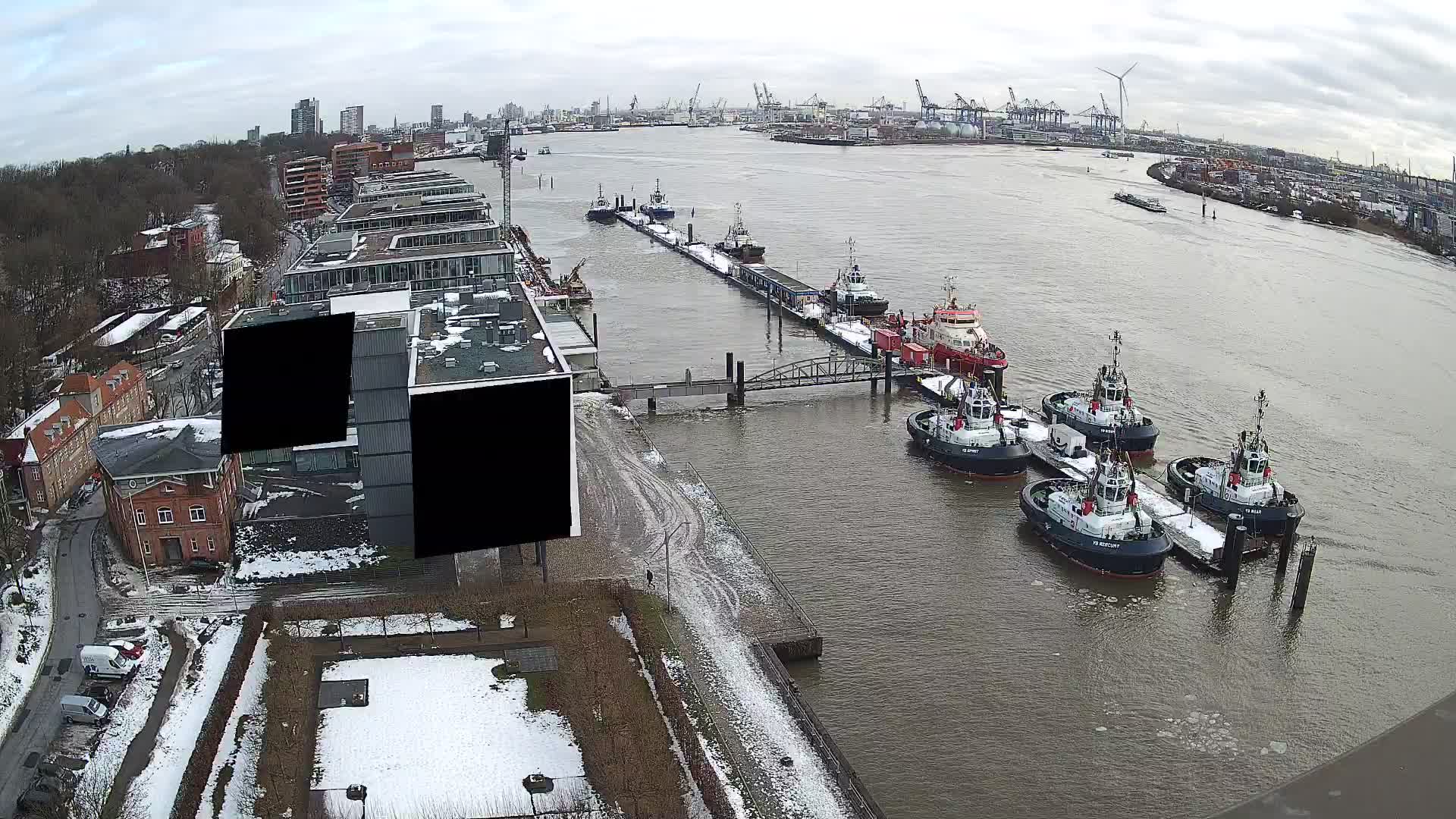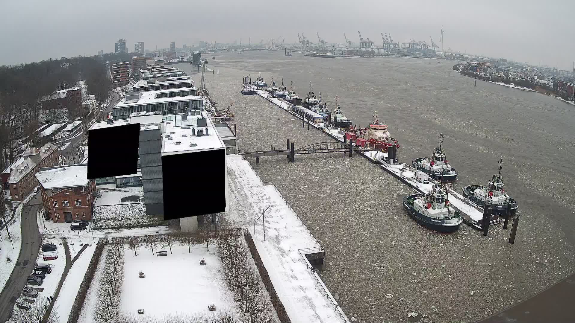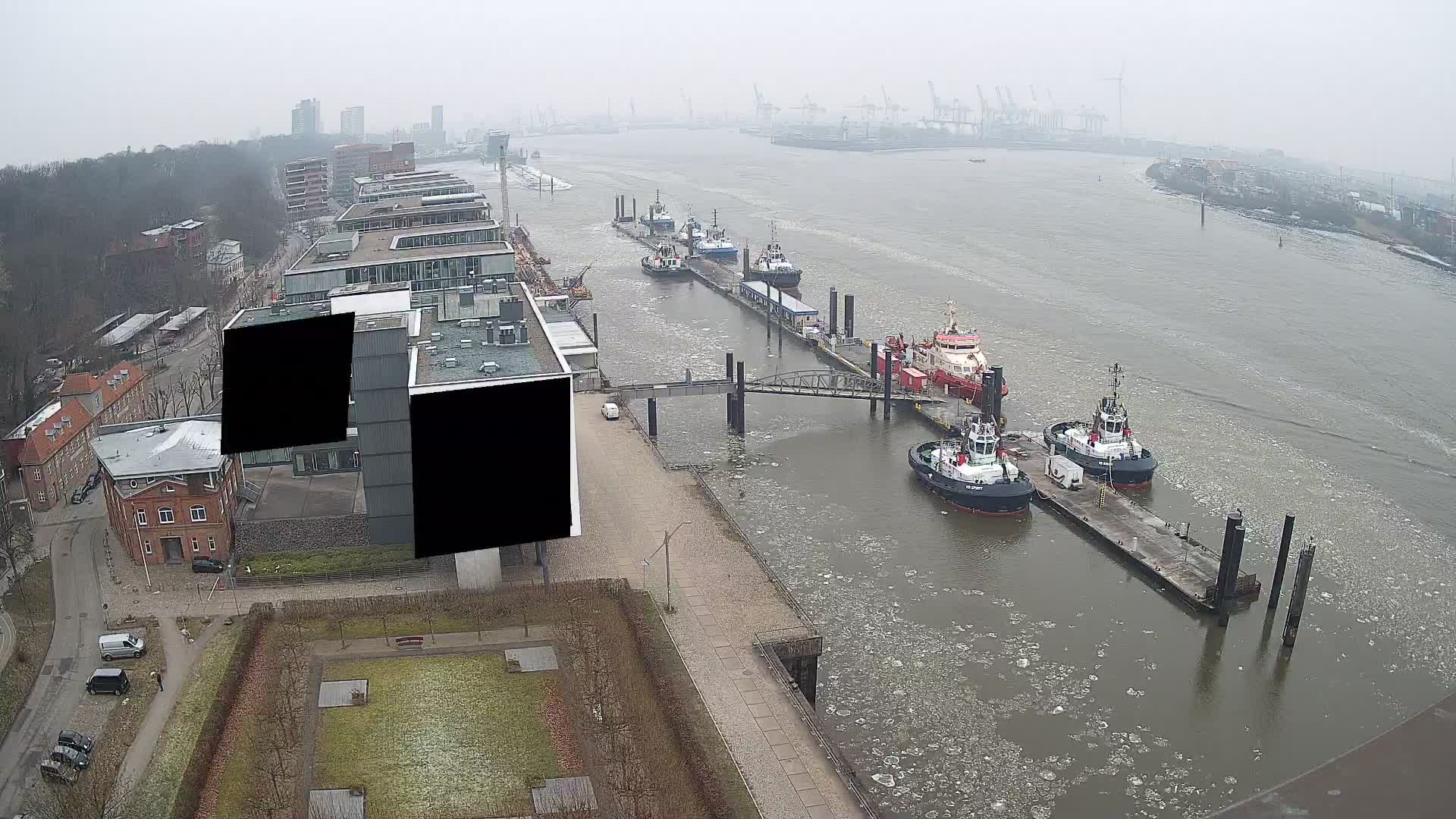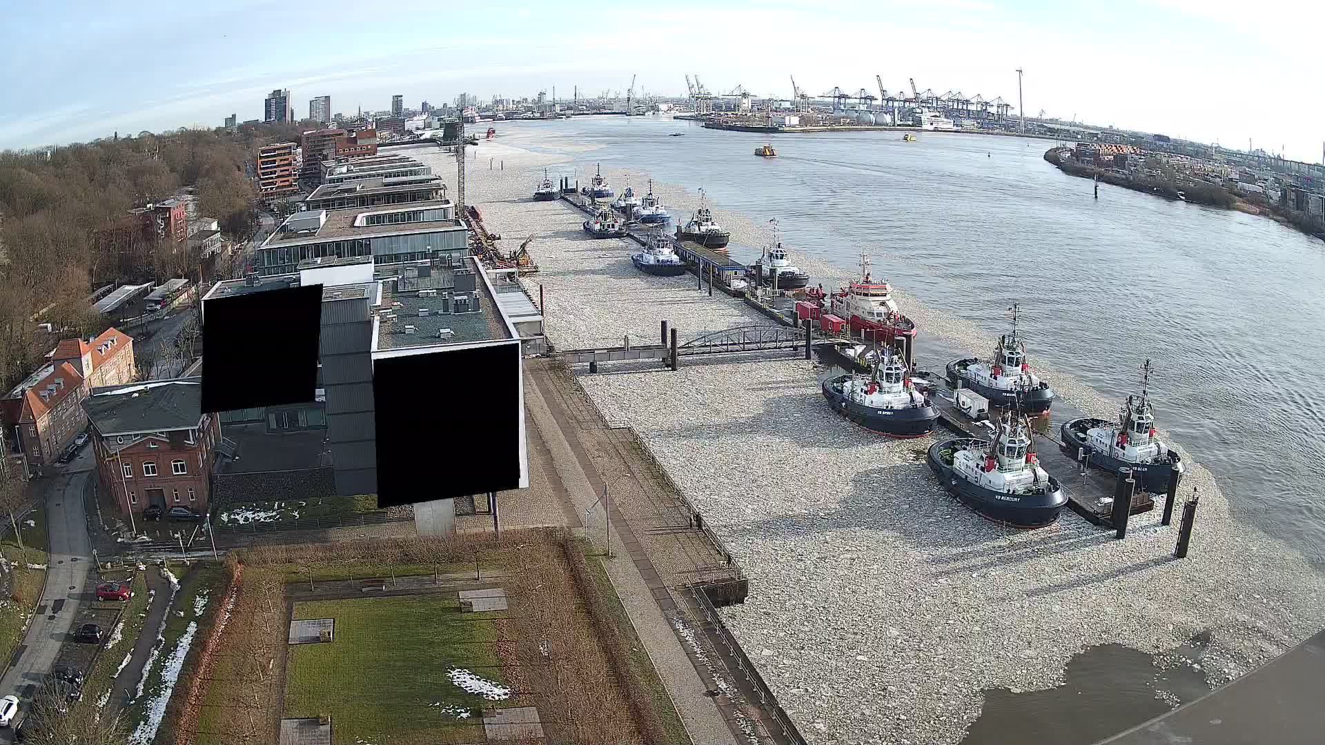 Hamburg, Deutschland - 26.4 km von Alveslohe: Hamburg Övelgönne Richtung Osten - Die Webcam Richtung Osten zeigt vom Augustinum die eigentlichen Hafeneinfahrten. Hier werden alle 'Riesen-Pötte', die nicht schon vorher angelegt haben, vorbeifahren, um zu ihrem Dock zu fahren. Eine Reihe von Schleppern steht für Andockmanöver bereit.