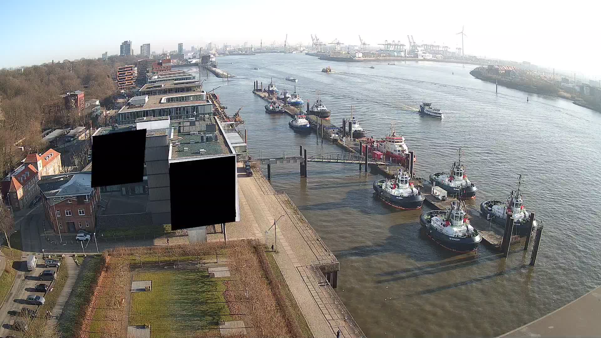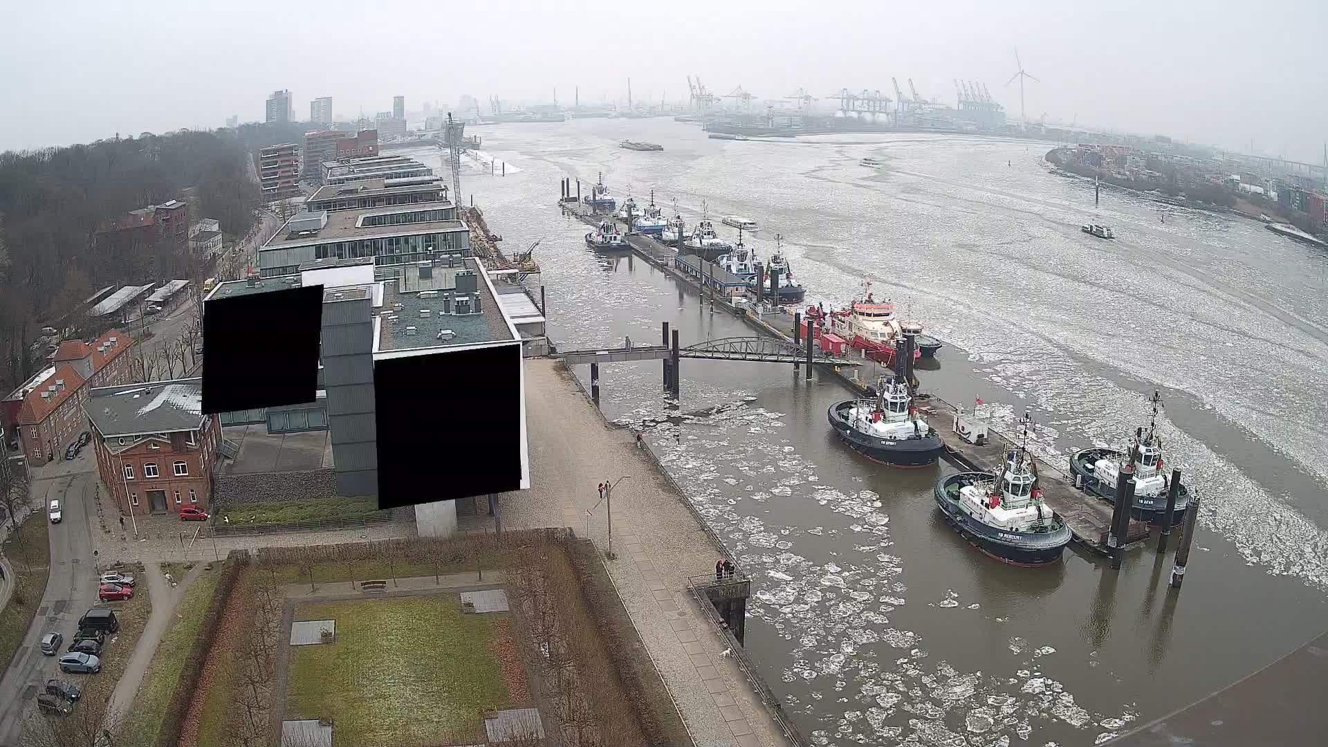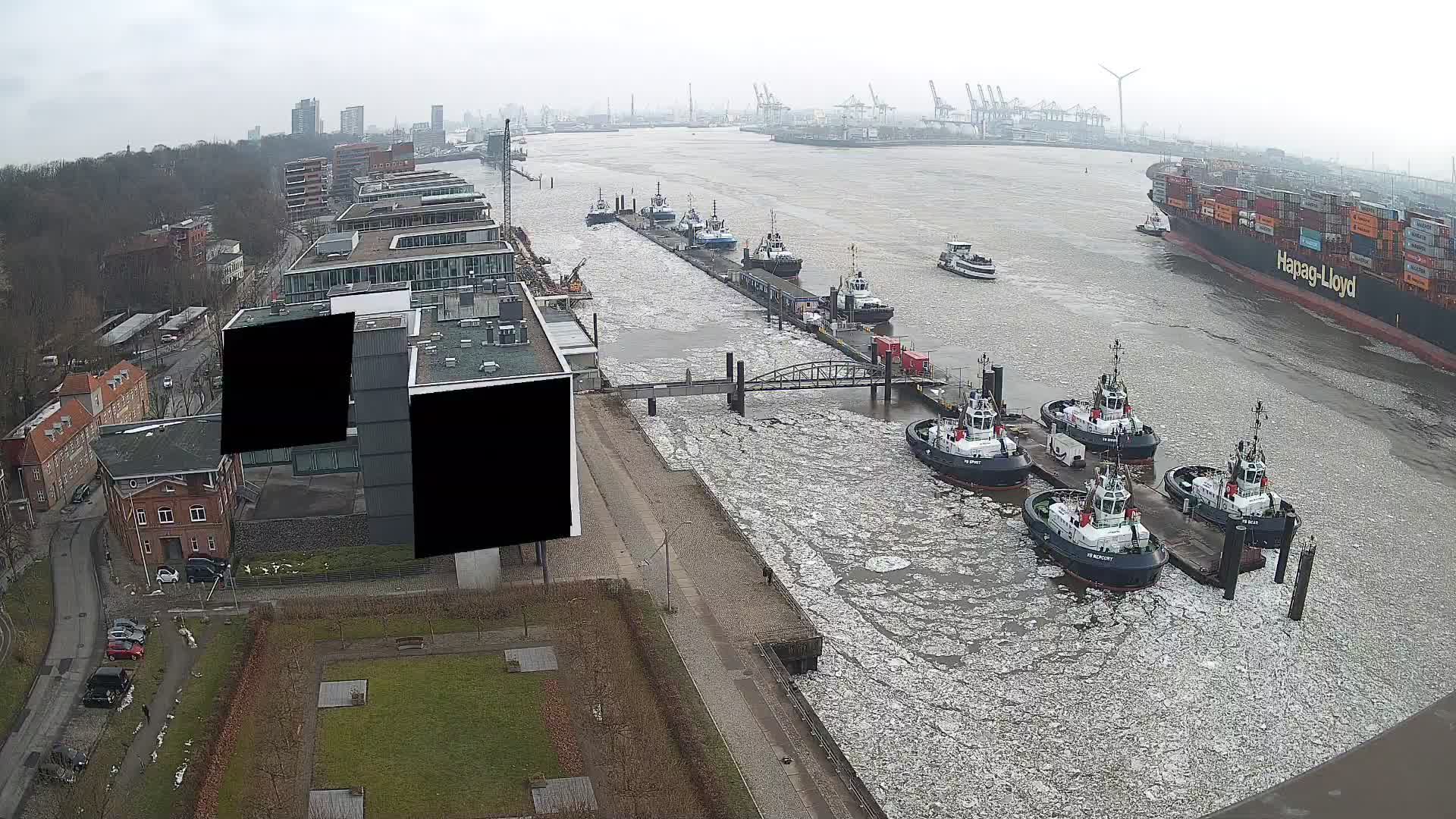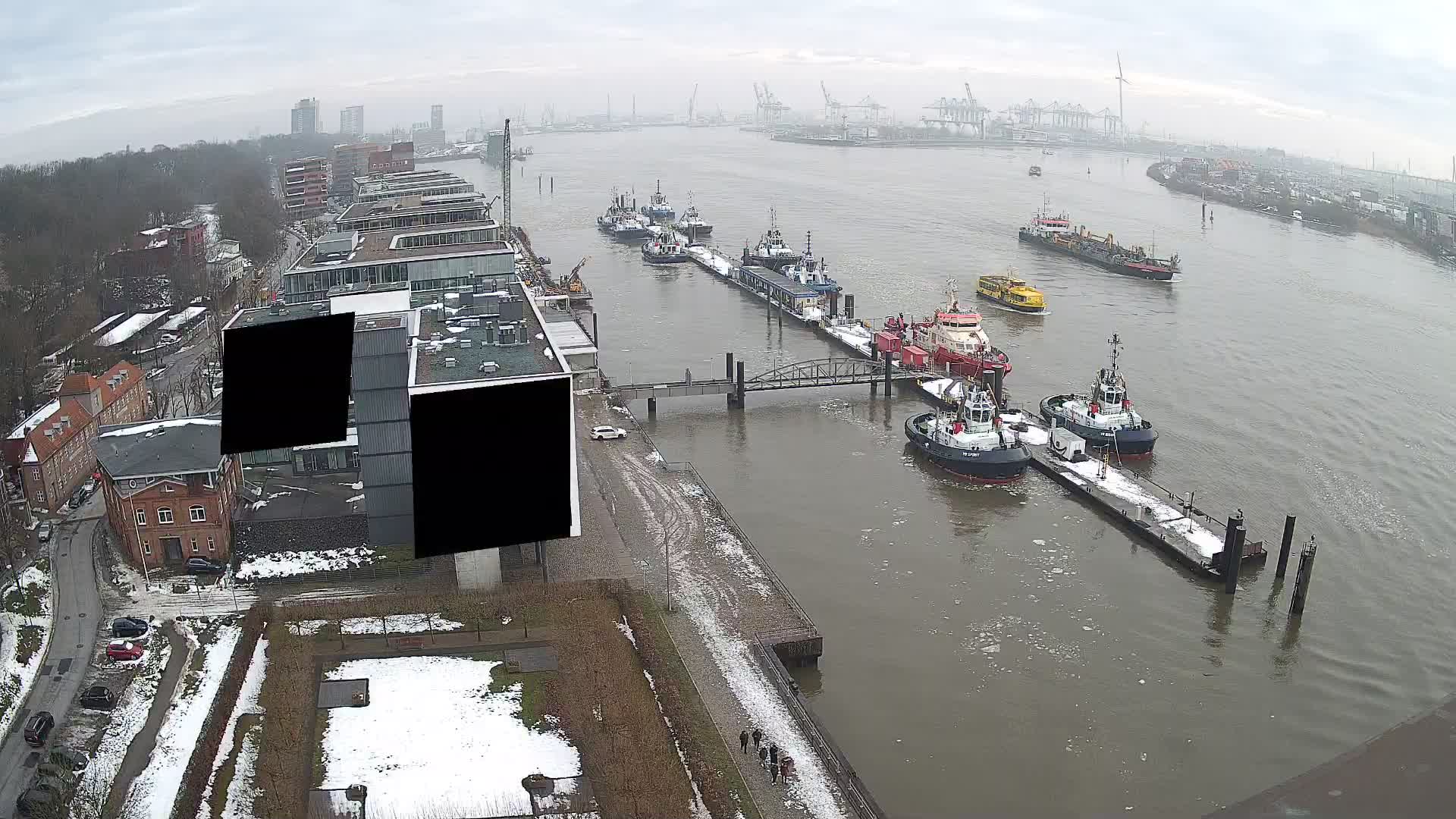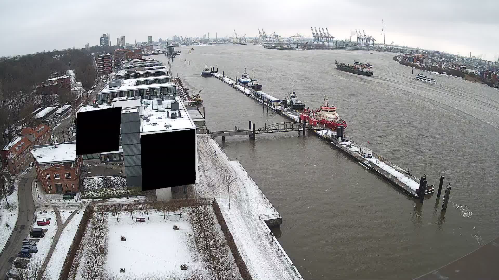 Hamburg, Deutschland - 26.4 km von Alveslohe: Hamburg Övelgönne Richtung Osten - Die Webcam Richtung Osten zeigt vom Augustinum die eigentlichen Hafeneinfahrten. Hier werden alle 'Riesen-Pötte', die nicht schon vorher angelegt haben, vorbeifahren, um zu ihrem Dock zu fahren. Eine Reihe von Schleppern steht für Andockmanöver bereit.