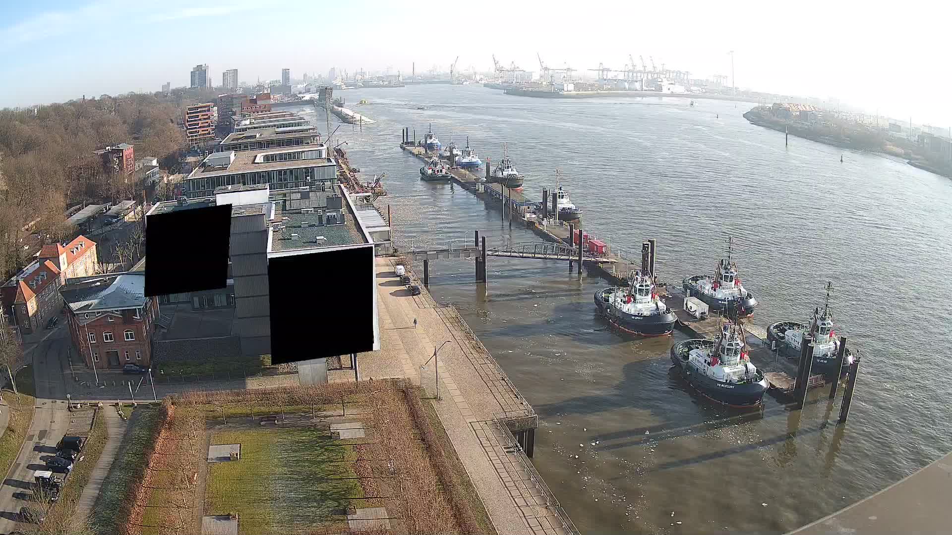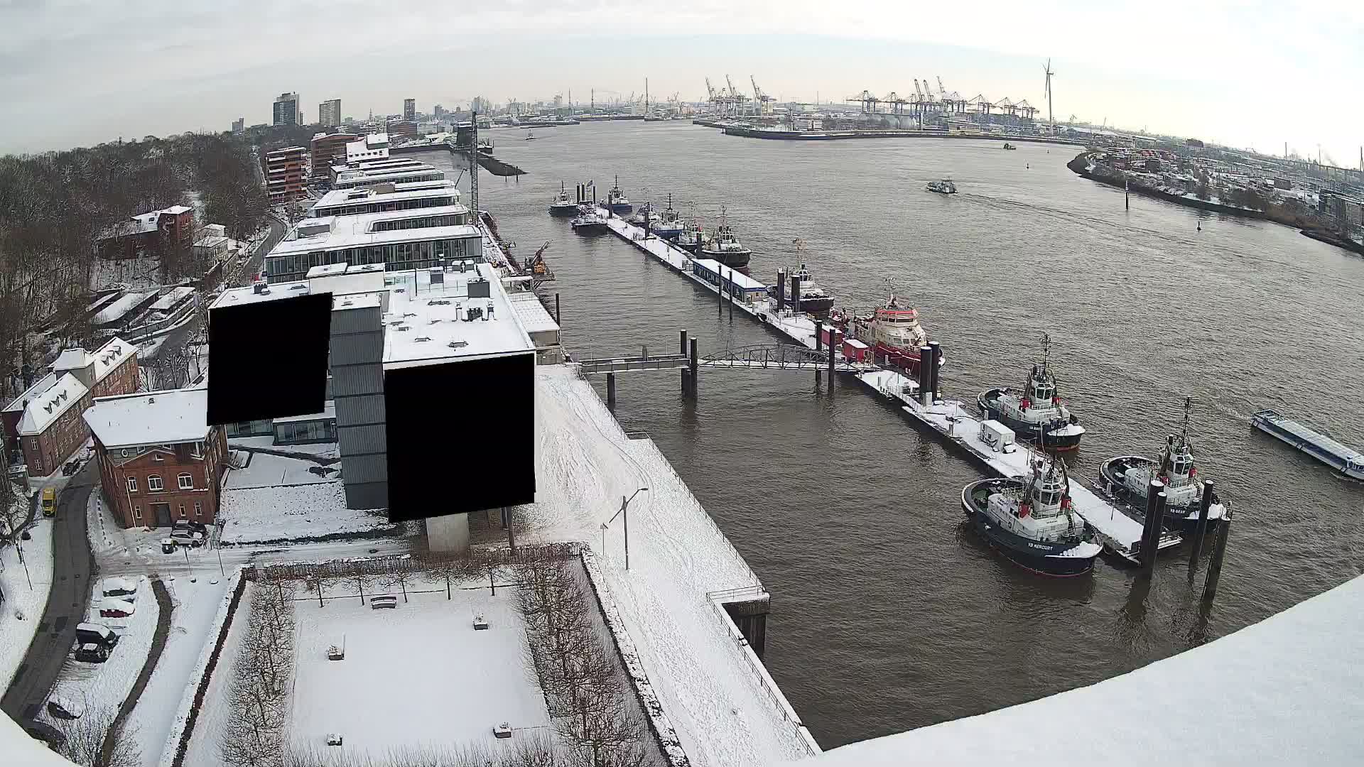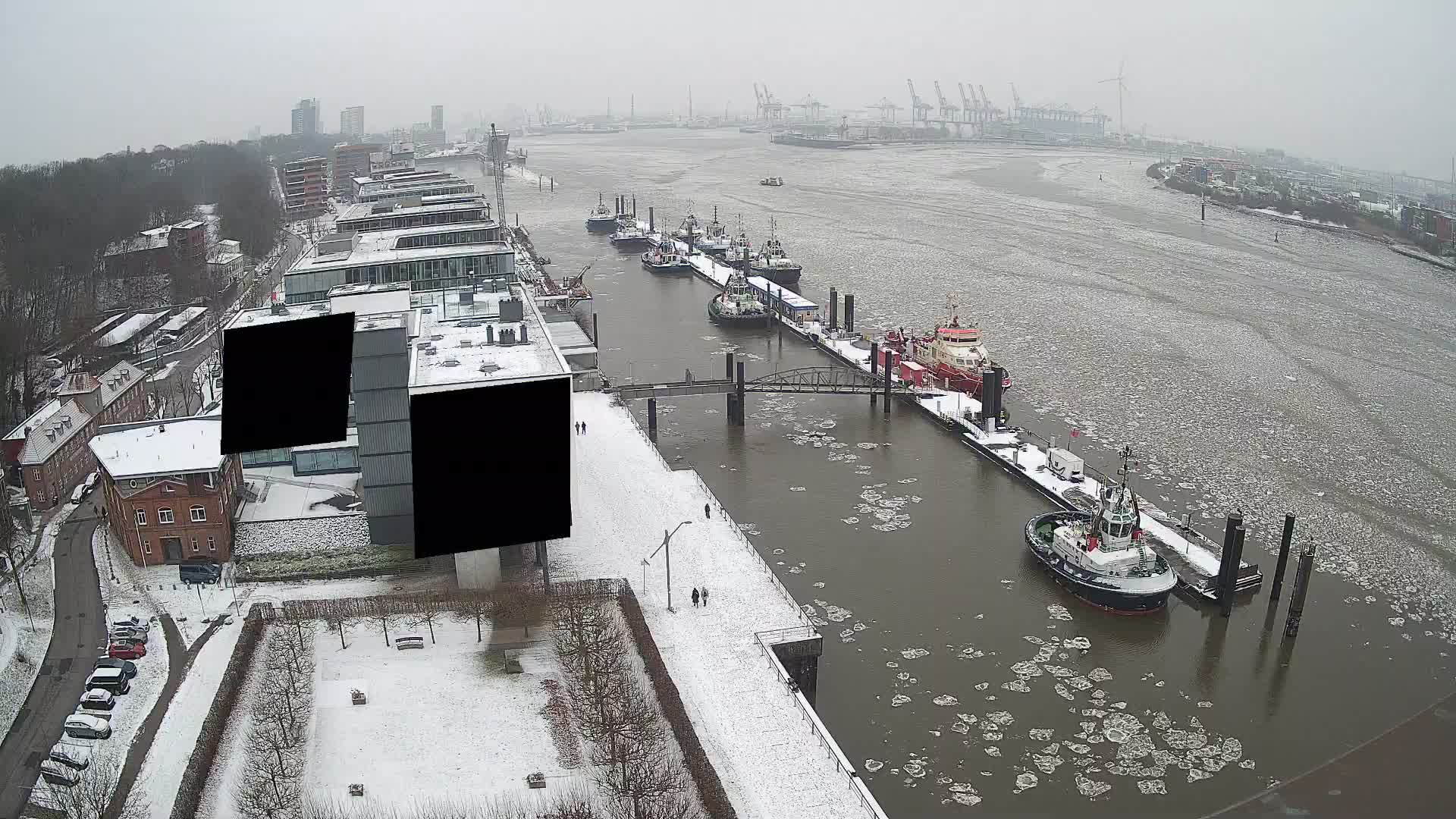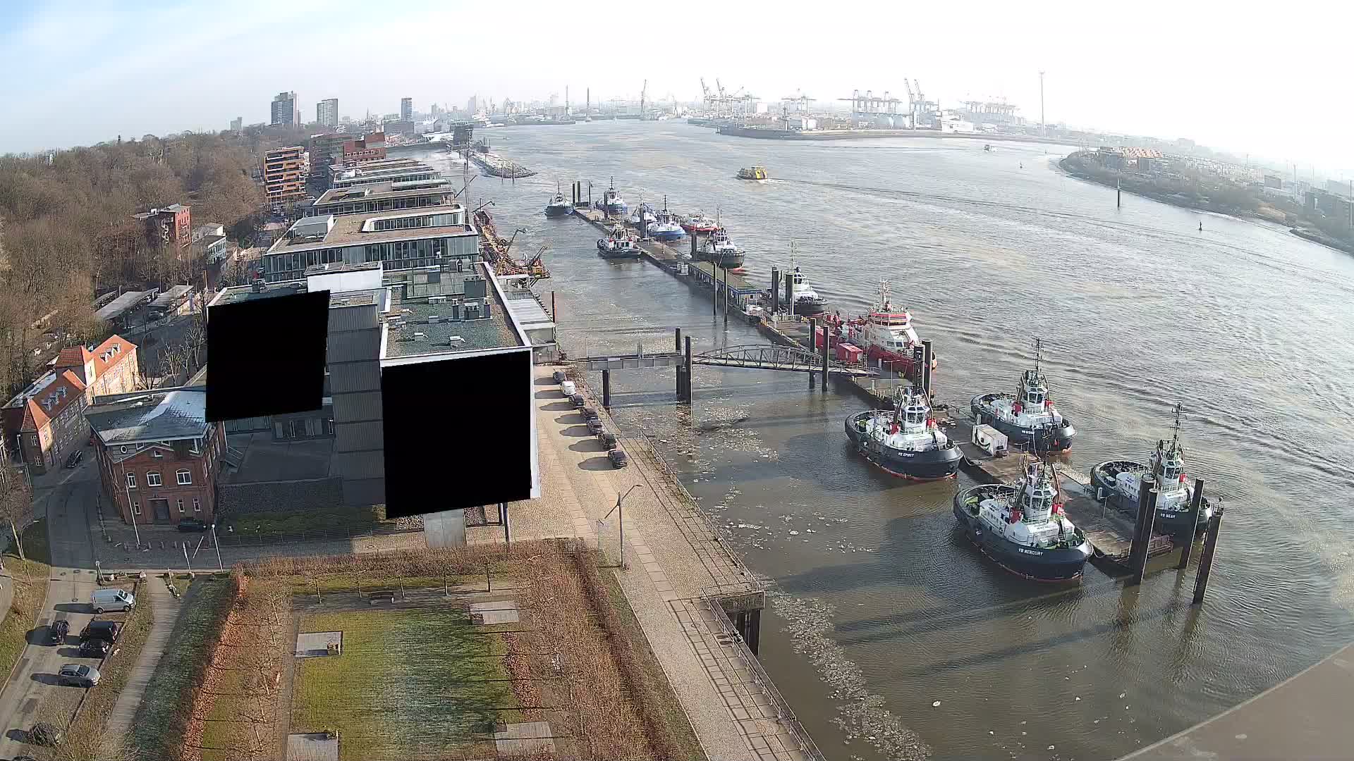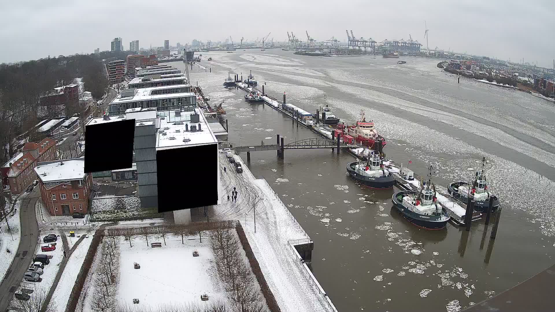 Hamburg, Deutschland - 26.4 km von Alveslohe: Hamburg Övelgönne Richtung Osten - Die Webcam Richtung Osten zeigt vom Augustinum die eigentlichen Hafeneinfahrten. Hier werden alle 'Riesen-Pötte', die nicht schon vorher angelegt haben, vorbeifahren, um zu ihrem Dock zu fahren. Eine Reihe von Schleppern steht für Andockmanöver bereit.