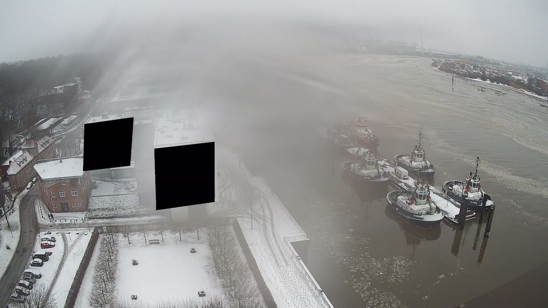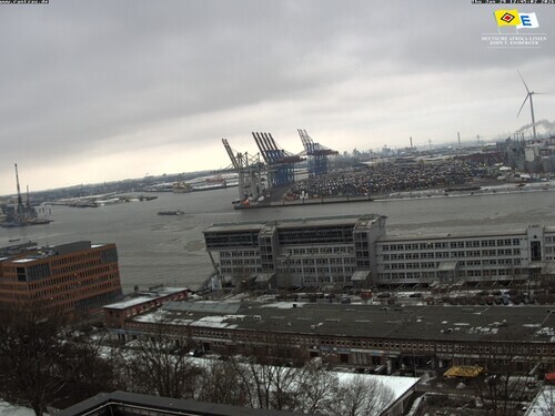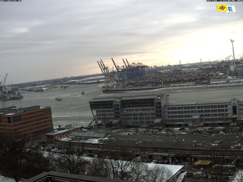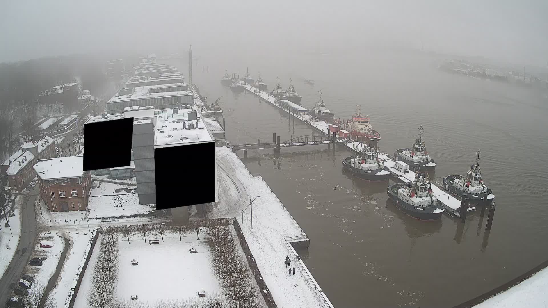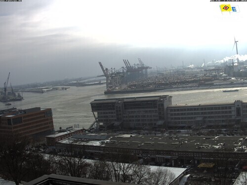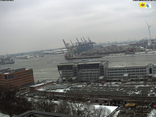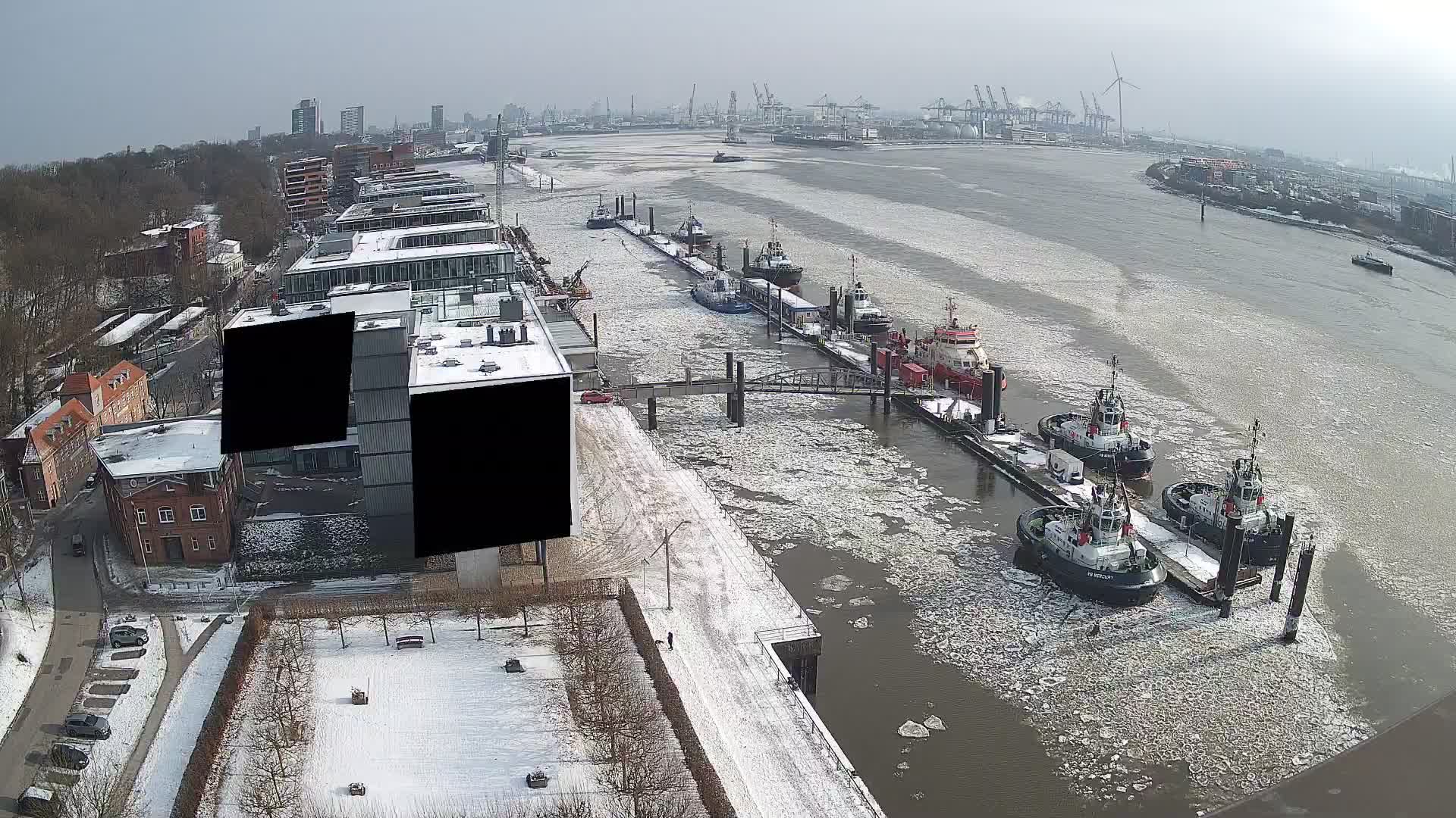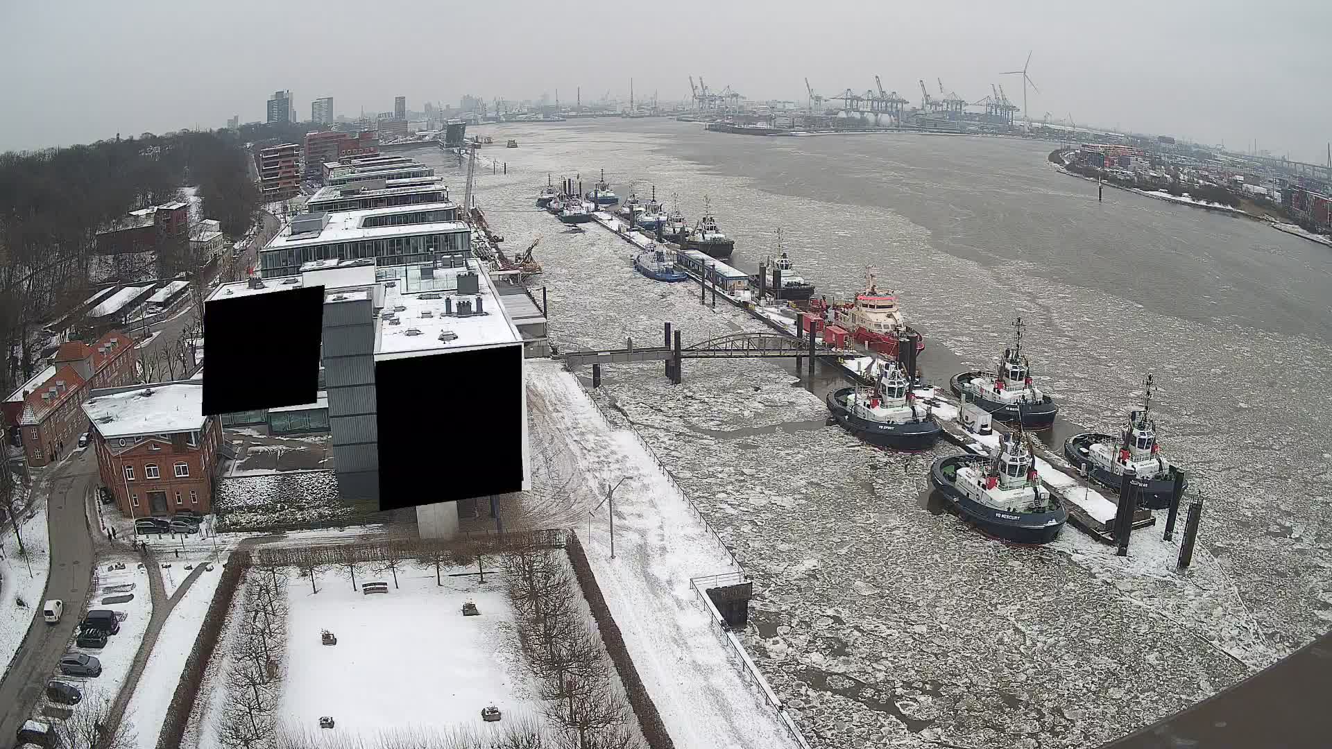 Hamburg, Deutschland - 26.4 km von Alveslohe: Hamburg Övelgönne Richtung Osten - Die Webcam Richtung Osten zeigt vom Augustinum die eigentlichen Hafeneinfahrten. Hier werden alle 'Riesen-Pötte', die nicht schon vorher angelegt haben, vorbeifahren, um zu ihrem Dock zu fahren. Eine Reihe von Schleppern steht für Andockmanöver bereit.
