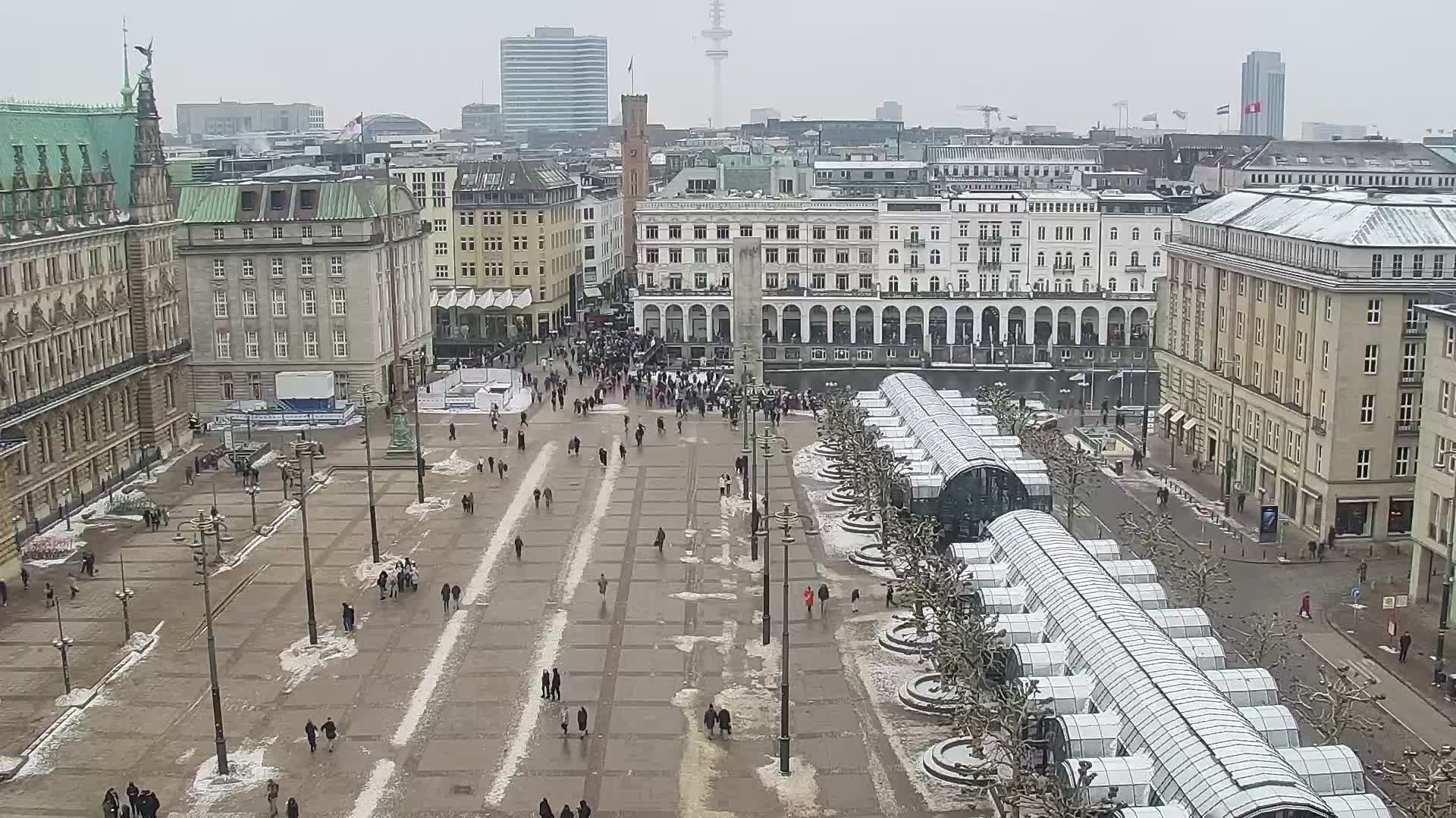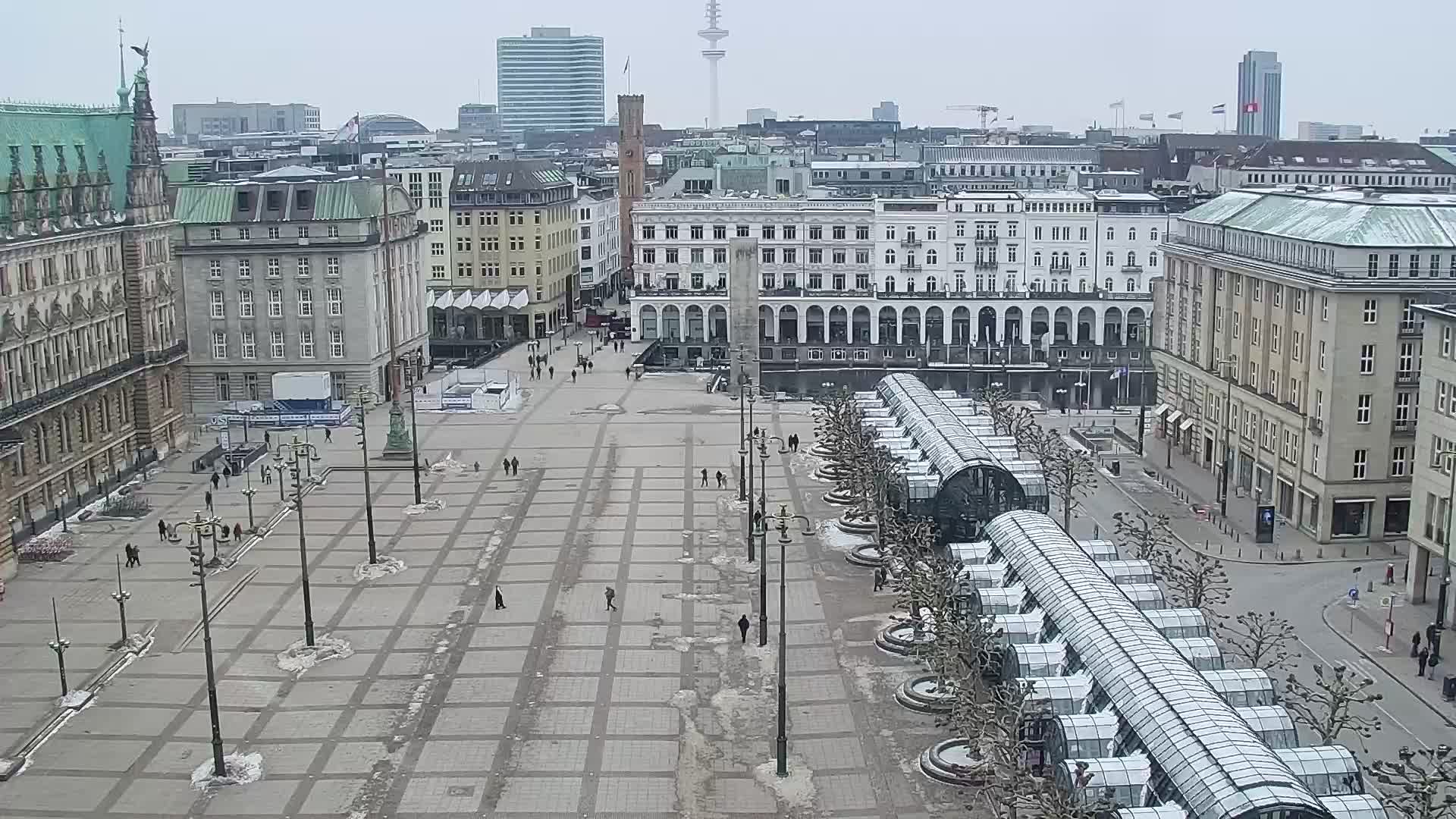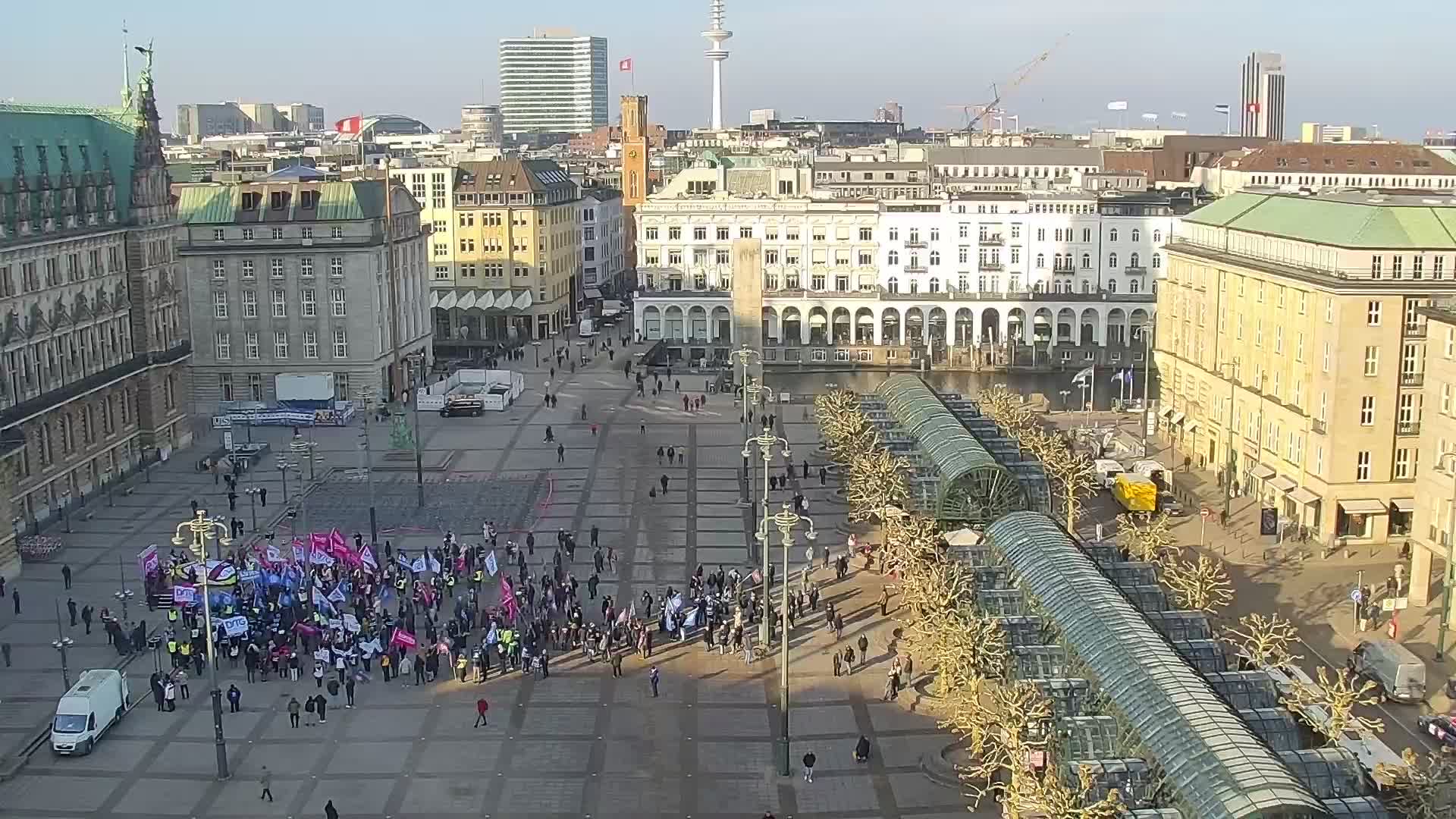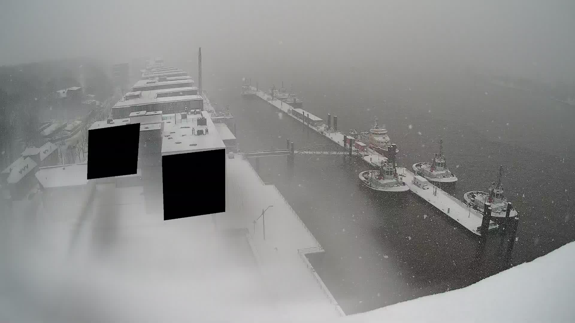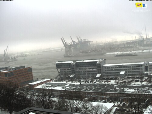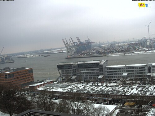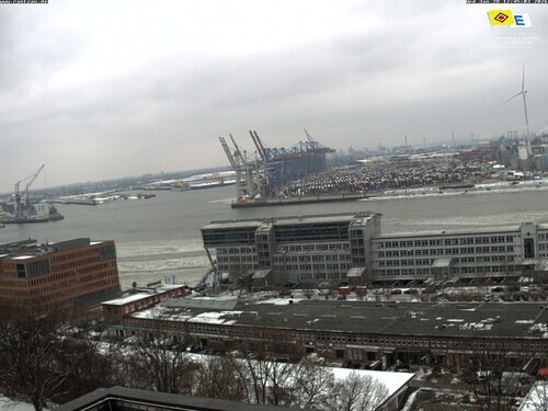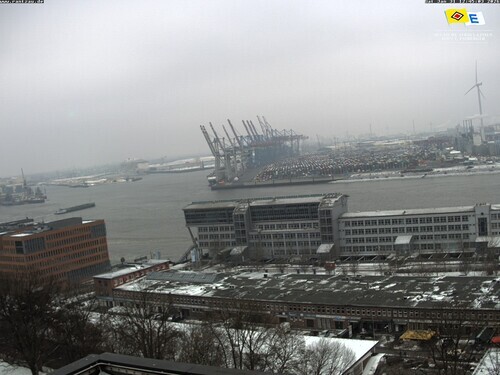 Hamburg, Deutschland - 26.4 km von Alveslohe: Hamburg Övelgönne Richtung Osten - Die Webcam Richtung Osten zeigt vom Augustinum die eigentlichen Hafeneinfahrten. Hier werden alle 'Riesen-Pötte', die nicht schon vorher angelegt haben, vorbeifahren, um zu ihrem Dock zu fahren. Eine Reihe von Schleppern steht für Andockmanöver bereit.