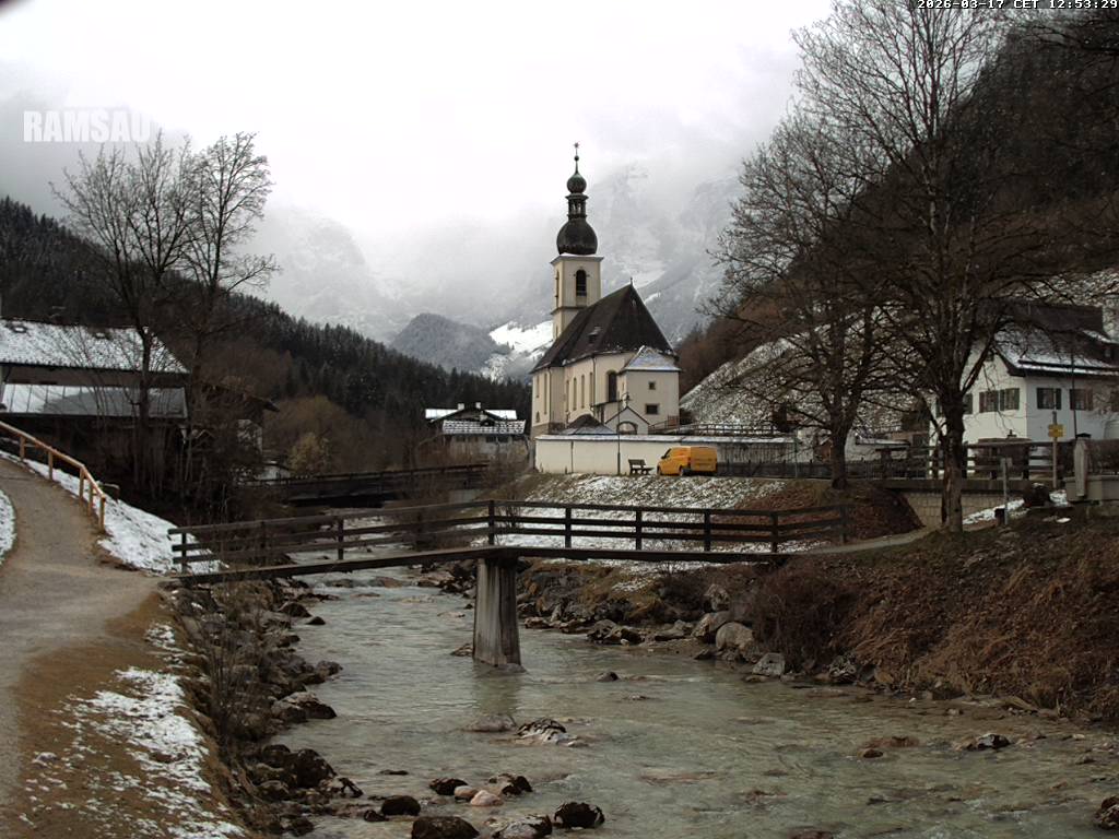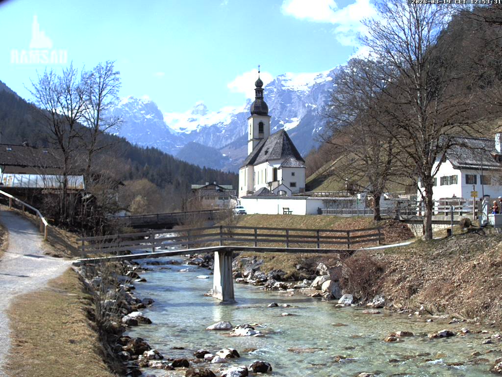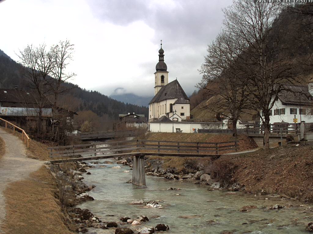 Ramsau bei Berchtesgaden, Deutschland - 2.7 km von Antenbichl: Malerwinkl - Zentrale Webcam in der Ortsmitte von Ramsau bei Berchtesgaden, der Nationalparkgemeinde im Berchtesgadener Land. Aufgestellt am 'Malerwinkl' mit Blick auf die Ramsauer Ortskirche.