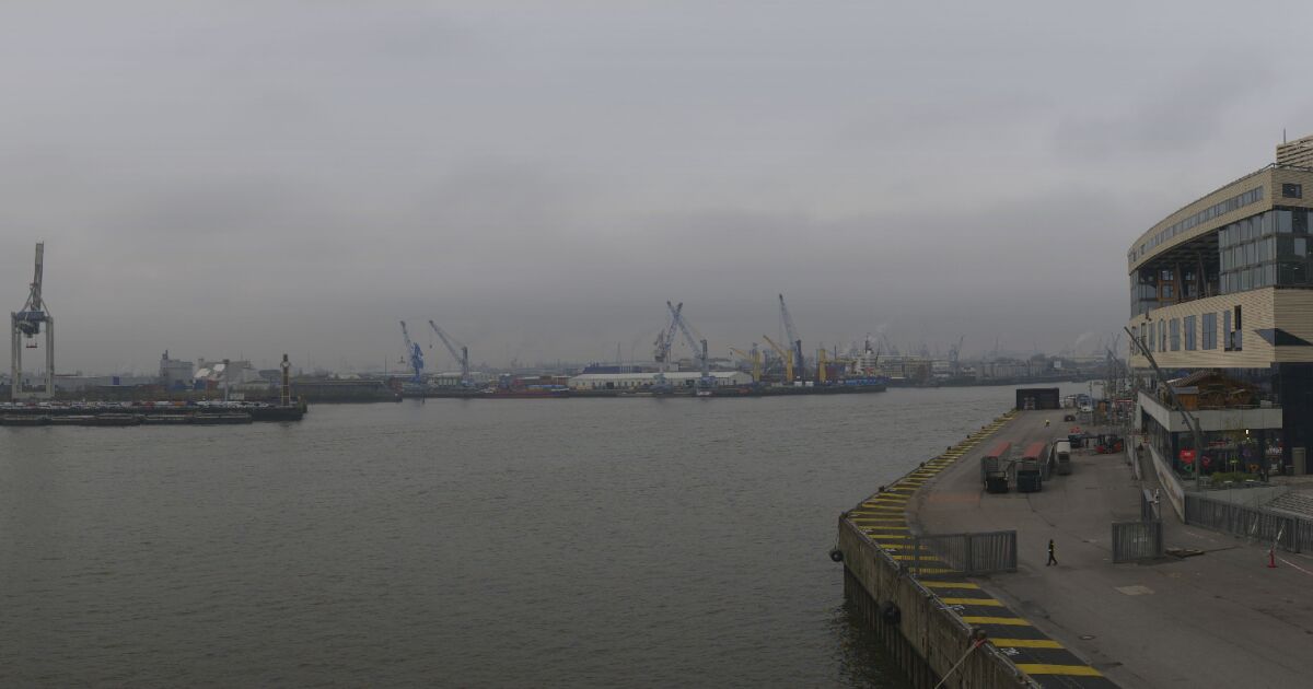 Wedel, Deutschland - 17.6 km von Apensen: Willkommhöft: Blick nach Süden - Die Webcam Wedel Willkomm-Höft - Süden ist auf dem Fahnenmast der Schiffsbegrüßungsanlage 'Willkomm-Höft' montiert. Die Einstellung Richtung Süden zeigt den Anleger für die Helgoland-Fähre und die Lautsprecher-Konstruktion der Schiffsbegrüßungsanlage.