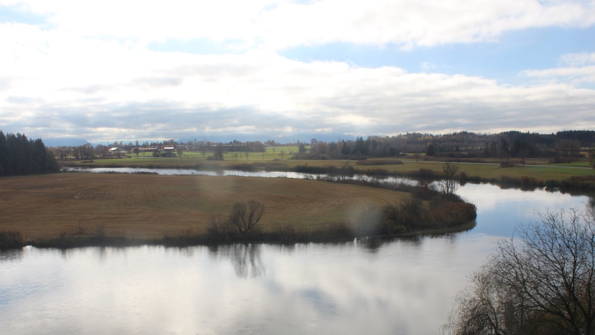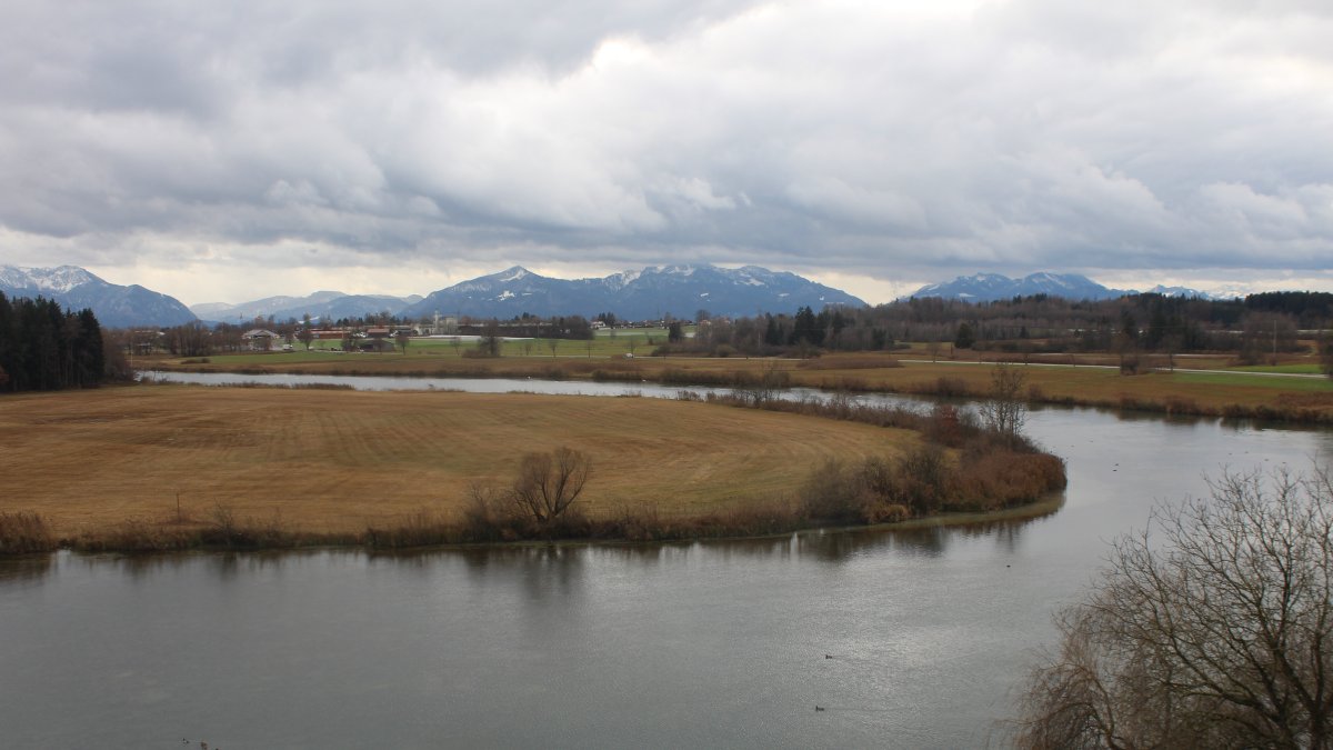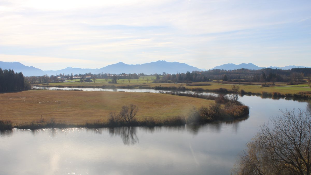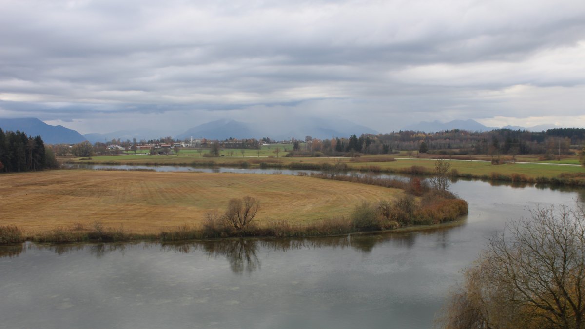 Altenmarkt a. d. Alz, Deutschland - 15.1 km von Aufham: Auberg-CAM - Blick über das südostbayrische Voralpenland (rechts auf dem Berg - Stiftskirche Baumburg).
