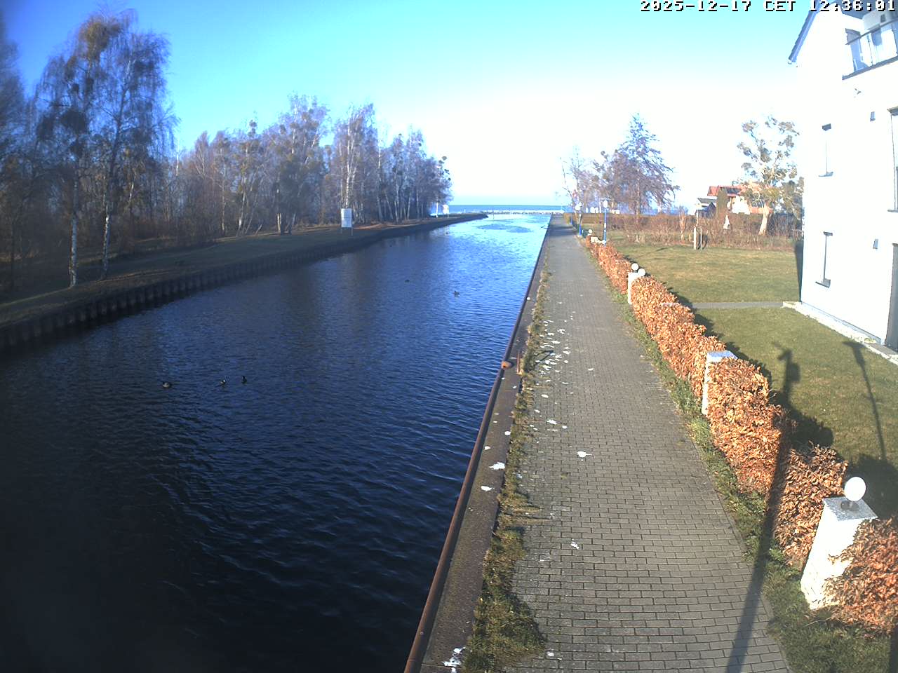 Rechlin, Deutschland - 85.2 km von Aulosen: Webcam Hafendorf Müritz - Mit dieser Webcam sehen Sie die Ausfahrt aus der Marina Müritz. Der sogenannte Stichkanal ist etwa 180 Meter lang und verbindet den Claassee mit der Müritz.