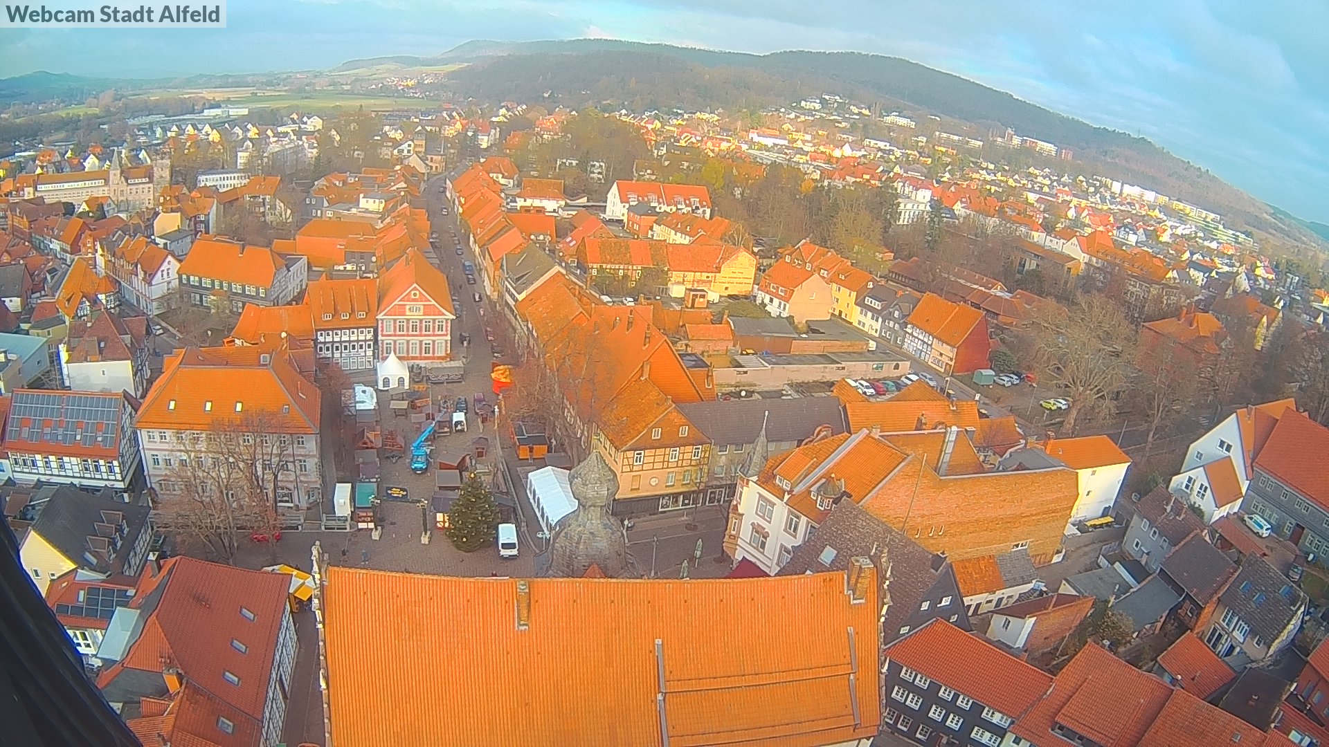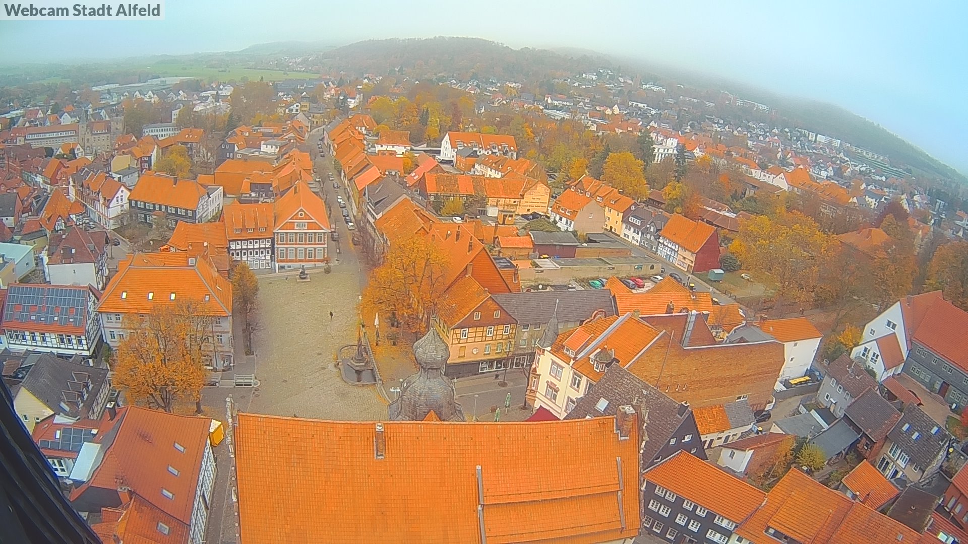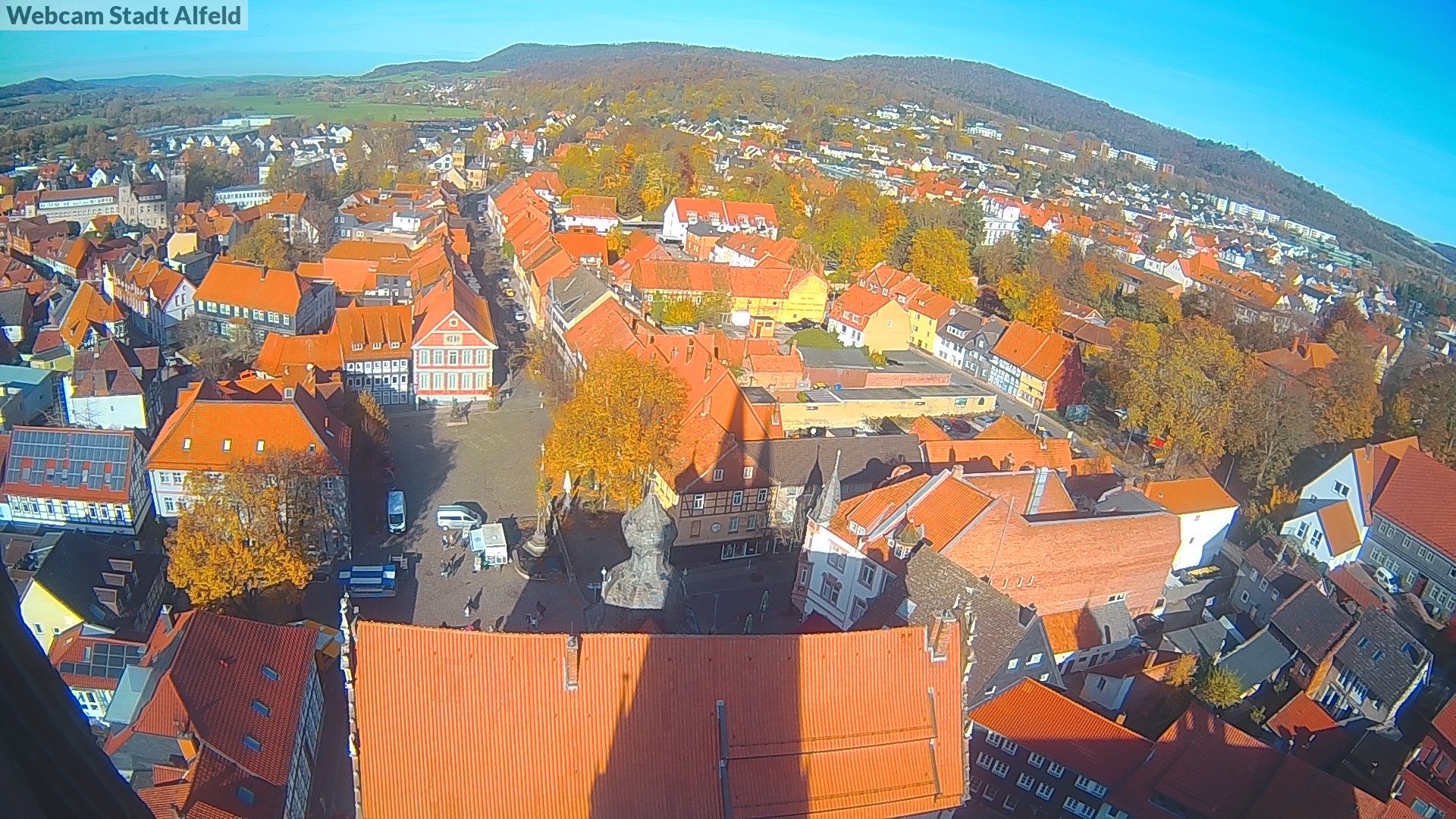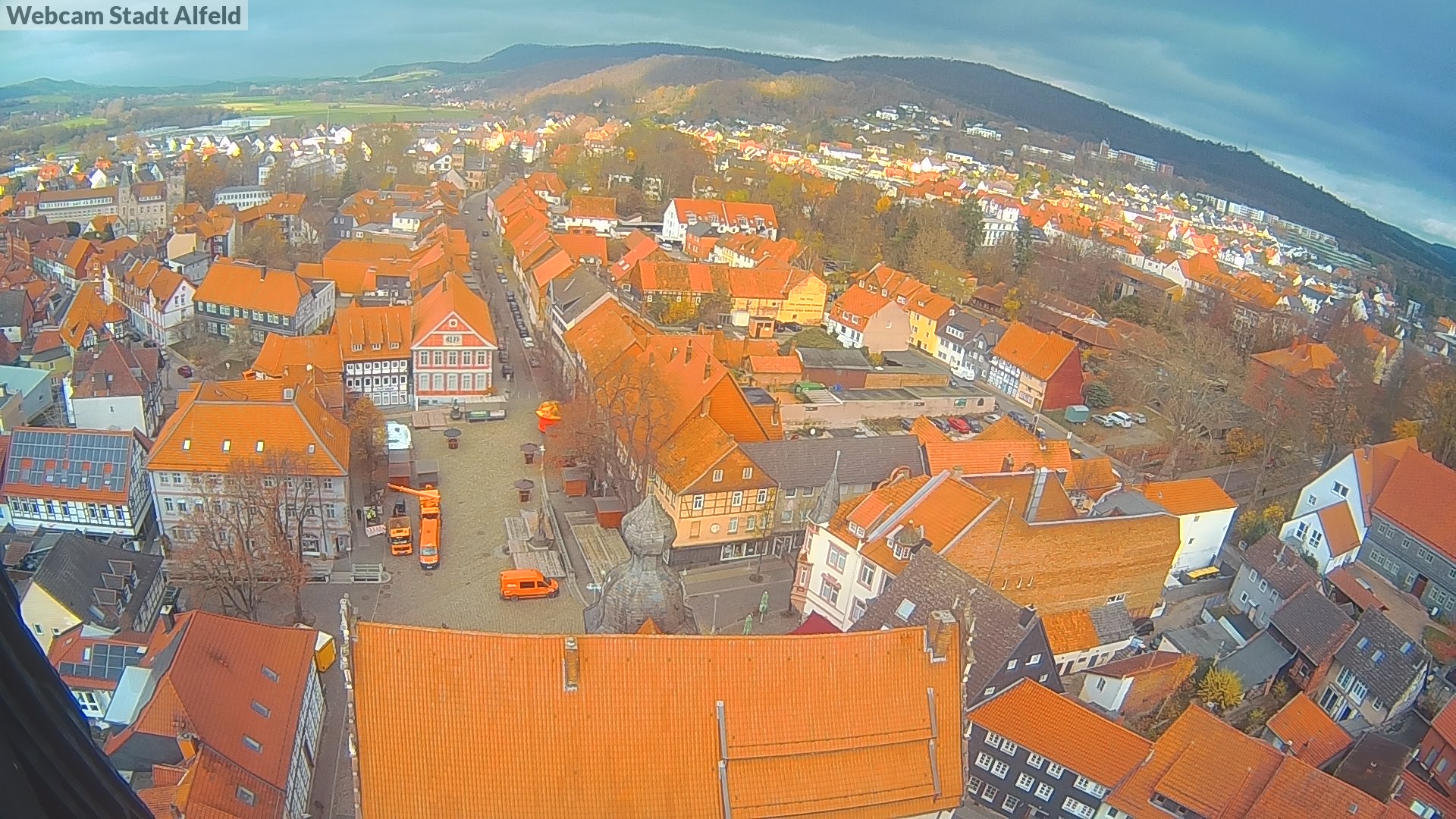 Osterode am Harz, Deutschland - 35 km von Avendshausen: Kornmarkt Osterode - Blick vom Marktkirchturm auf die Fußgängerzone mit dem Kornmarkt in Osterode.