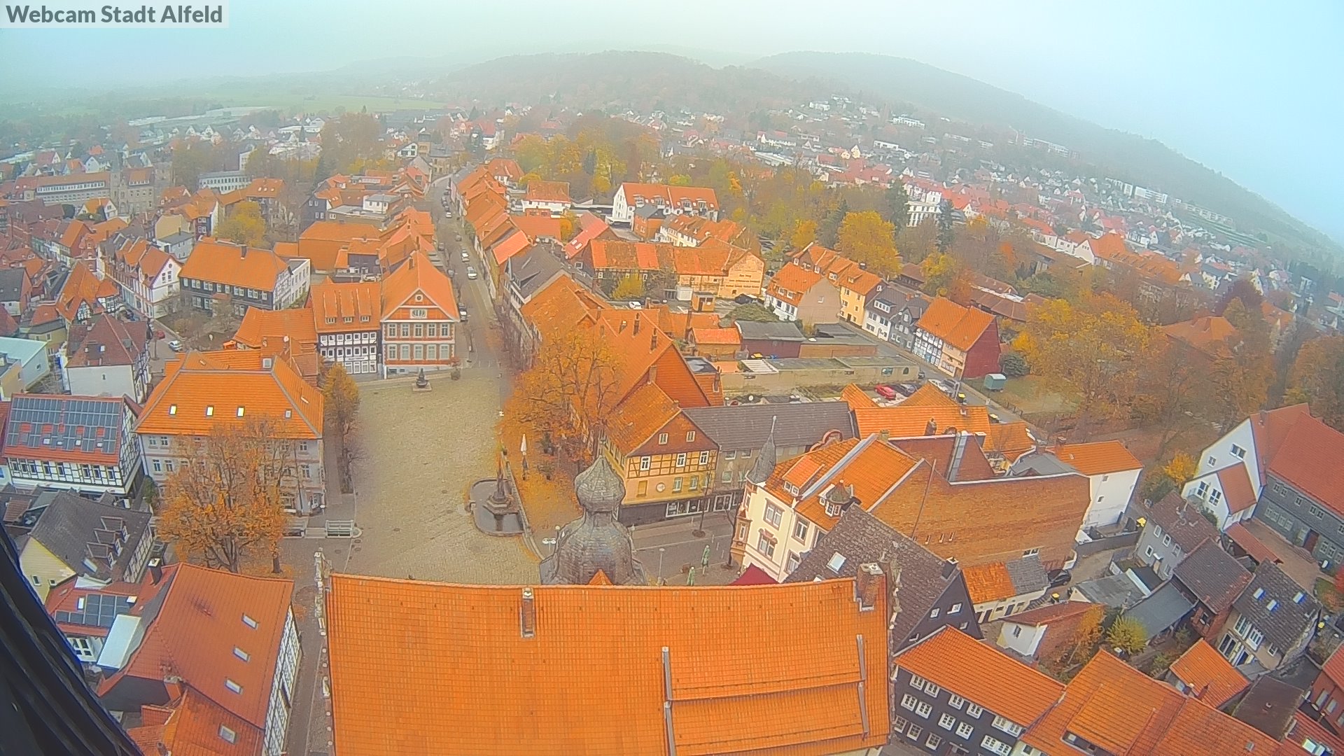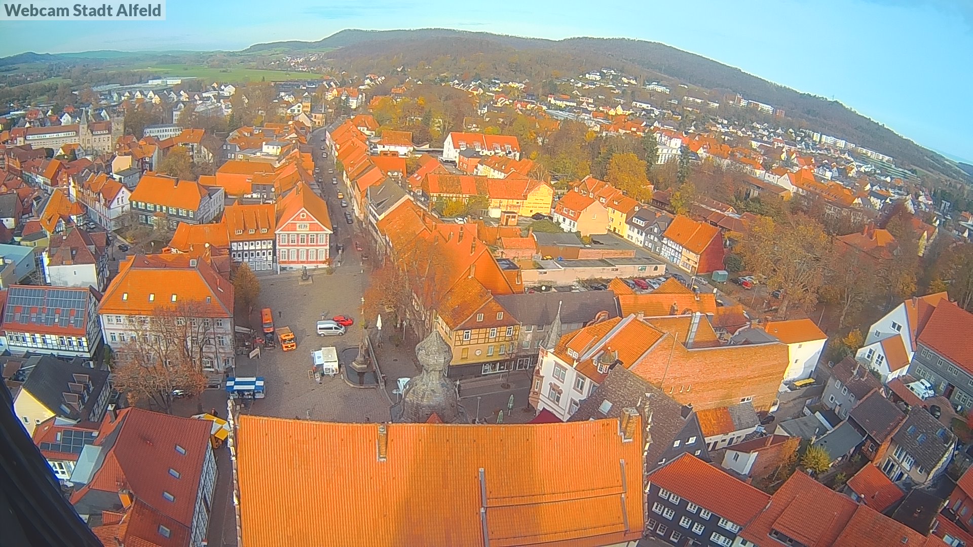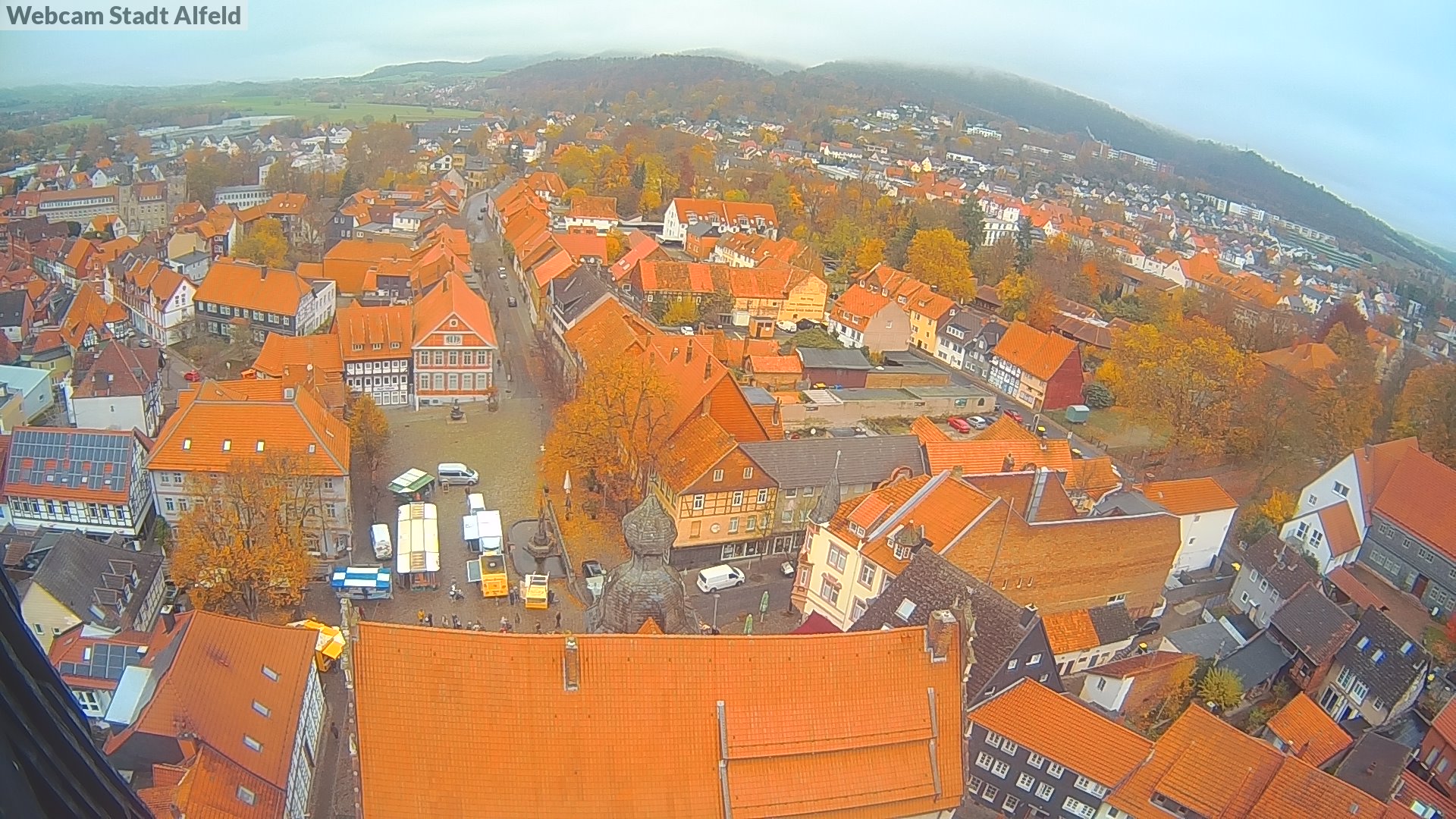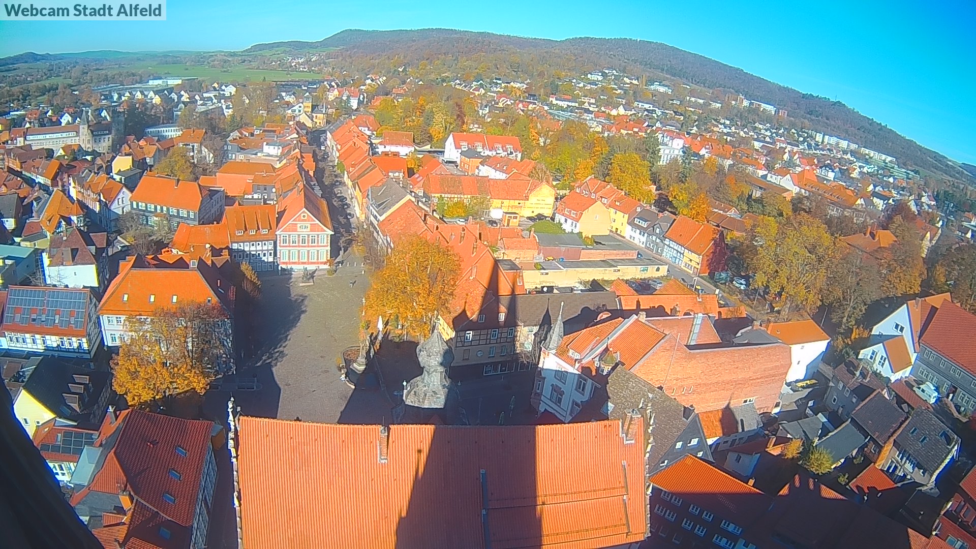 Osterode am Harz, Deutschland - 35 km von Avendshausen: Kornmarkt Osterode - Blick vom Marktkirchturm auf die Fußgängerzone mit dem Kornmarkt in Osterode.