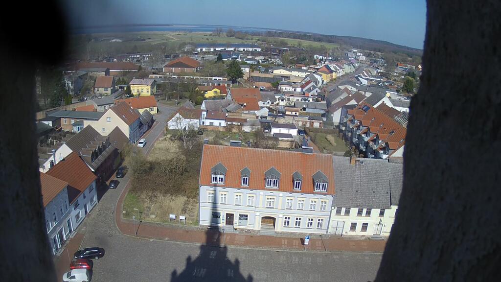 Usedom, Deutschland - 75.8 km von Casekow: Usedomer See - Die Webcam befindet sich in der Stadt Usedom. Angebracht ist sie in Höhe des Uhrwerkes der Marienkirche. Die Blickrichtung ist über den Dächern Usedoms hinweg in Richtung Usedomer See.