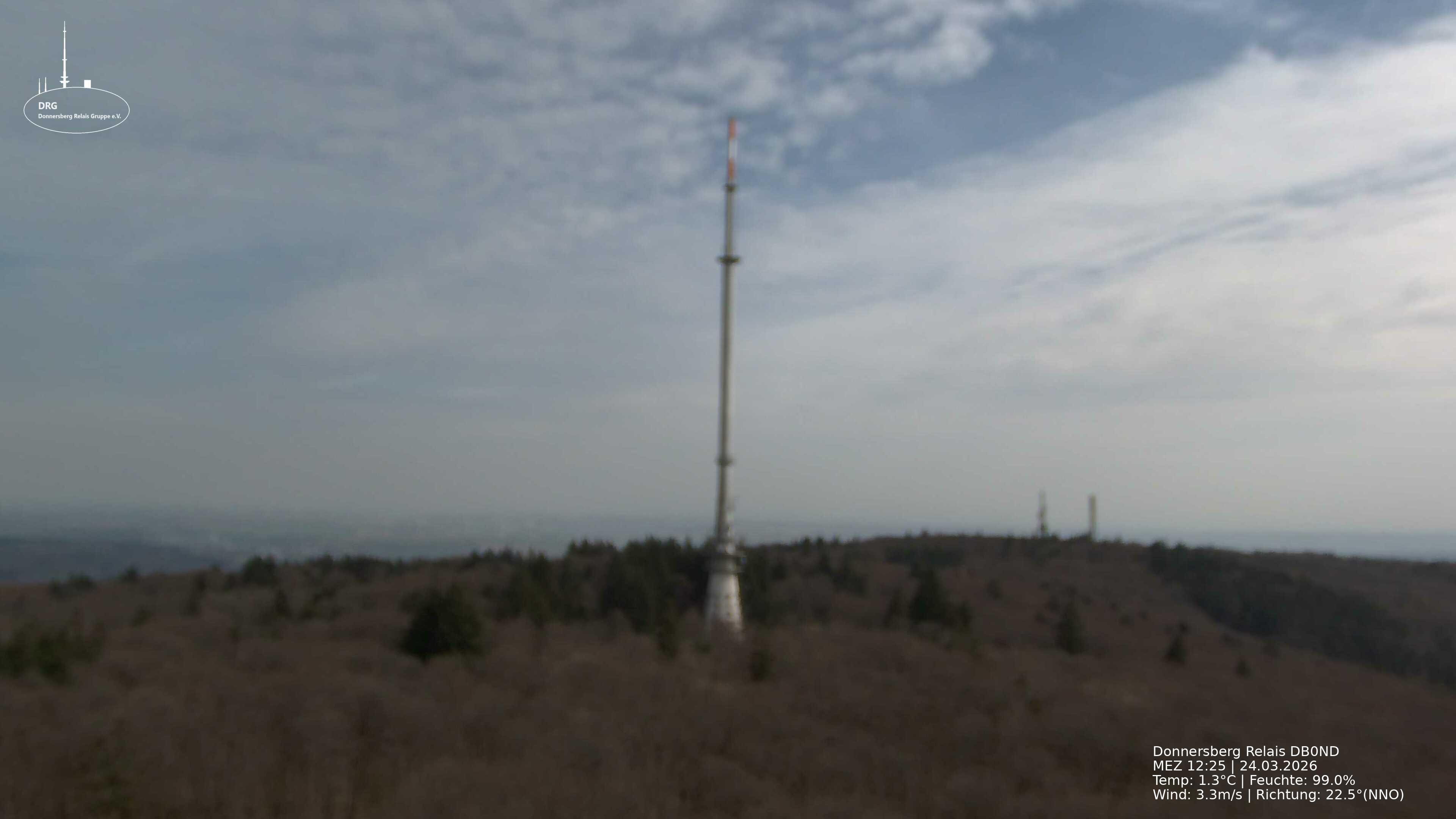 Donnersberg, Deutschland - 19.6 km von Diemerstein: Blick vom Donnersberg - Die Webcam befindet sich auf dem Mast in 730m Höhe, zeigt nach SO und das Bild wird alle 10min aktualisiert. In der Bildmitte zeigt sich normalerweise der SWR-Sendeturm - wenn nichts zu sehen ist, dann ist der Mast in Nebel oder Wolken gehüllt.
