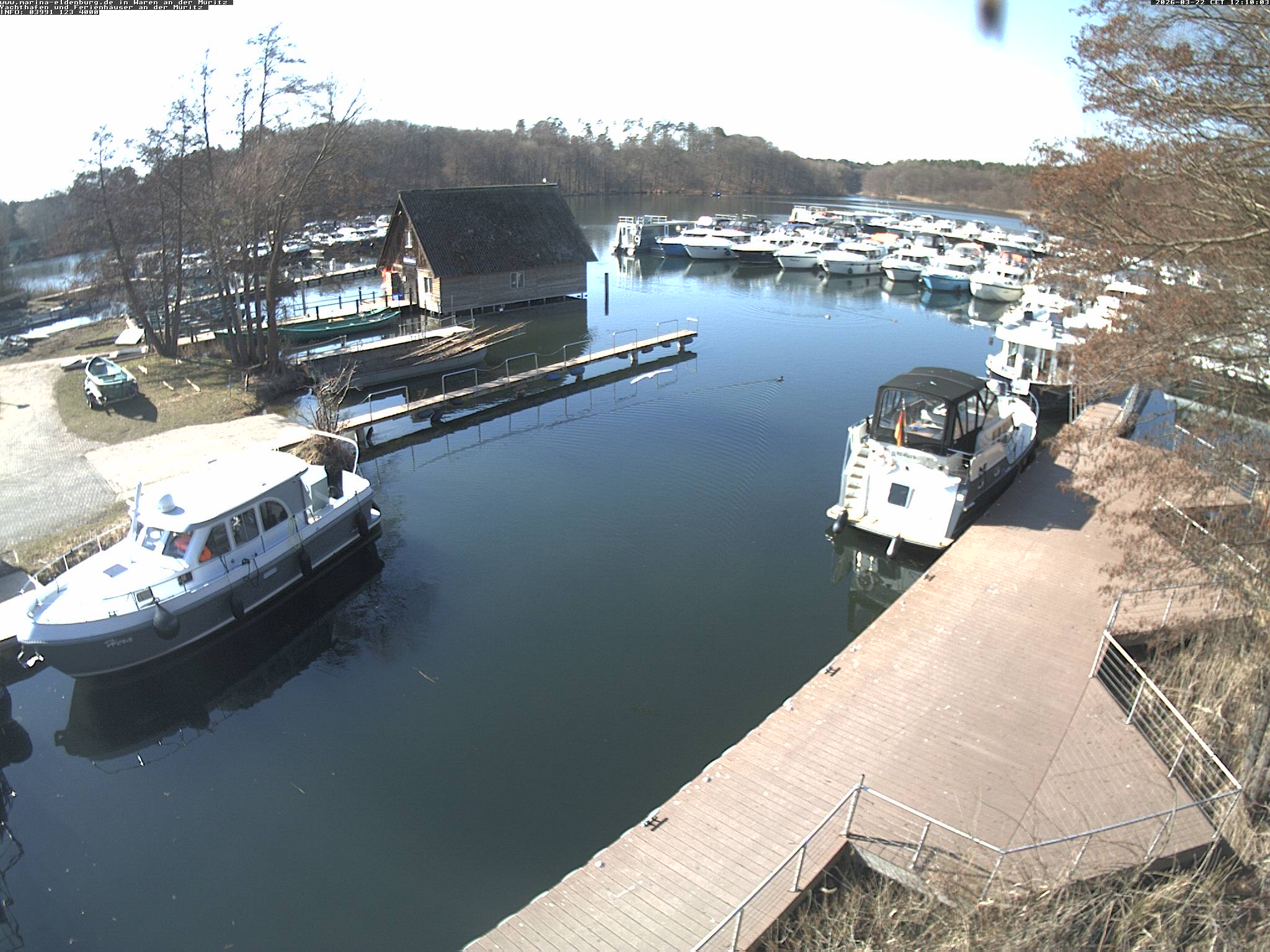 Eldenburg, Deutschland - 34.5 km von Dranse: Marina Eldenburg - Die Webcam zeigt die Marina Eldenburg mit Ferienhäusern und Liegeplätzen am Tor zur Müritz. Müritz Elde Wasserstrasse km 148.