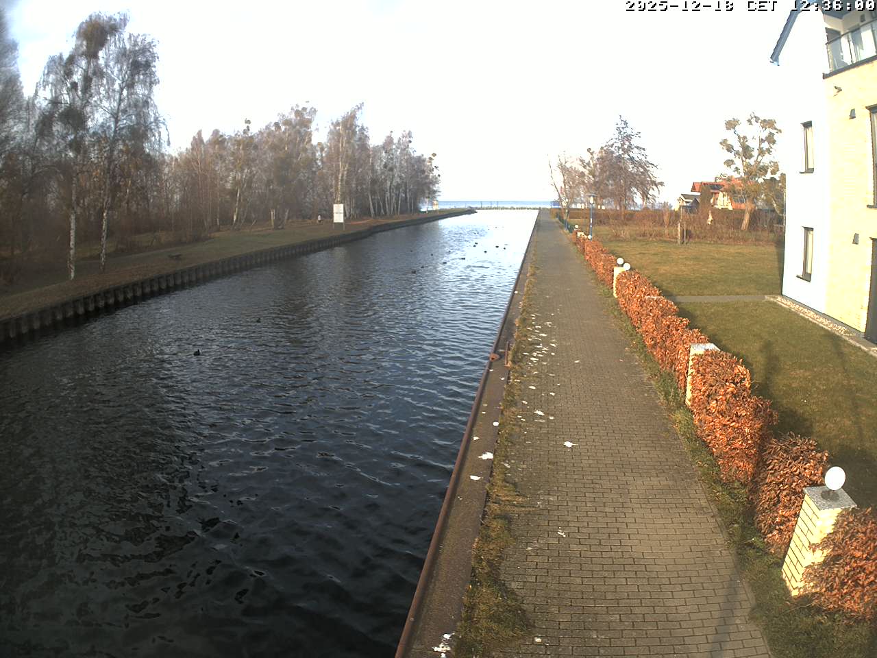 Rechlin, Deutschland - 38.8 km von Himmelpfort: Webcam Hafendorf Müritz - Mit dieser Webcam sehen Sie die Ausfahrt aus der Marina Müritz. Der sogenannte Stichkanal ist etwa 180 Meter lang und verbindet den Claassee mit der Müritz.