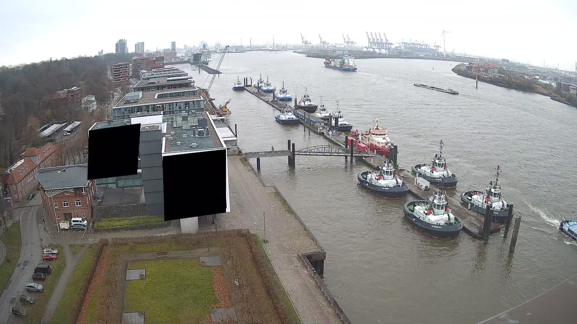 Hamburg, Deutschland - 23.7 km von Klein Hansdorf: Hamburg Övelgönne Richtung Osten - Die Webcam Richtung Osten zeigt vom Augustinum die eigentlichen Hafeneinfahrten. Hier werden alle 'Riesen-Pötte', die nicht schon vorher angelegt haben, vorbeifahren, um zu ihrem Dock zu fahren. Eine Reihe von Schleppern steht für Andockmanöver bereit.