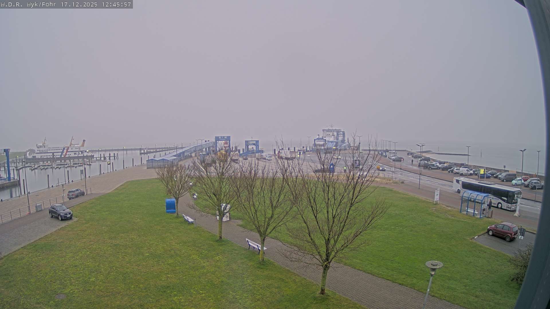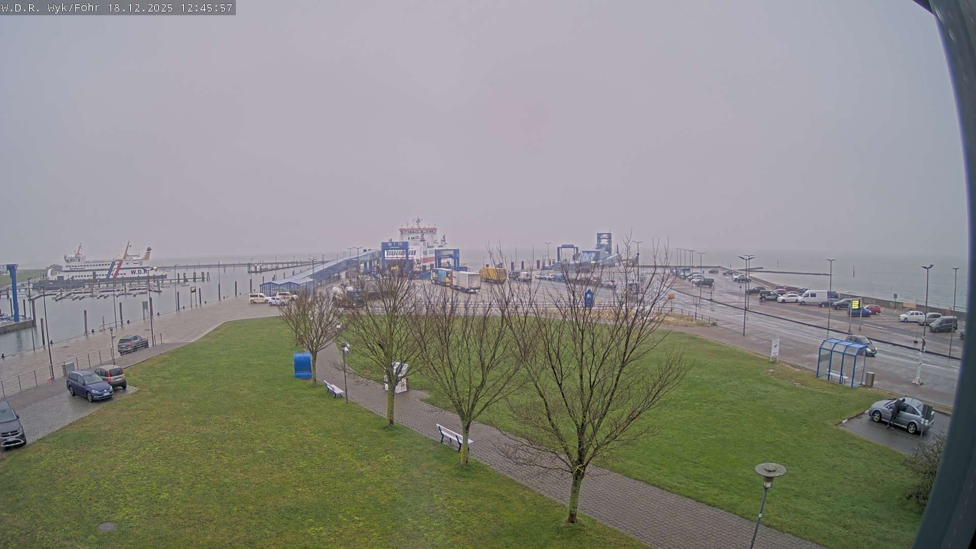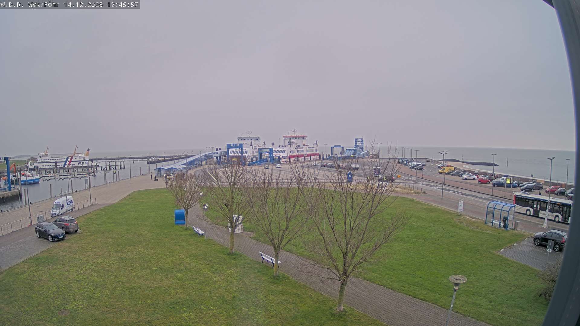 Dagebüll, Deutschland - 16.2 km von Lund: Dagebüll Hafen - Blick in Richtung Westen auf die Verladung des Fährverkehrs zu den Inseln Föhr und Amrum, links im Bild der Bahnsteig, Fahrzeugaufstellspuren, Wartegbäude 'Tor zu den Inseln'.