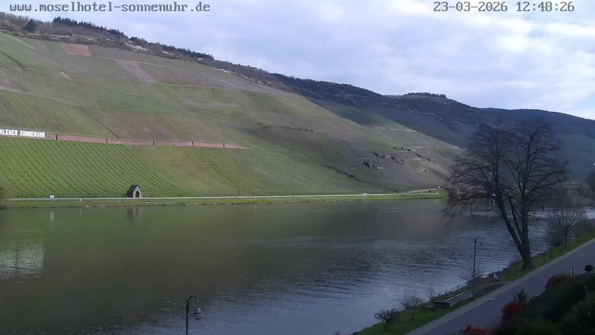 Bernkastel-Wehlen, Deutschland - 35.7 km von Newel: Mosel Cam - Die HD Live Webcam befindet am Moselhotel Sonnenuhr in Bernkastel-Wehlen direkt am Moselufer. Zu erkennen sind die Weinberge, der Mosel Radweg, der Klettersteig an der Wehlener Sonnenuhr sowie die Staustufe bei Zeltingen-Rachtig. Der Panoramaschwenk führt vom Weinort Zeltingen entlang der Mosel hin zur Wehlener Brücke, danach führt Sie zurück über die weltbekannte Weinlage 'Wehlener Sonnenuhr'.