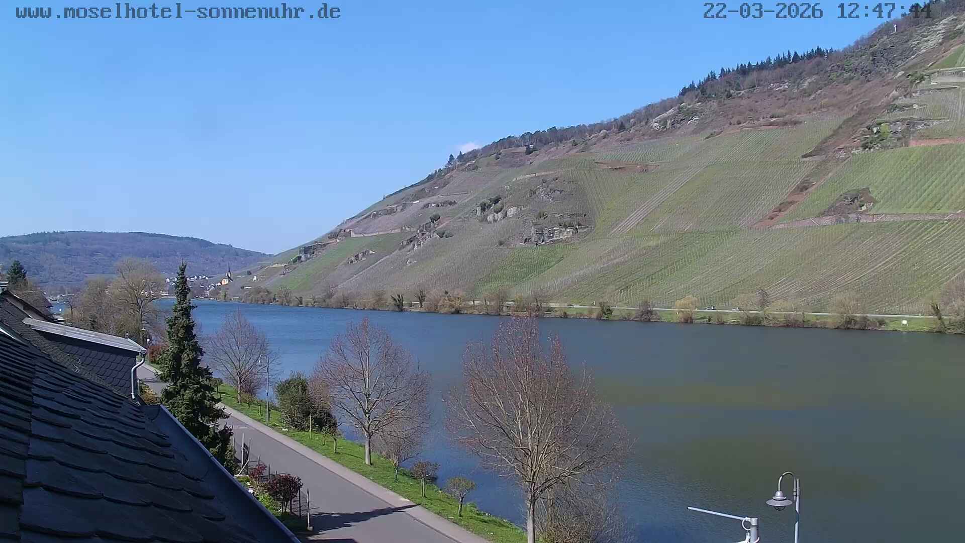 Bernkastel-Wehlen, Deutschland - 46.2 km von Oberbillig: Mosel Cam - Die HD Live Webcam befindet am Moselhotel Sonnenuhr in Bernkastel-Wehlen direkt am Moselufer. Zu erkennen sind die Weinberge, der Mosel Radweg, der Klettersteig an der Wehlener Sonnenuhr sowie die Staustufe bei Zeltingen-Rachtig. Der Panoramaschwenk führt vom Weinort Zeltingen entlang der Mosel hin zur Wehlener Brücke, danach führt Sie zurück über die weltbekannte Weinlage 'Wehlener Sonnenuhr'.