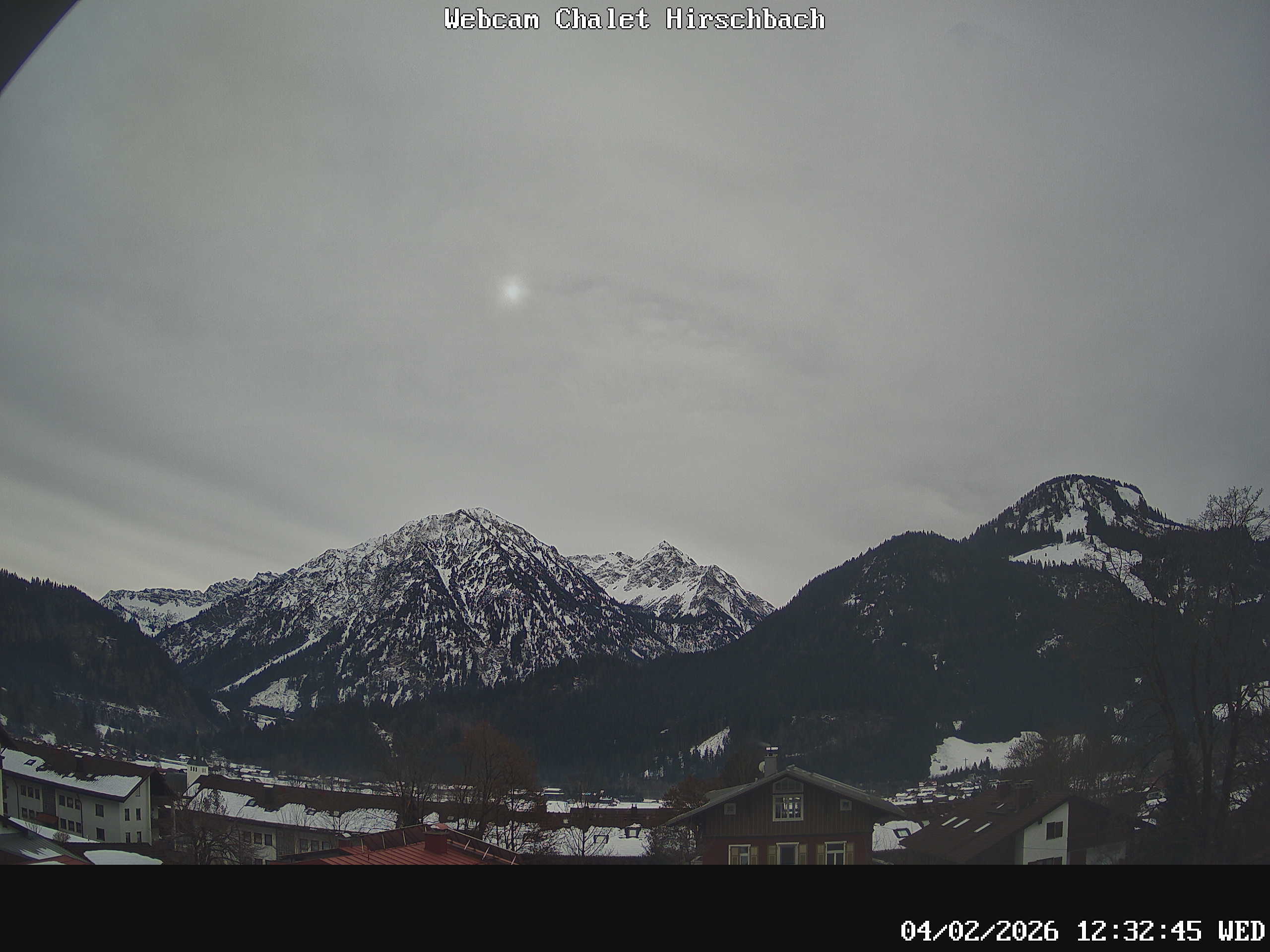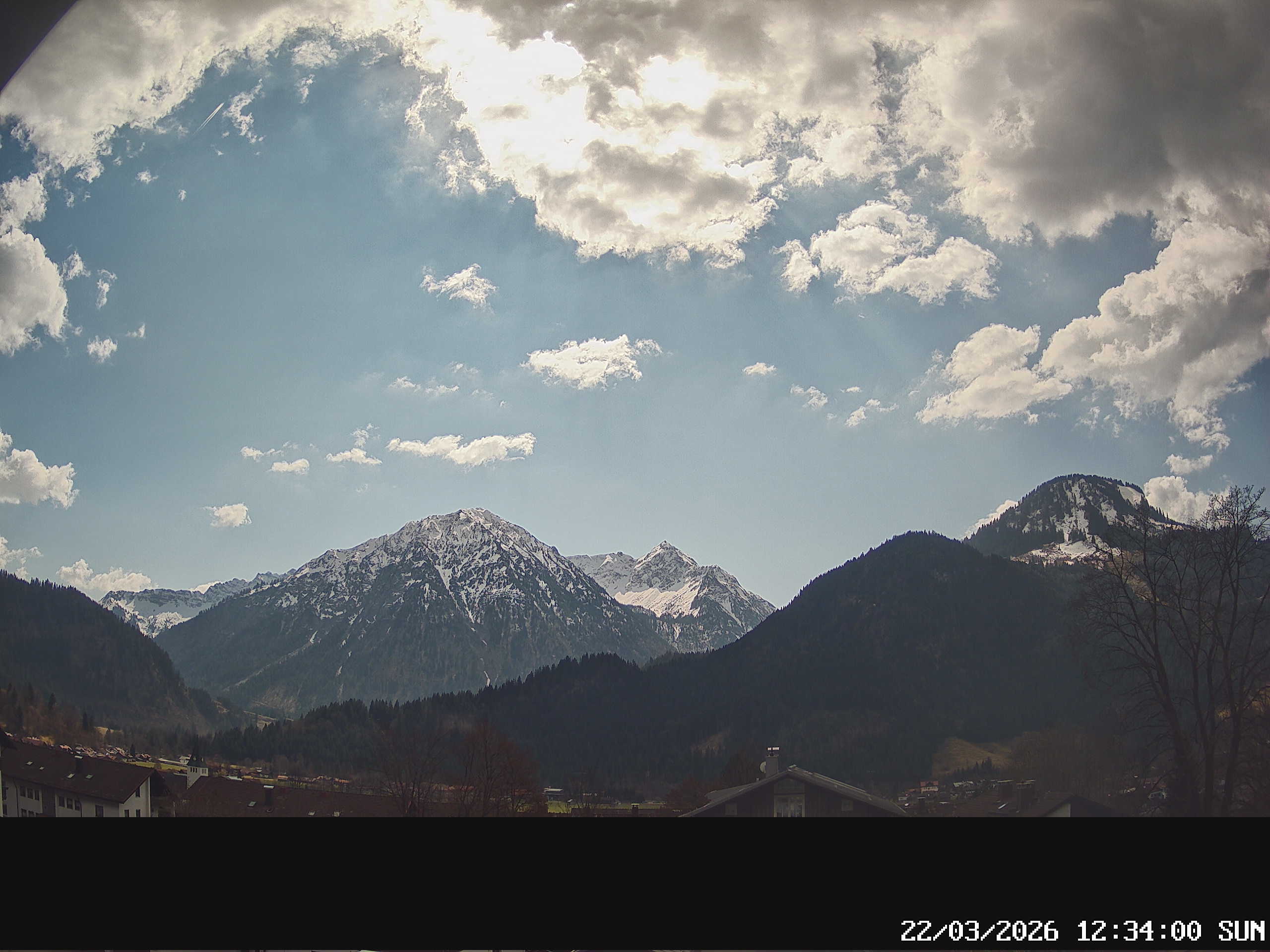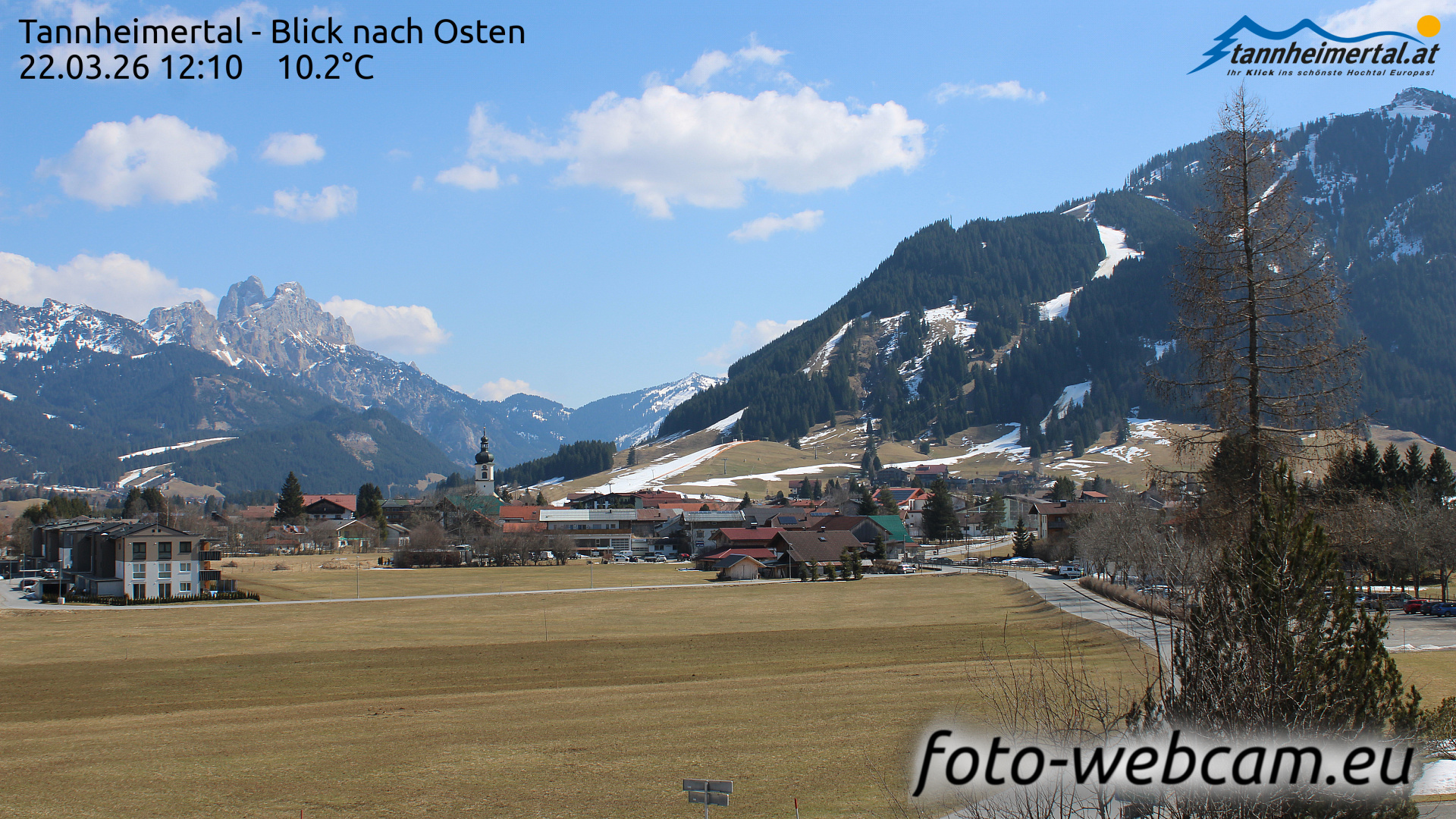 Tannheim, Österreich - 8.9 km von Oberjoch: Webcam Tannheimertal Blick Richtung Osten - Gimpel (2.176 m) Rote Flüh (2.111 m) Im Vordergrund Tannheim (1.100m) Neunerköpfle (1.862m)