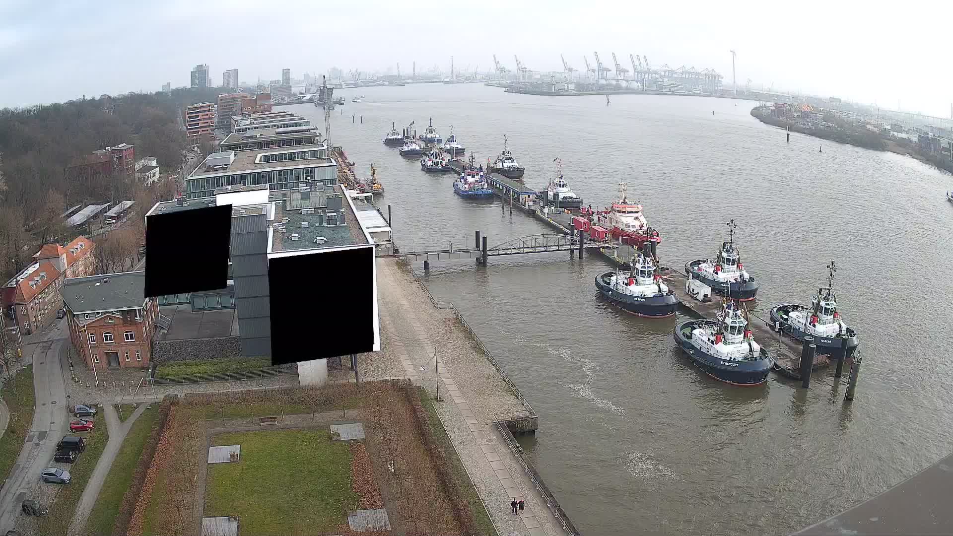 Hamburg, Deutschland - 4.6 km von Peute: Hamburg Övelgönne Richtung Osten - Die Webcam Richtung Osten zeigt vom Augustinum die eigentlichen Hafeneinfahrten. Hier werden alle 'Riesen-Pötte', die nicht schon vorher angelegt haben, vorbeifahren, um zu ihrem Dock zu fahren. Eine Reihe von Schleppern steht für Andockmanöver bereit.