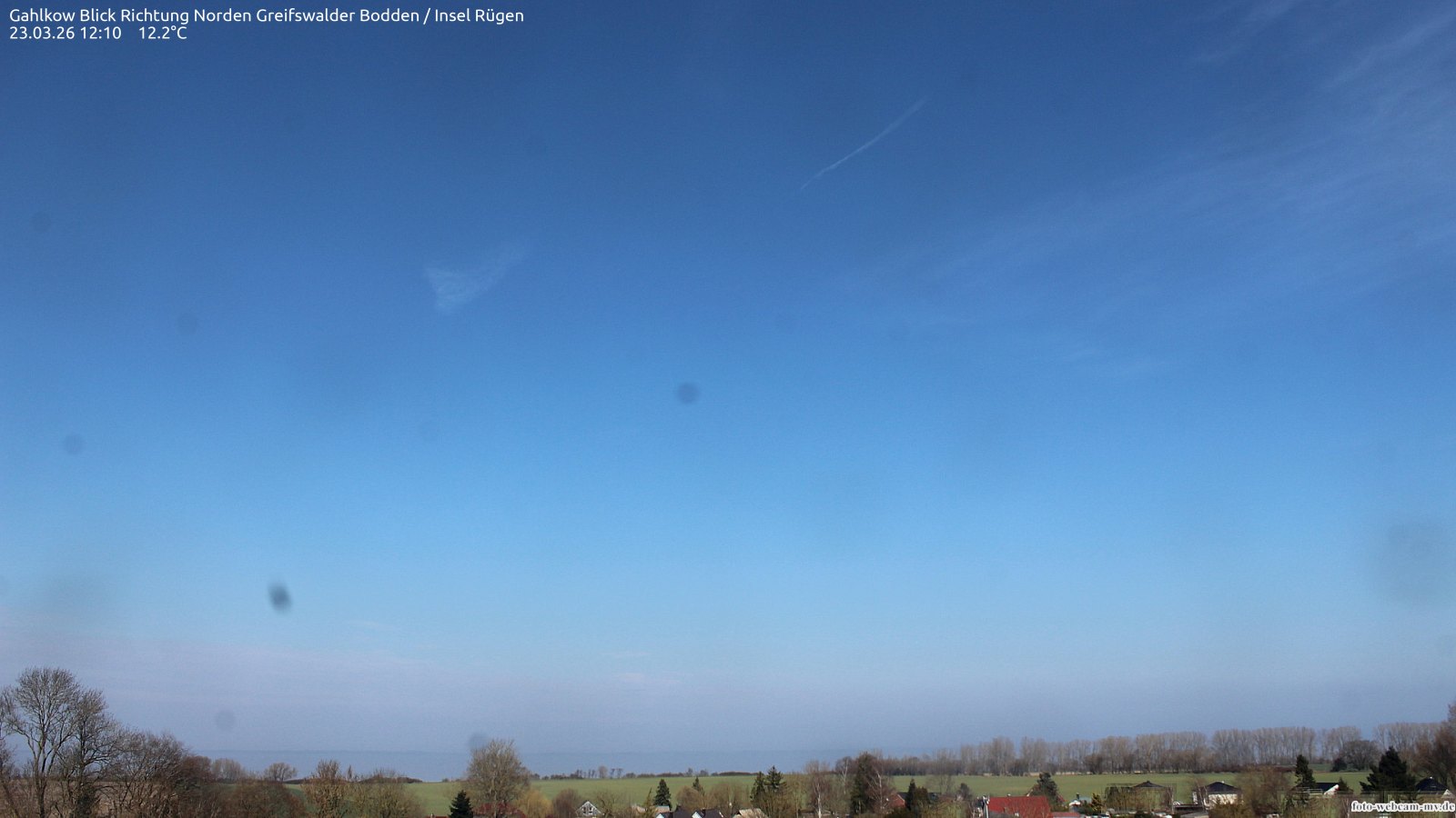 Usedom, Deutschland - 29.2 km von Rubenow: Blick Richtung Peenestrom - Die Webcam befindet sich in der Stadt Usedom. Angebracht ist sie in Höhe des Uhrwerkes der Marienkirche. Die Blickrichtung ist über den Dächern Usedoms hinweg in Richtung Peenestrom.