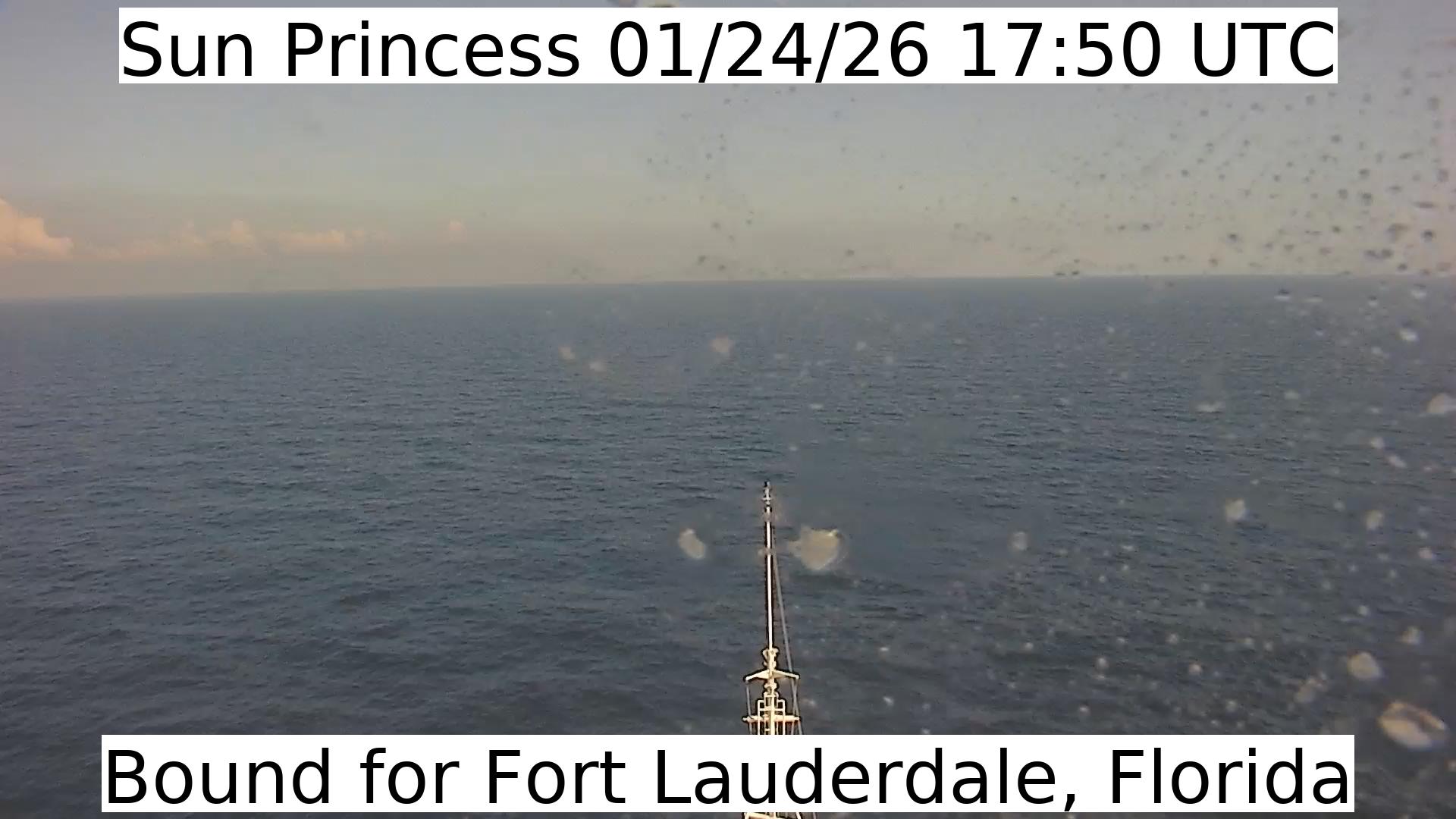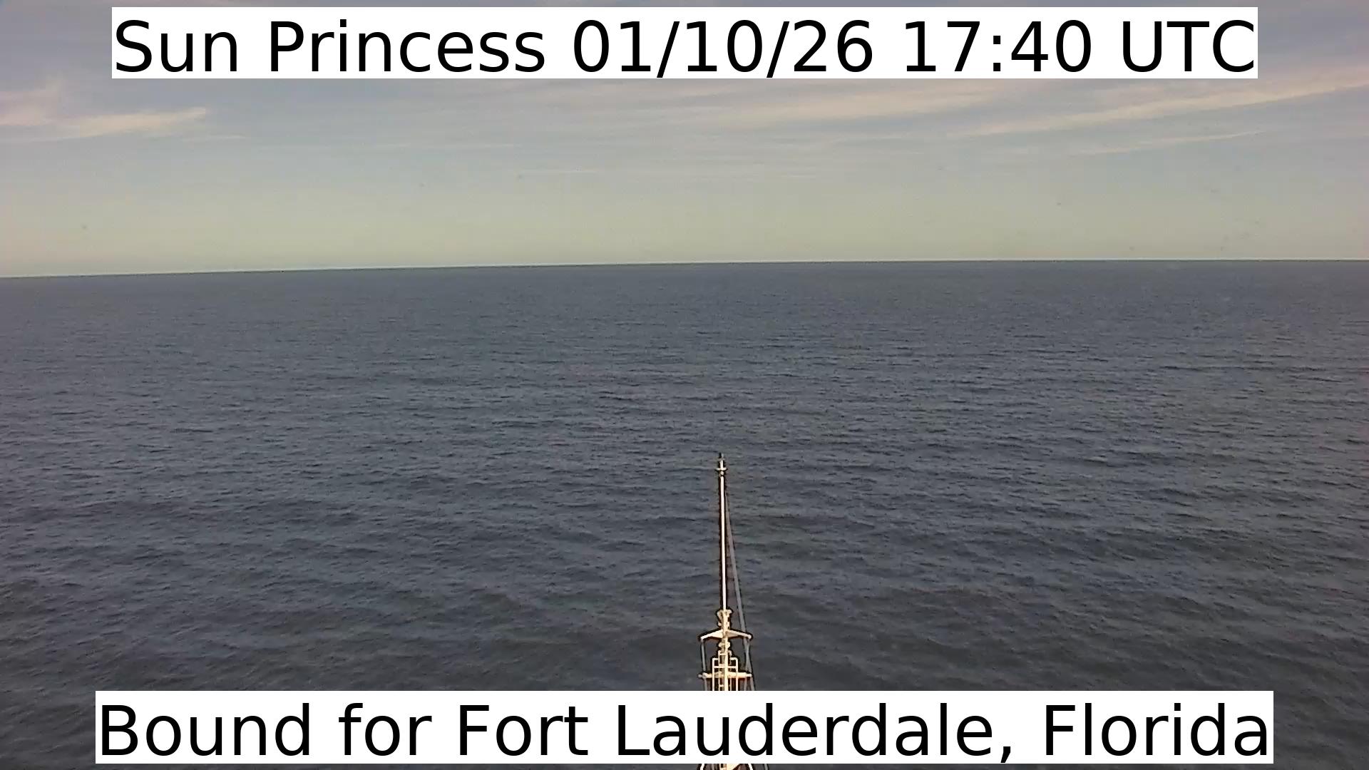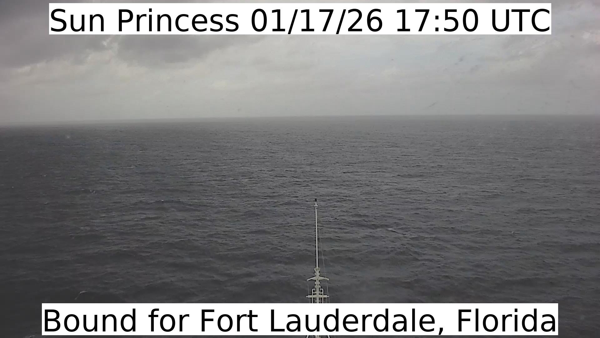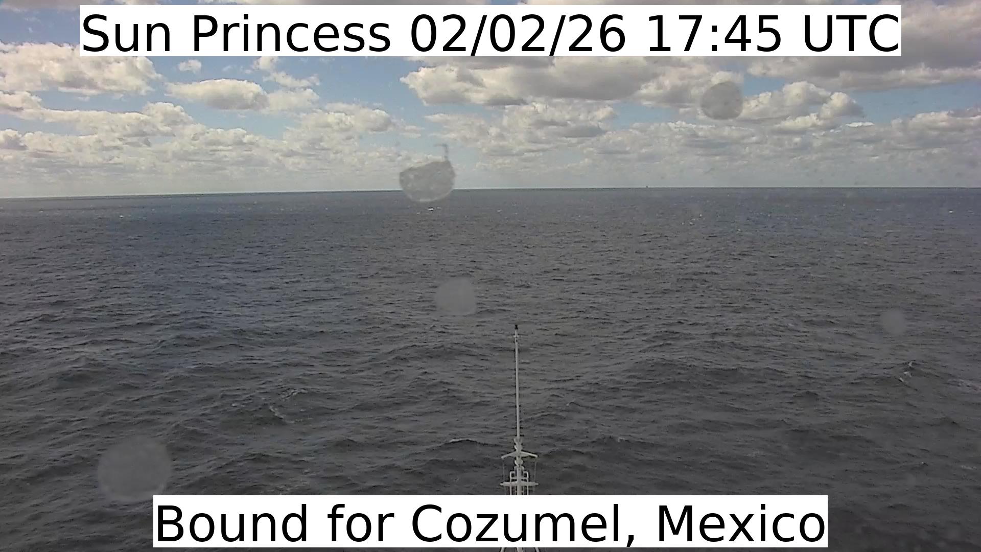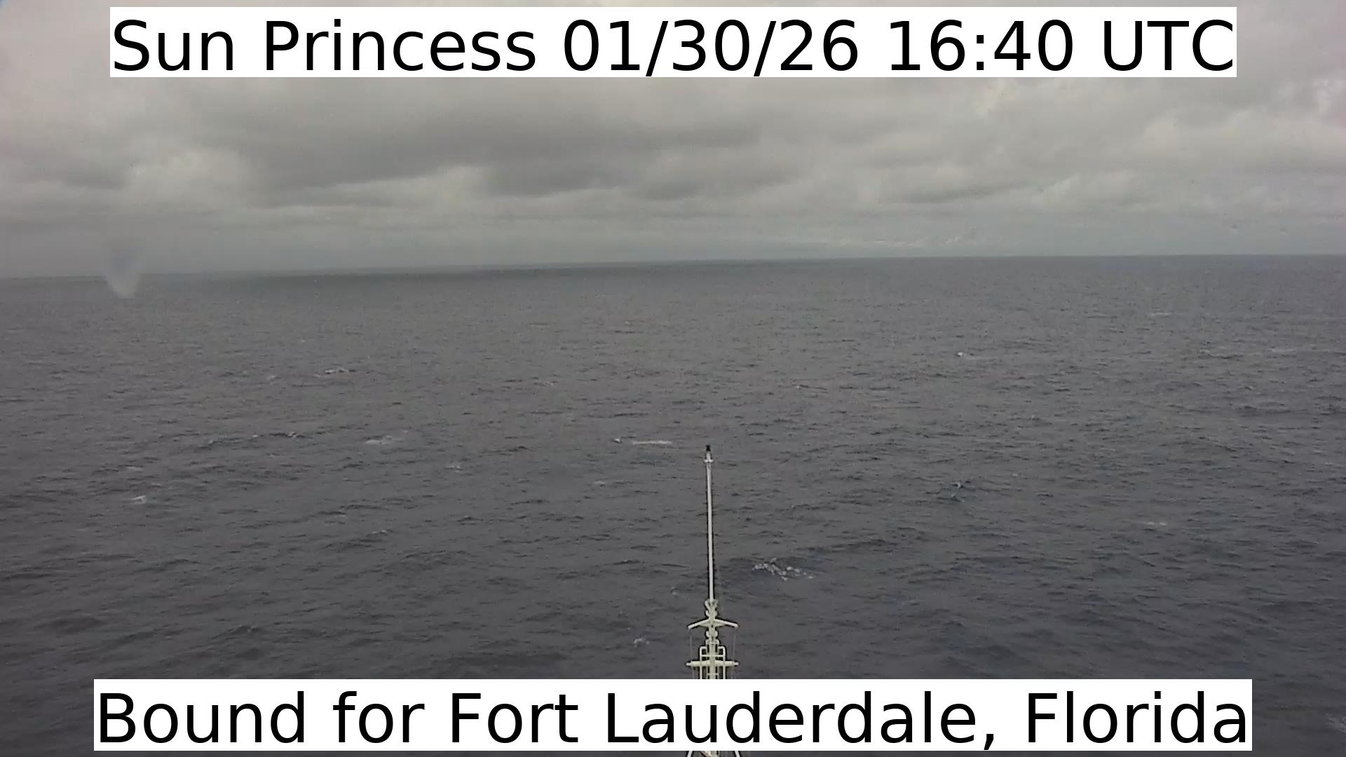 Norwegian Encore, Norwegian Cruise Line - 124.7 km von Atascosa: Live auf See - Werfen Sie einen Blick von der Brücke des Kreuzfahrtschiffes Norwegian Encore auf die See.