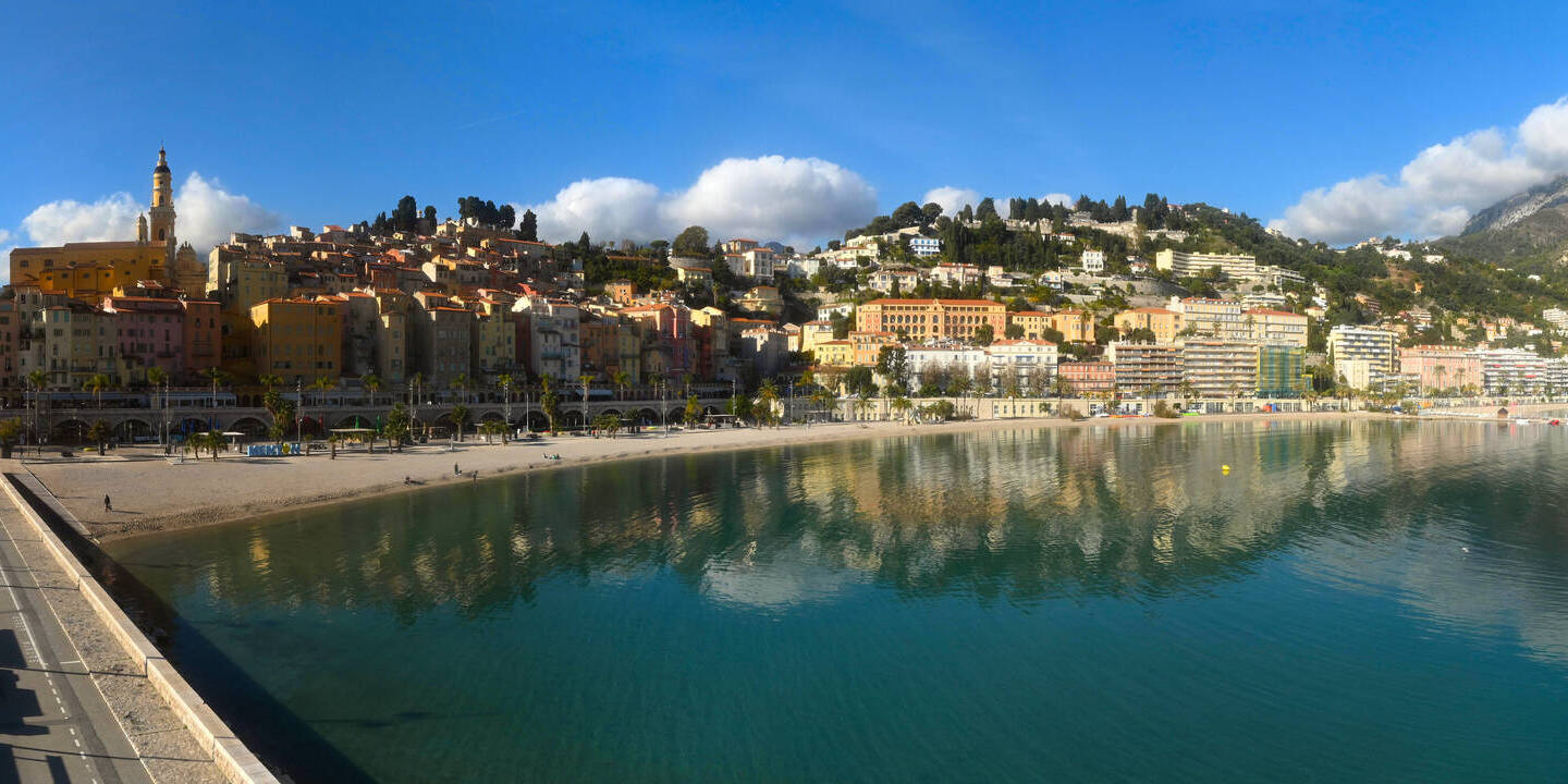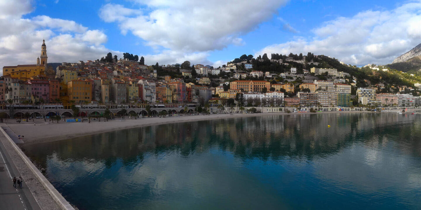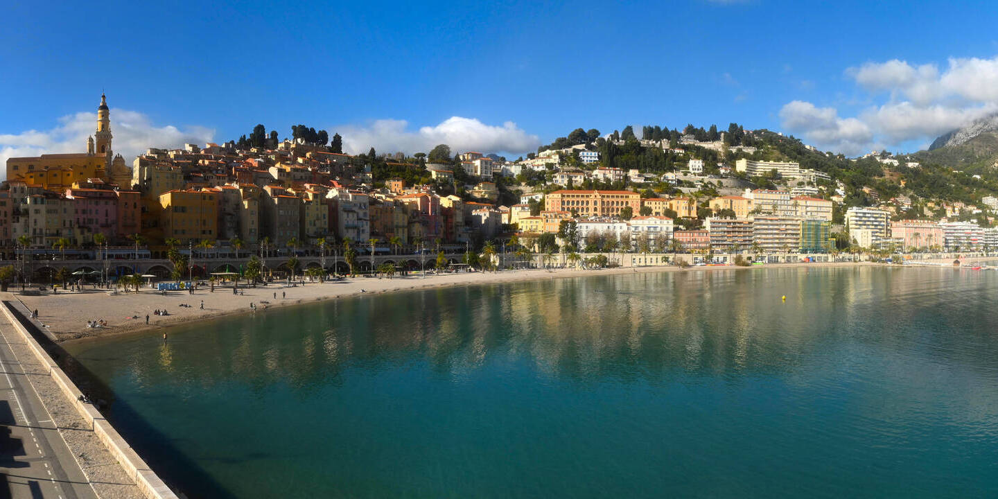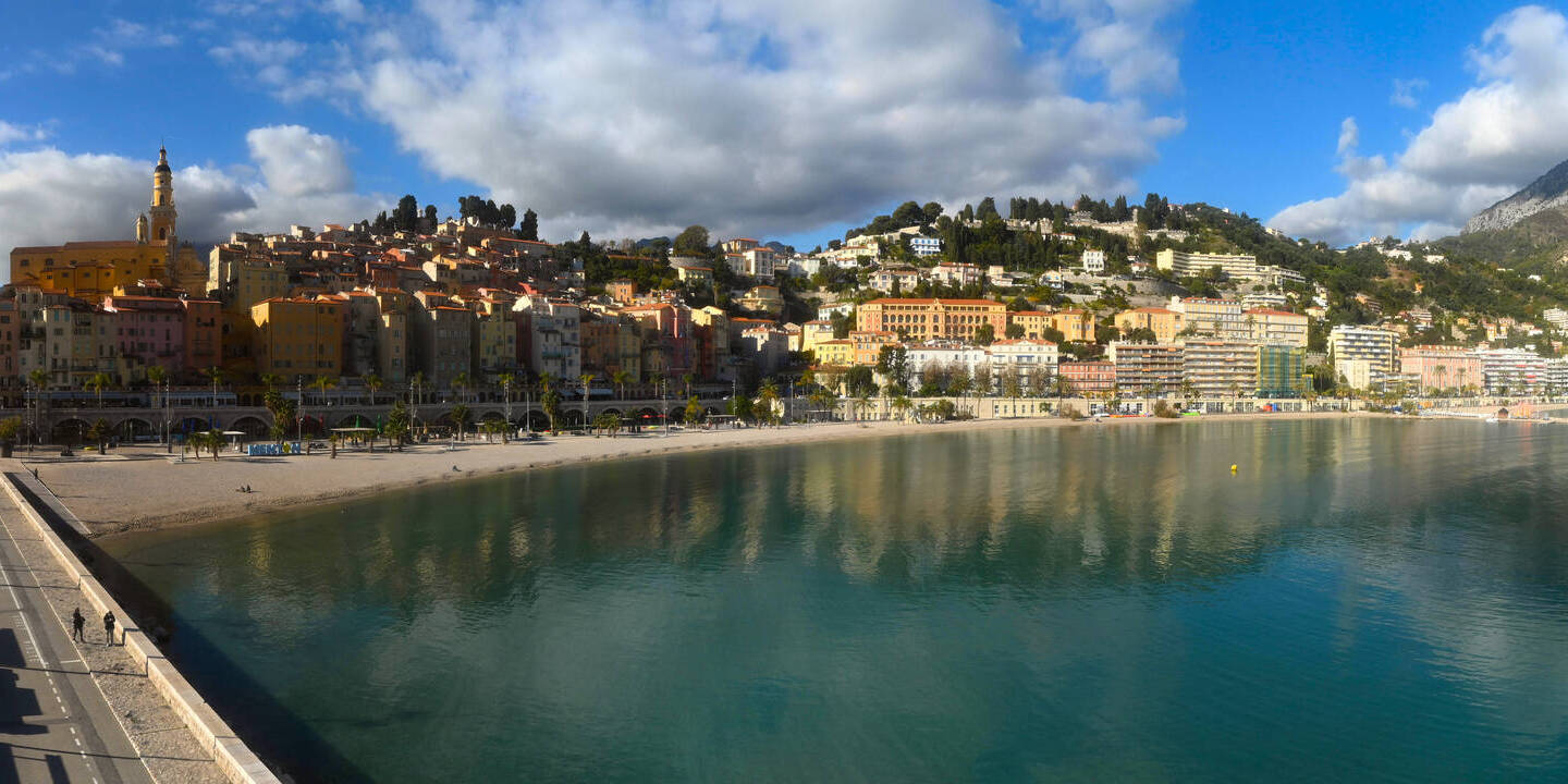 Ventimiglia, Italien - 9.4 km von Airole: Strandpanorama - Blick auf den Strand, die Promenade und die Bucht von Ventimiglia bis zur französischen Riviera.