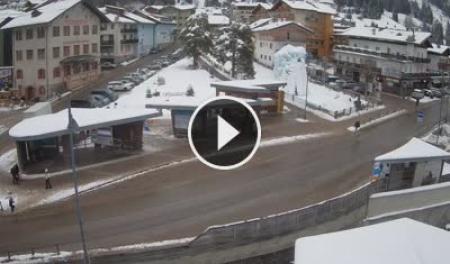 - Blick auf die Piazza Marconi, die Kabinenbahn Belvedere Canazei-Pecol im Hintergrund.