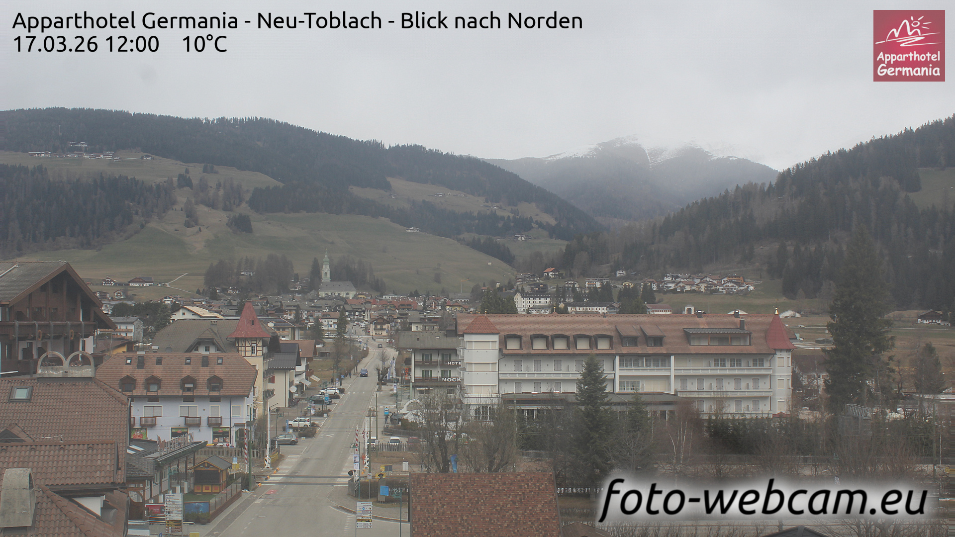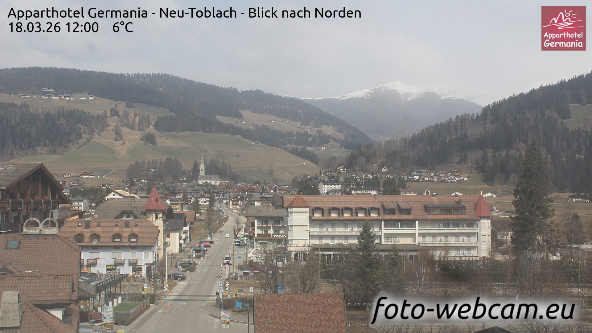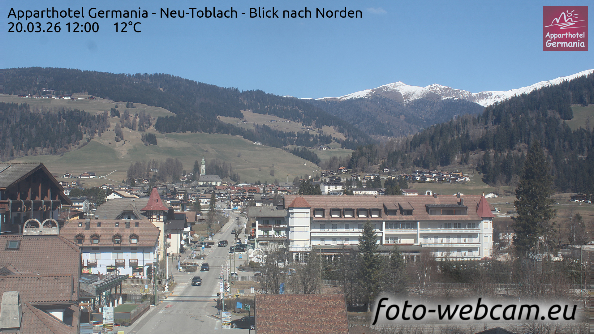 Toblach (Dolomites), Italien - 1 km von Dobbiaco: Apparthotel Germania - Die Webcam befindet sich in Toblach am Apparthotel Germania in der Dolomitenregion Drei Zinnen. Mit der Livecam erhalten Sie einen tollen Einblick auf die Ortschaft Toblach (bekannt auch als das Tor zu den Dolomiten) und einen Ausblick auf den 'schlafenden Riesen'. Übrigens gehören auch diese Berge zum UNESCO Weltnaturerbe Dolomiten.