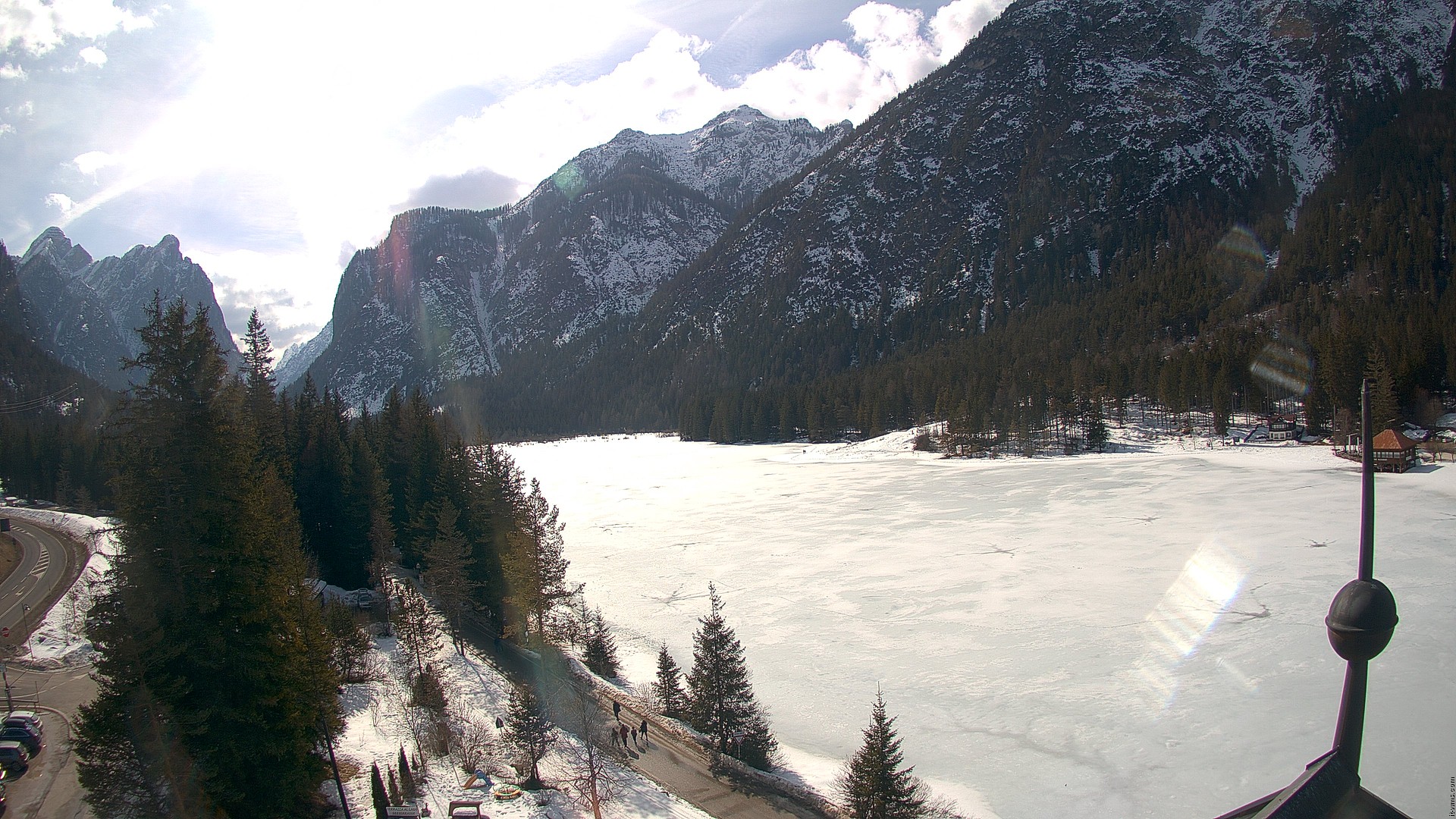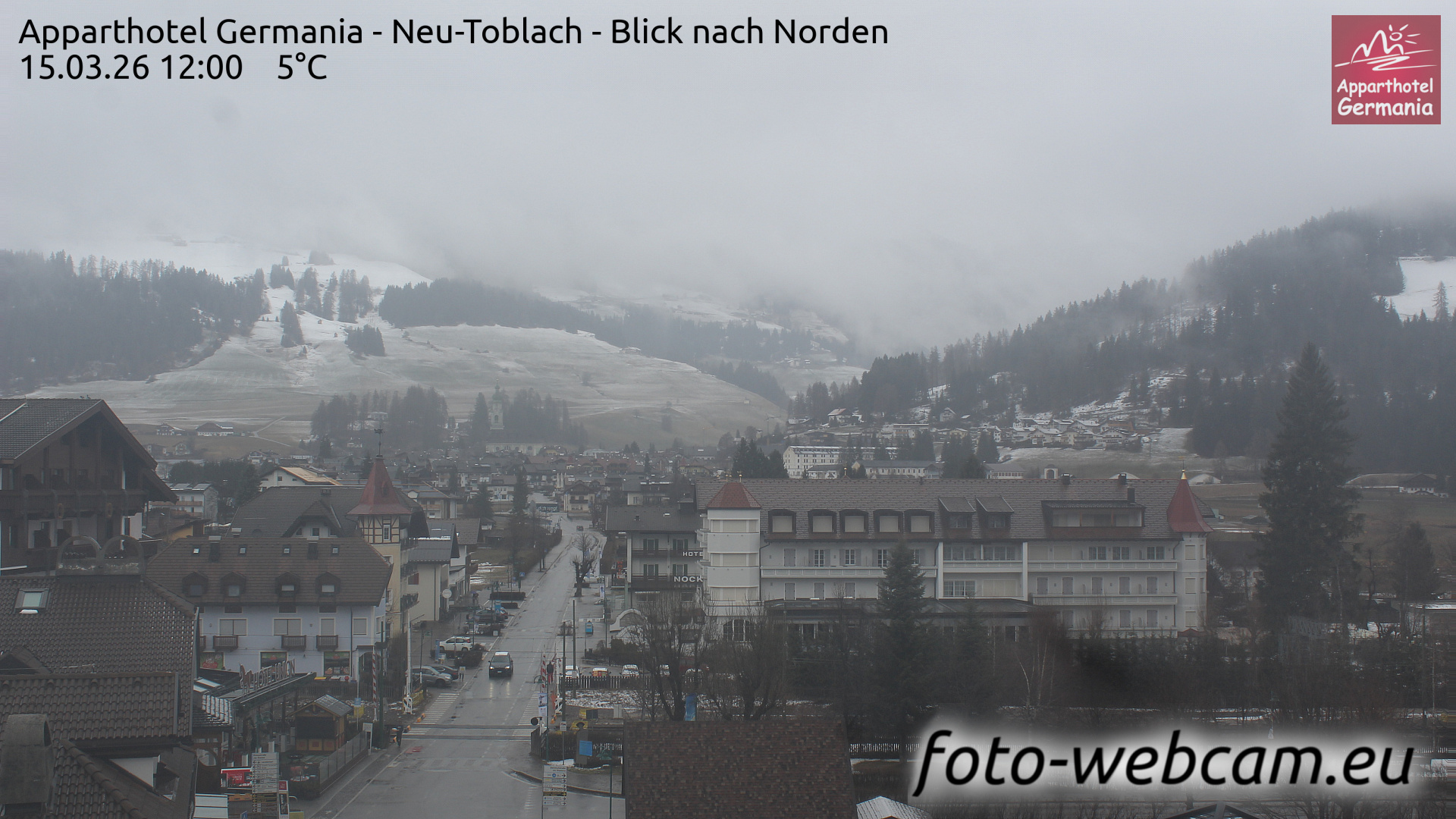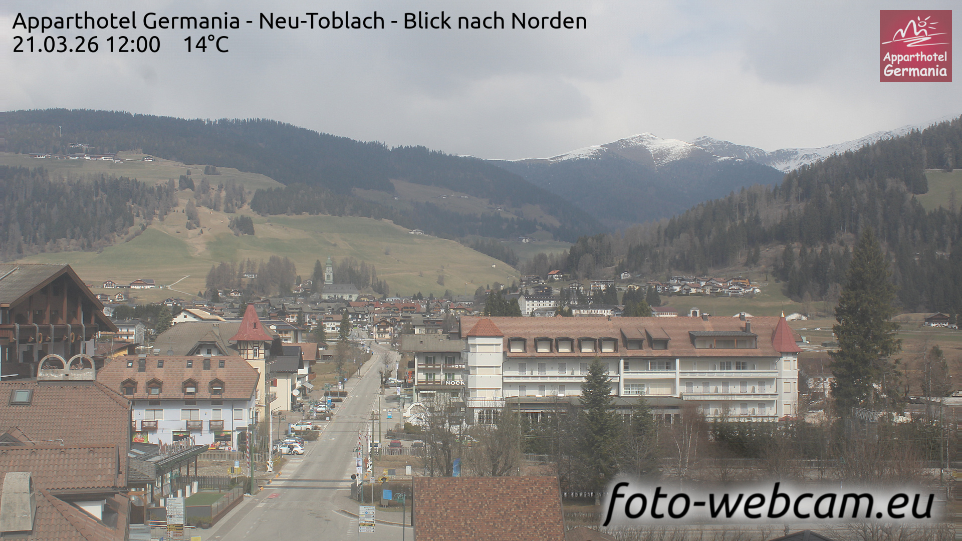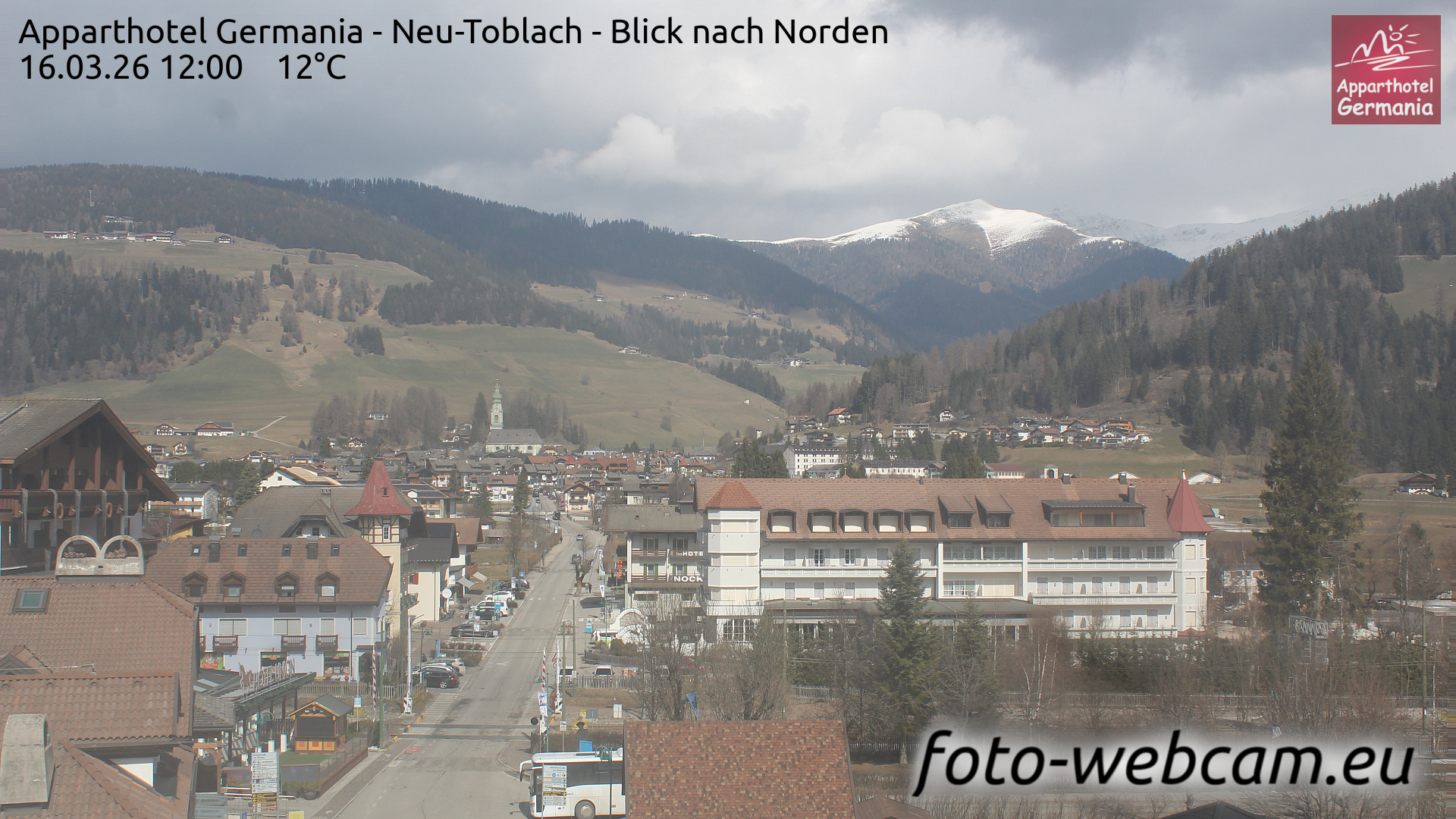 Toblach (Dolomites), Italien - 1 km von Dobbiaco: Apparthotel Germania - Die Webcam befindet sich in Toblach am Apparthotel Germania in der Dolomitenregion Drei Zinnen. Mit der Livecam erhalten Sie einen tollen Einblick auf die Ortschaft Toblach (bekannt auch als das Tor zu den Dolomiten) und einen Ausblick auf den 'schlafenden Riesen'. Übrigens gehören auch diese Berge zum UNESCO Weltnaturerbe Dolomiten.
