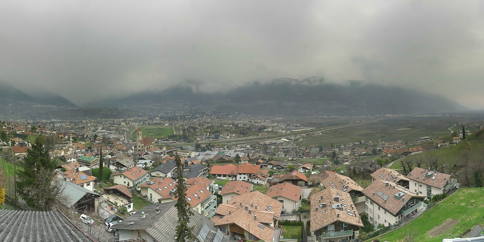 Marling, Italien - 8.8 km von Gargazzone: PanoCam Marling - Die Webcam befindet sich unterhalb des Marlinger Waalweges und zeigt die idyllische Ortschaft Marling und im Hintergrund die Kurstadt Meran.