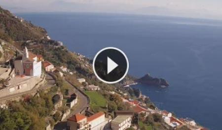 Praiano, Italien - 12.9 km von Piano di Sorrento: Livestream Praiano - Divina Costiera - Entlang der wunderbaren Amalfiküste, ein Blick über Capri und die Faraglioni im Hintergrund.