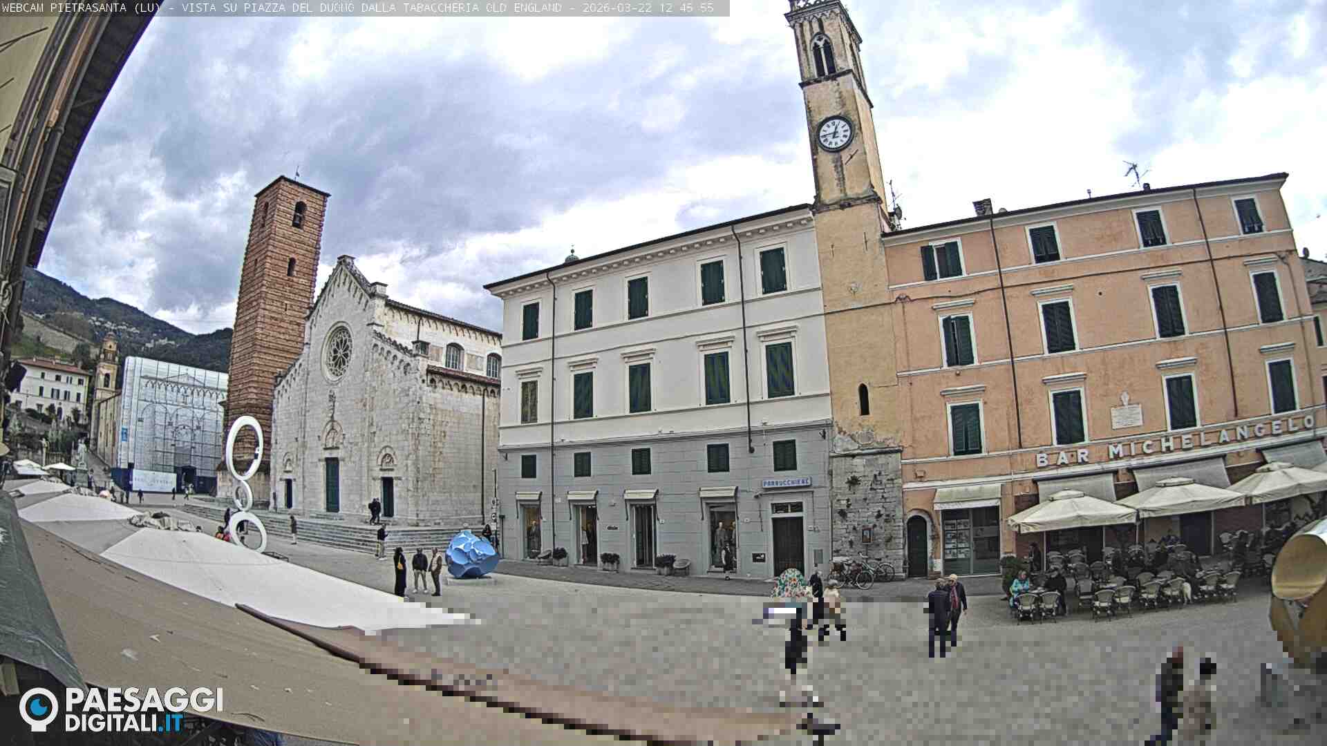 - Ein schöner Blick auf die Piazza Duomo im Künstlerdorf Pietrasanta.