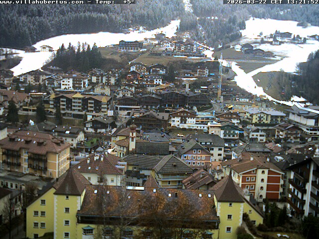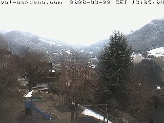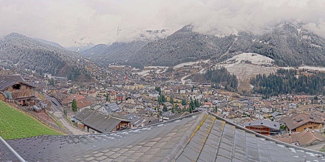 Kastelruth, Italien - 4.6 km von San Pietro: Panoramakamera Kastelruth - Die Webcam befindet sich auf der Marinzen Alm und zeigt Kastelruth und sein geschichtsträchtiges Zentrum von oben. Ebenfalls zu sehen ist der Kalvarienberg, Kofel genannt. Der Panoramablick reicht von den Dolomiten mit Rosszähnen und Schlern über die Brenta und Ortler Gruppe hin zu den Sarntaler Alpen.