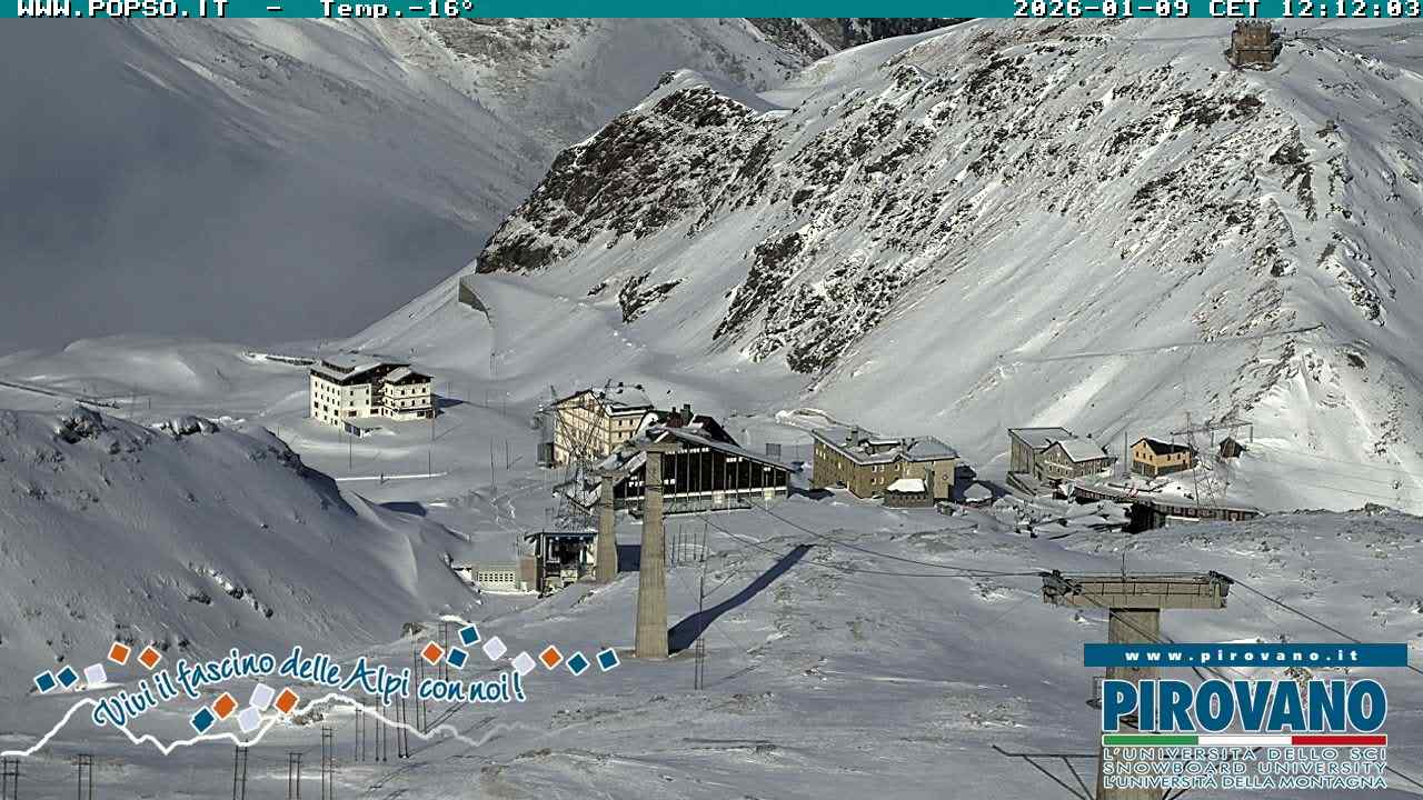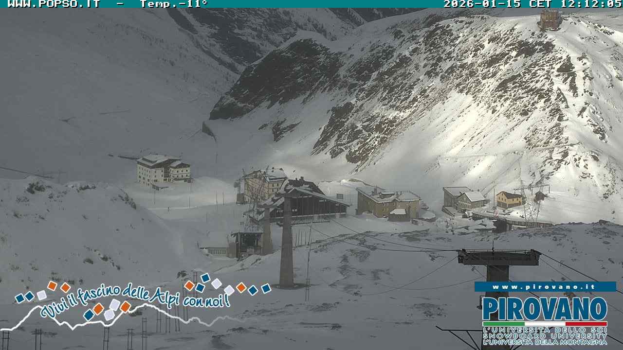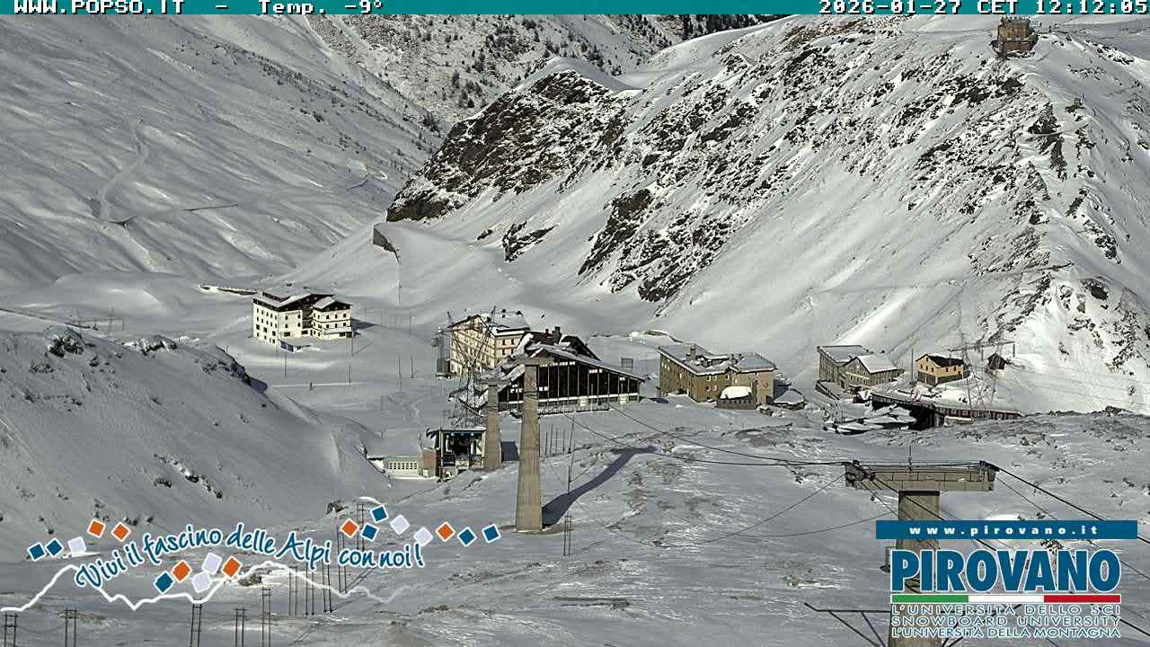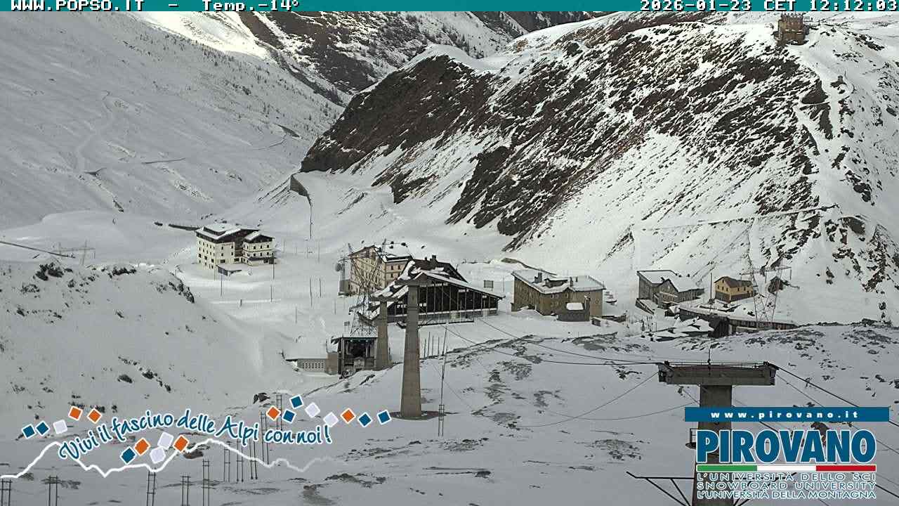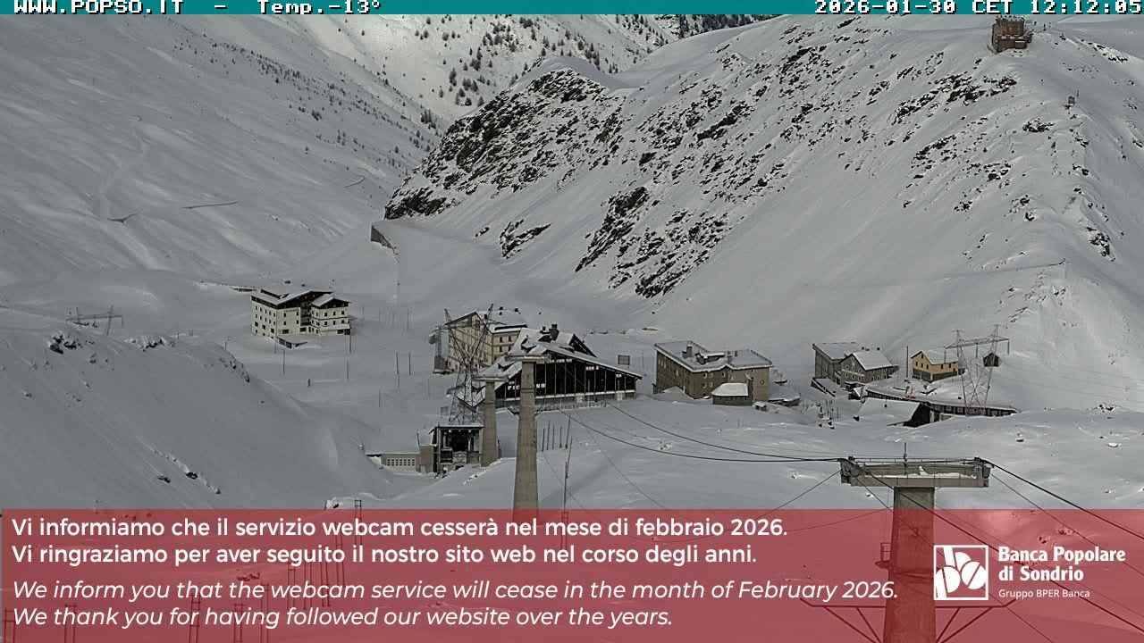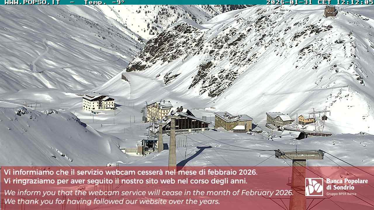 Stelvio Pass, Italien - 4 km von San Raineri: Mehrere Webcams - Zu sehen ist der letzte Teil des Veltlins in der Lombardei mit der Kaiserstraße, die über die höchste Stelle des Stilfserjochs führt.