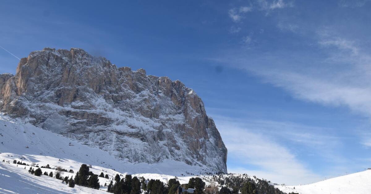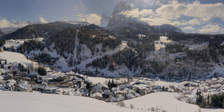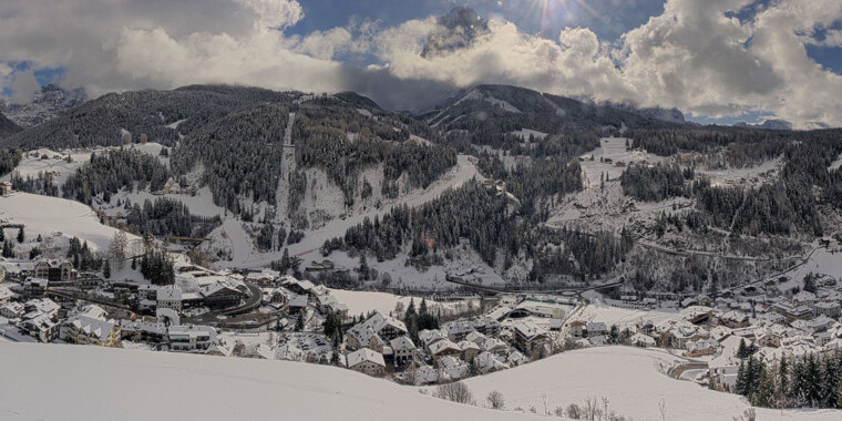 - Panoramaaussicht auf die Langkofelgruppe, die Saslong Skiweltcup Abfahrtspiste, die Sellagruppe sowie auf das Dorf St. Christina in Gröden (1.428 m).