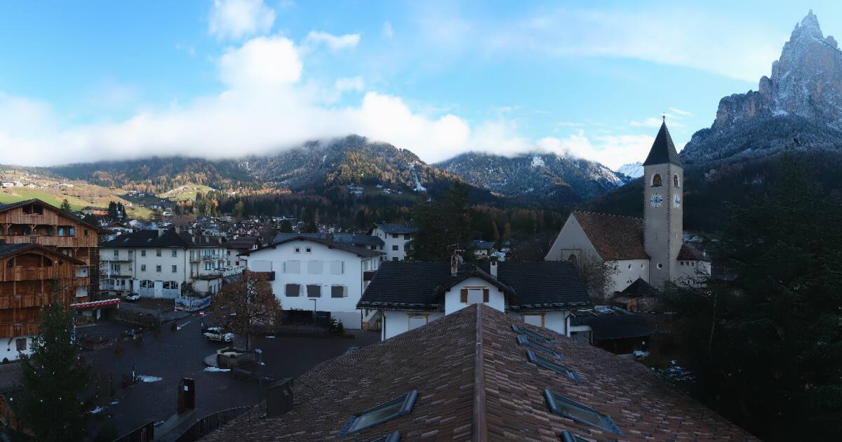Völs am Schlern, Italien - 5.1 km von Siusi: Panocam Völs - Die Webcam befindet sich im Dorfzentrum von Völs am Schlern und bietet einen Rundumblick über den Kurort und die nahen Dolomitengipfel. Der sagenumwobene Schlern, der das Dorfbild bestimmt, gilt als Wahrzeichen Südtirols.