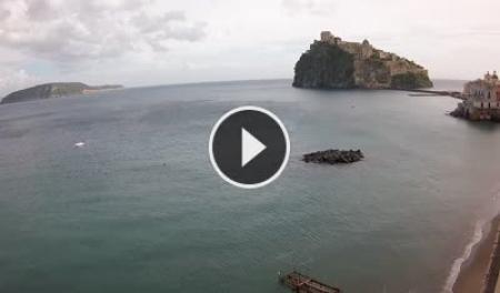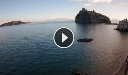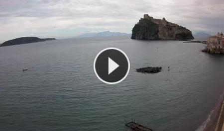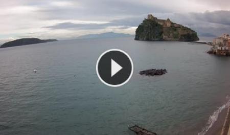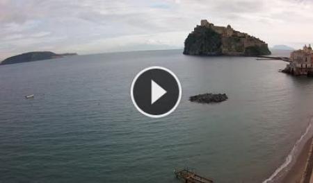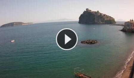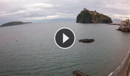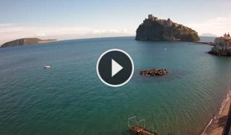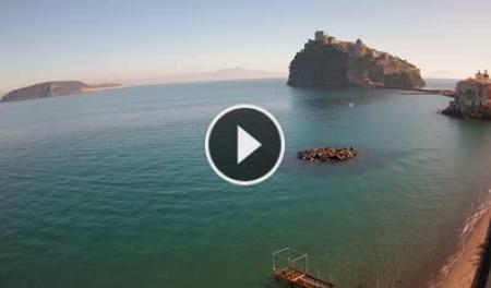 - Blick über das Schloss, den Strand Mandra und das Dorf von Ischia Ponte