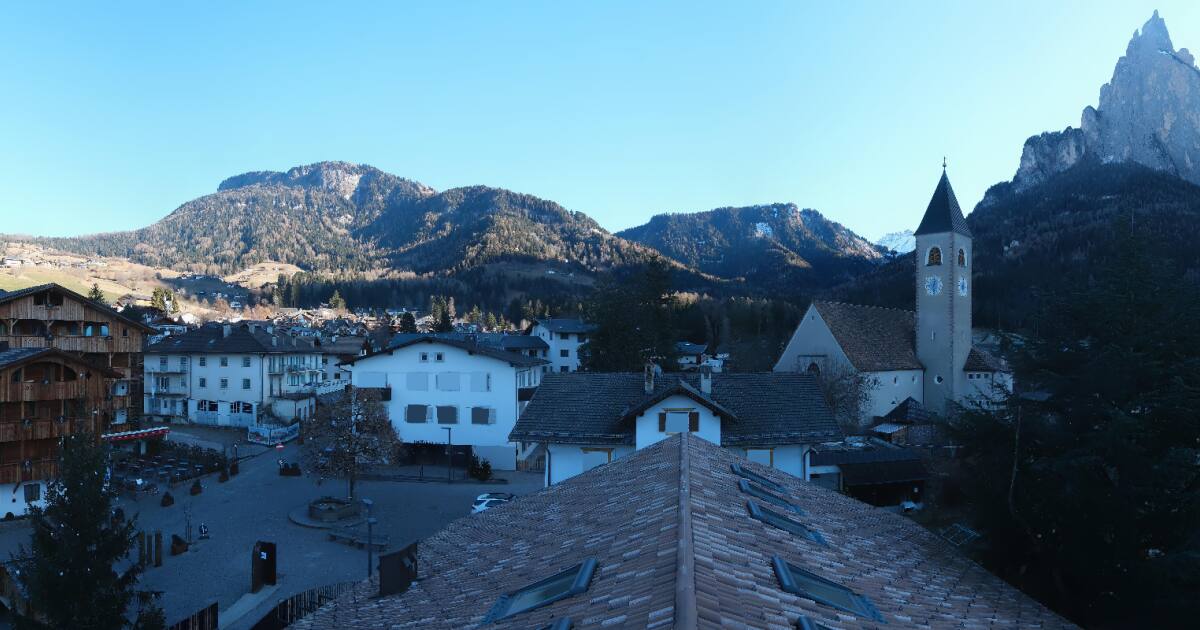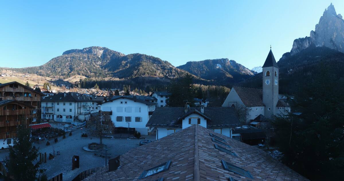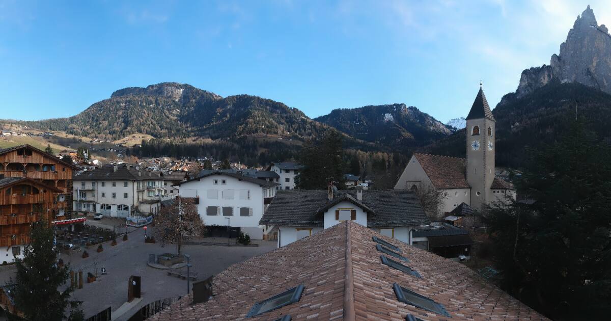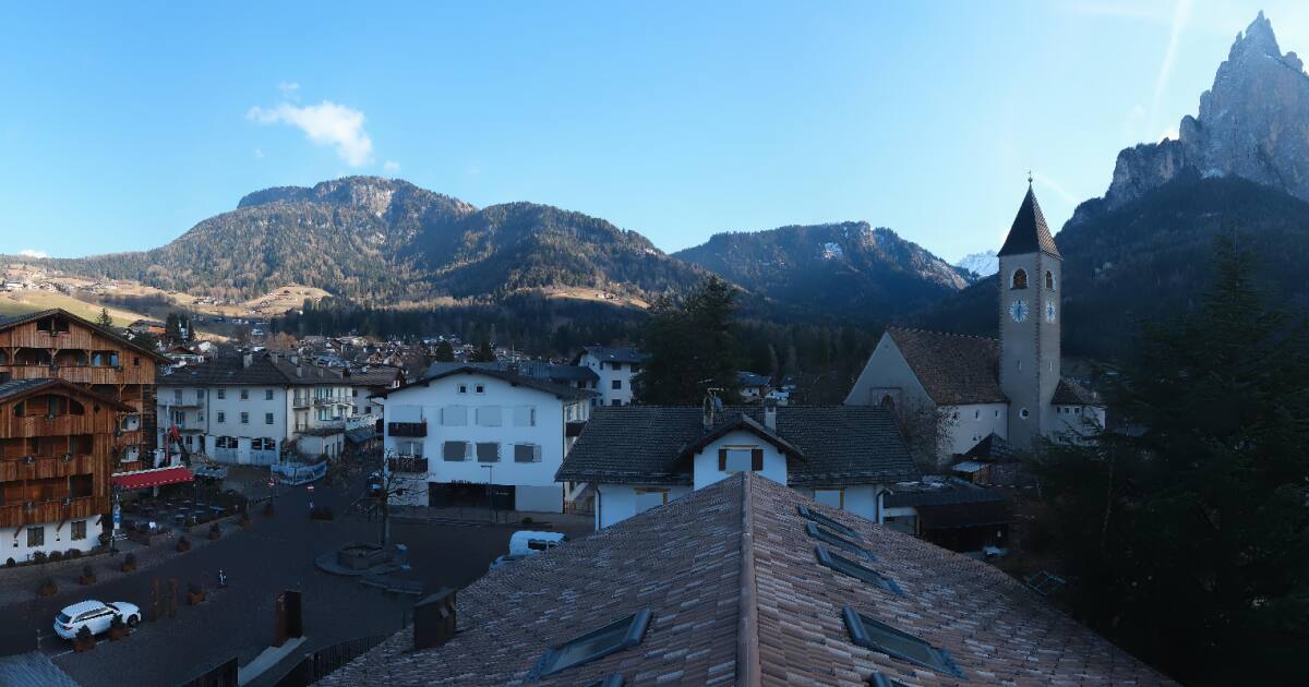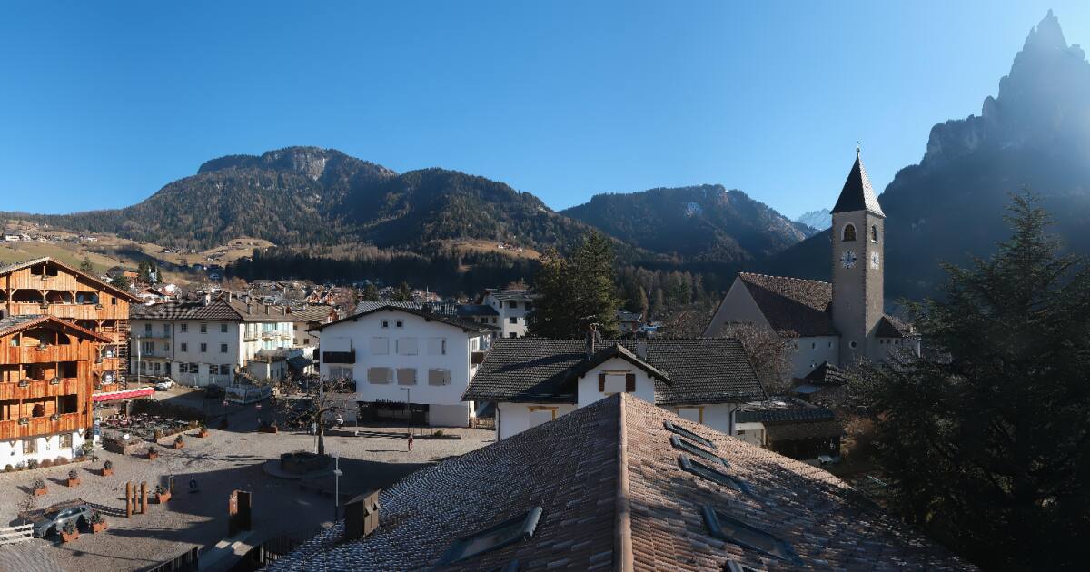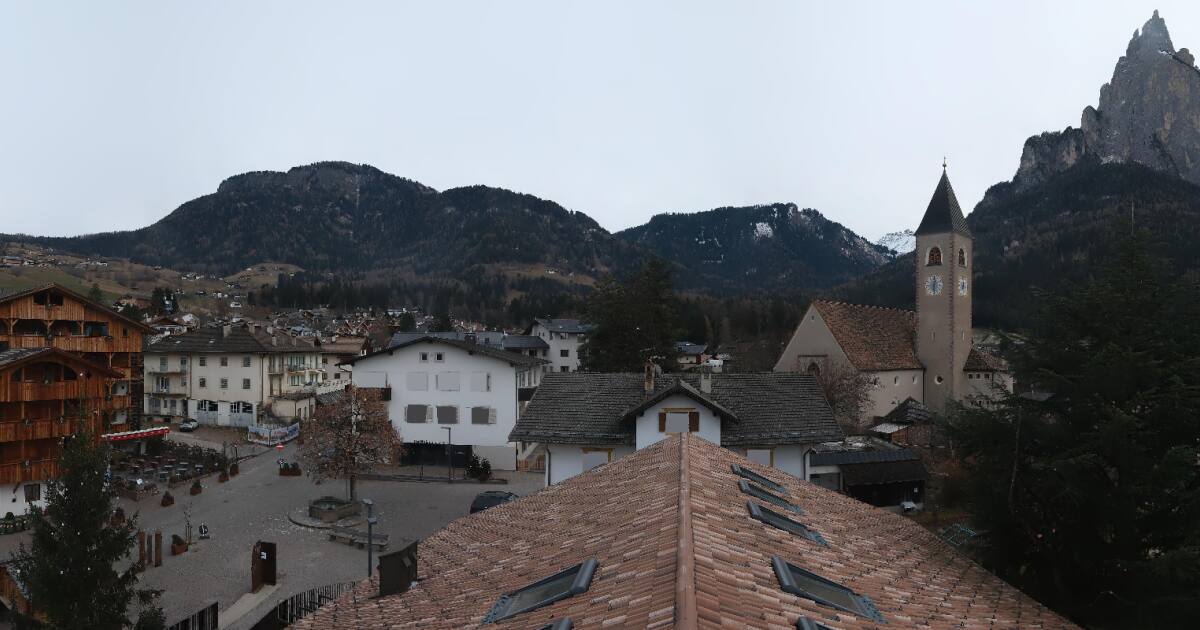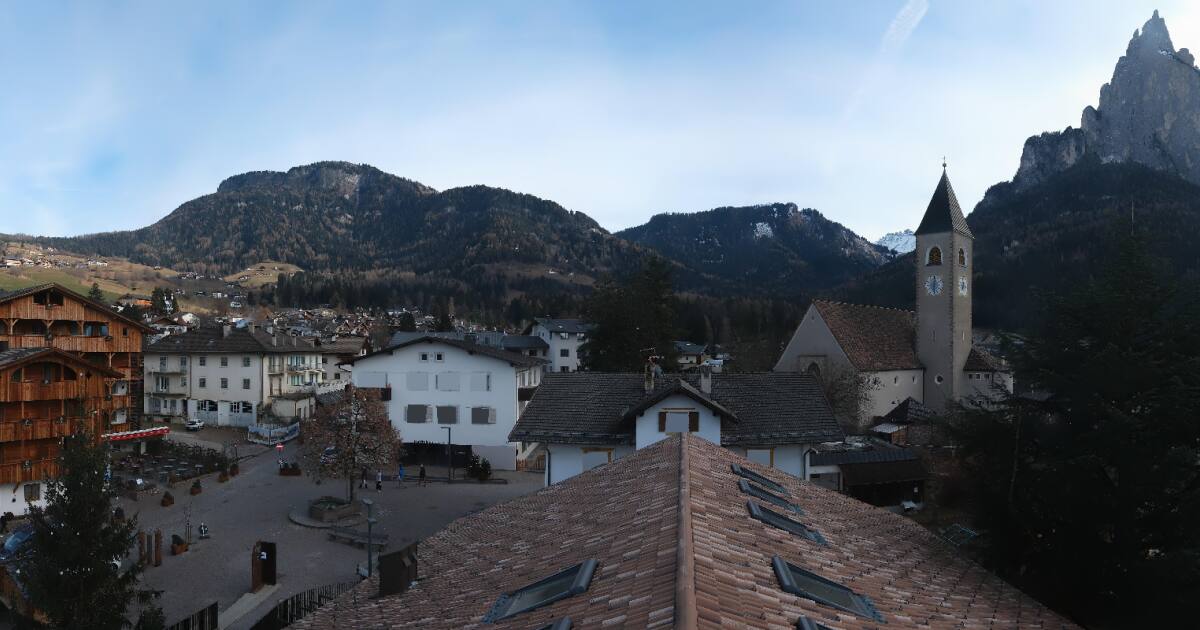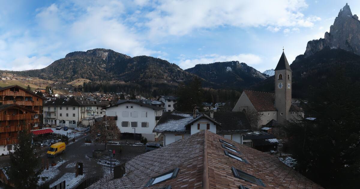 Kastelruth, Italien - 4.2 km von Waidbruch: Panoramakamera Kastelruth - Die Webcam befindet sich auf der Marinzen Alm und zeigt Kastelruth und sein geschichtsträchtiges Zentrum von oben. Ebenfalls zu sehen ist der Kalvarienberg, Kofel genannt. Der Panoramablick reicht von den Dolomiten mit Rosszähnen und Schlern über die Brenta und Ortler Gruppe hin zu den Sarntaler Alpen.