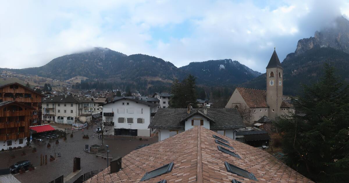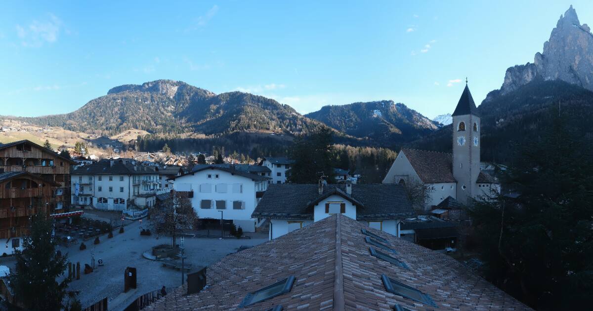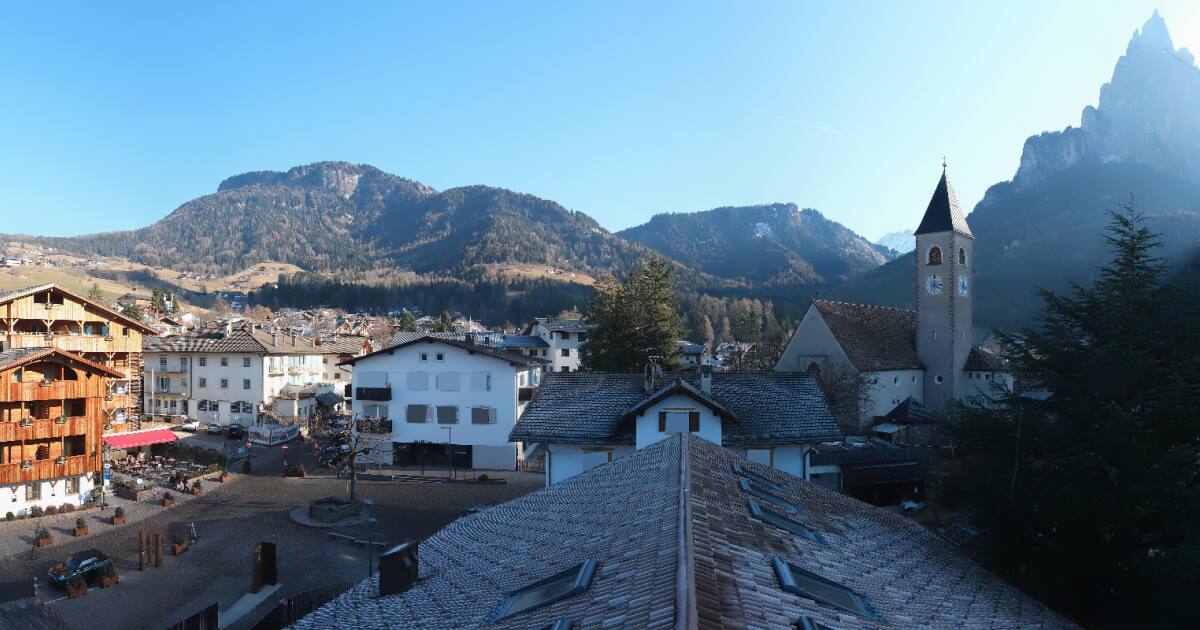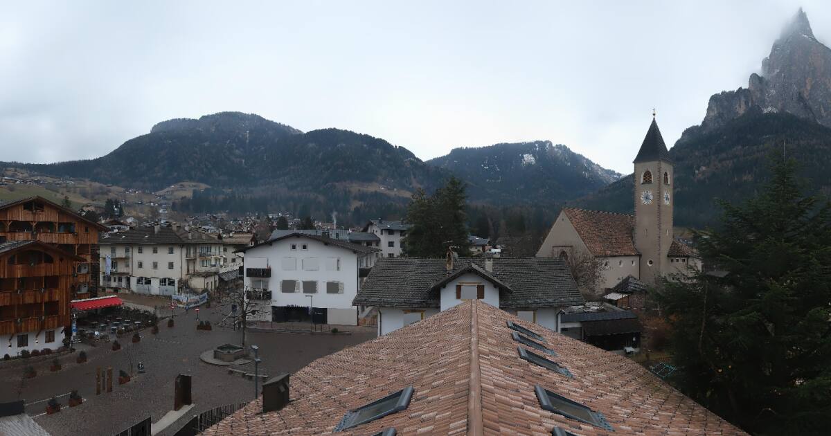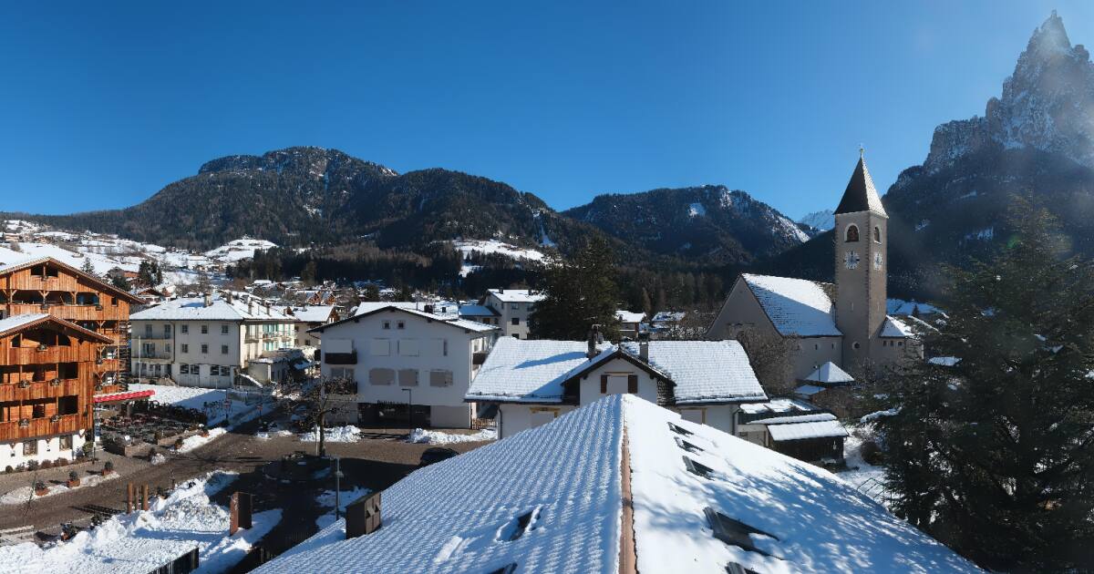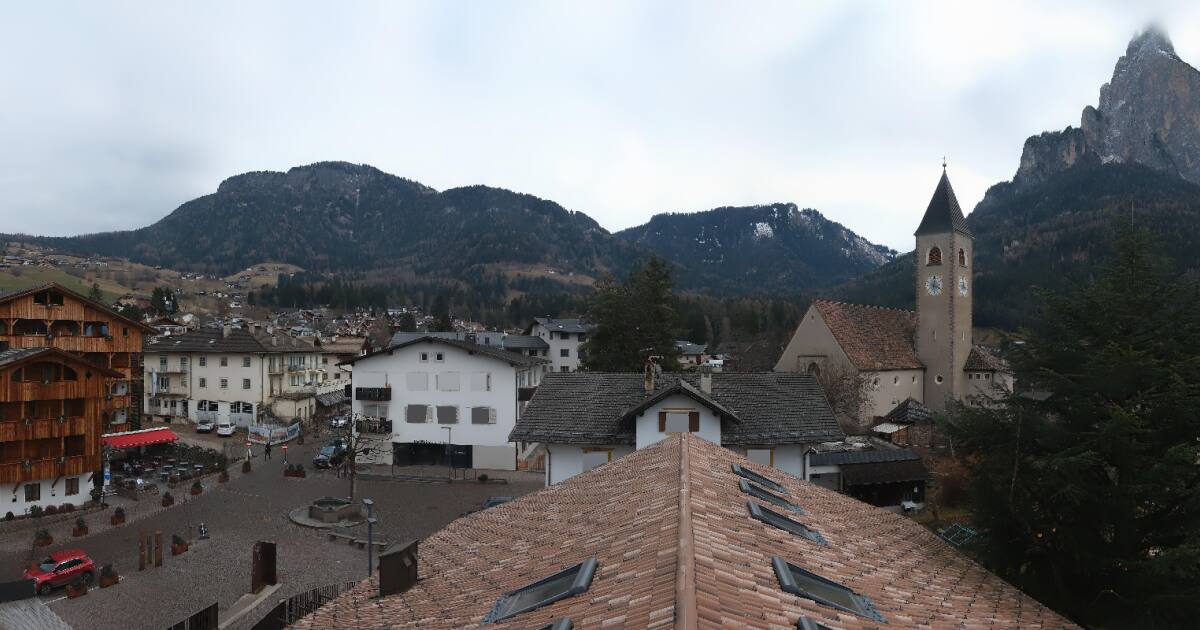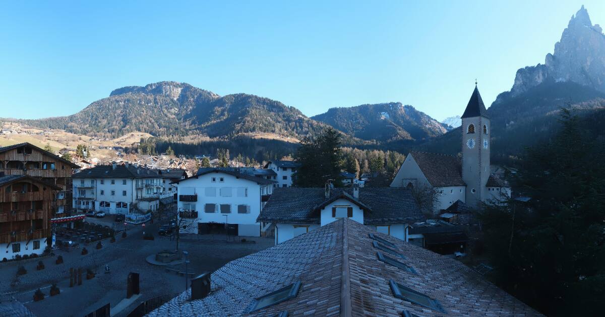 Kastelruth, Italien - 4.2 km von Waidbruch: Panoramakamera Kastelruth - Die Webcam befindet sich auf der Marinzen Alm und zeigt Kastelruth und sein geschichtsträchtiges Zentrum von oben. Ebenfalls zu sehen ist der Kalvarienberg, Kofel genannt. Der Panoramablick reicht von den Dolomiten mit Rosszähnen und Schlern über die Brenta und Ortler Gruppe hin zu den Sarntaler Alpen.