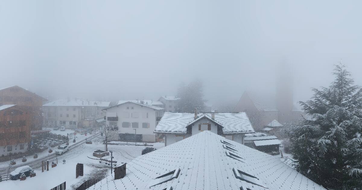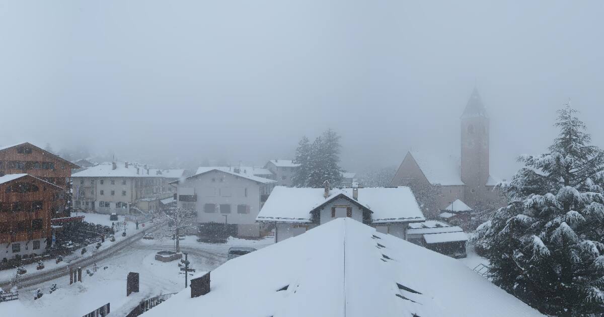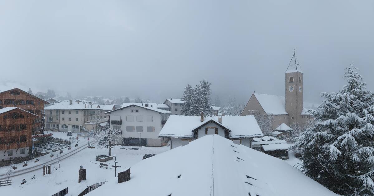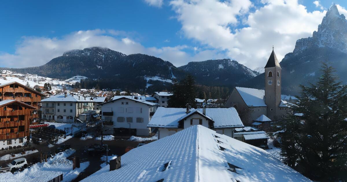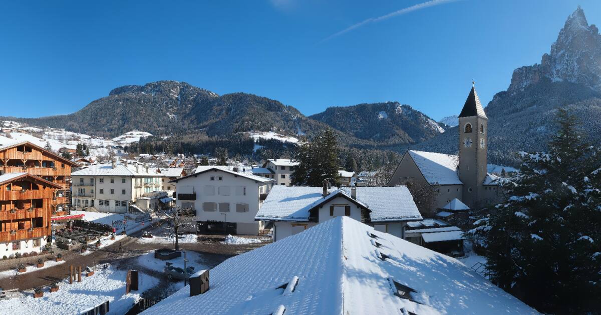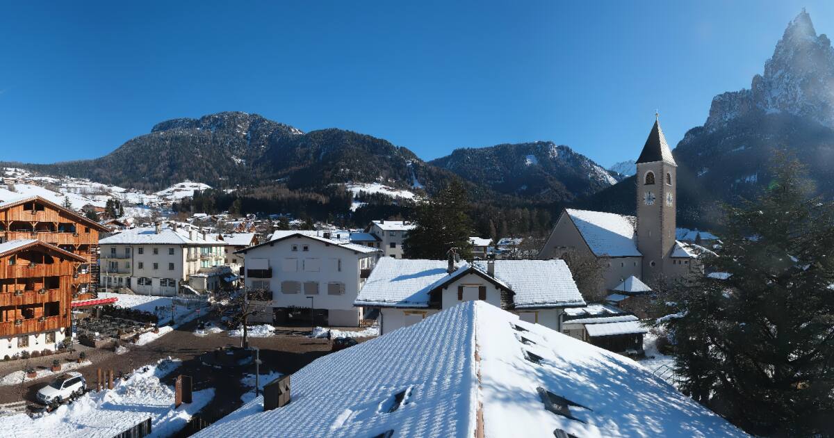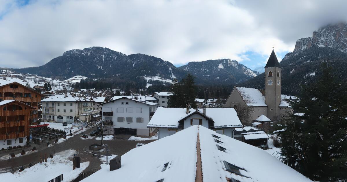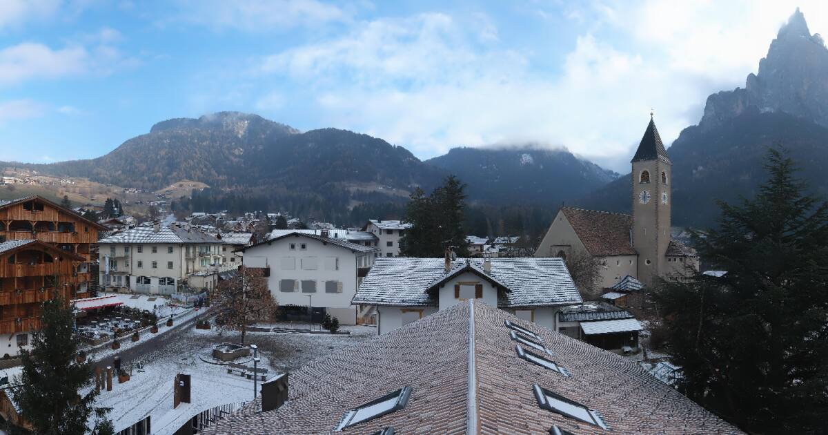 Kastelruth, Italien - 4.2 km von Waidbruch: Panoramakamera Kastelruth - Die Webcam befindet sich auf der Marinzen Alm und zeigt Kastelruth und sein geschichtsträchtiges Zentrum von oben. Ebenfalls zu sehen ist der Kalvarienberg, Kofel genannt. Der Panoramablick reicht von den Dolomiten mit Rosszähnen und Schlern über die Brenta und Ortler Gruppe hin zu den Sarntaler Alpen.
