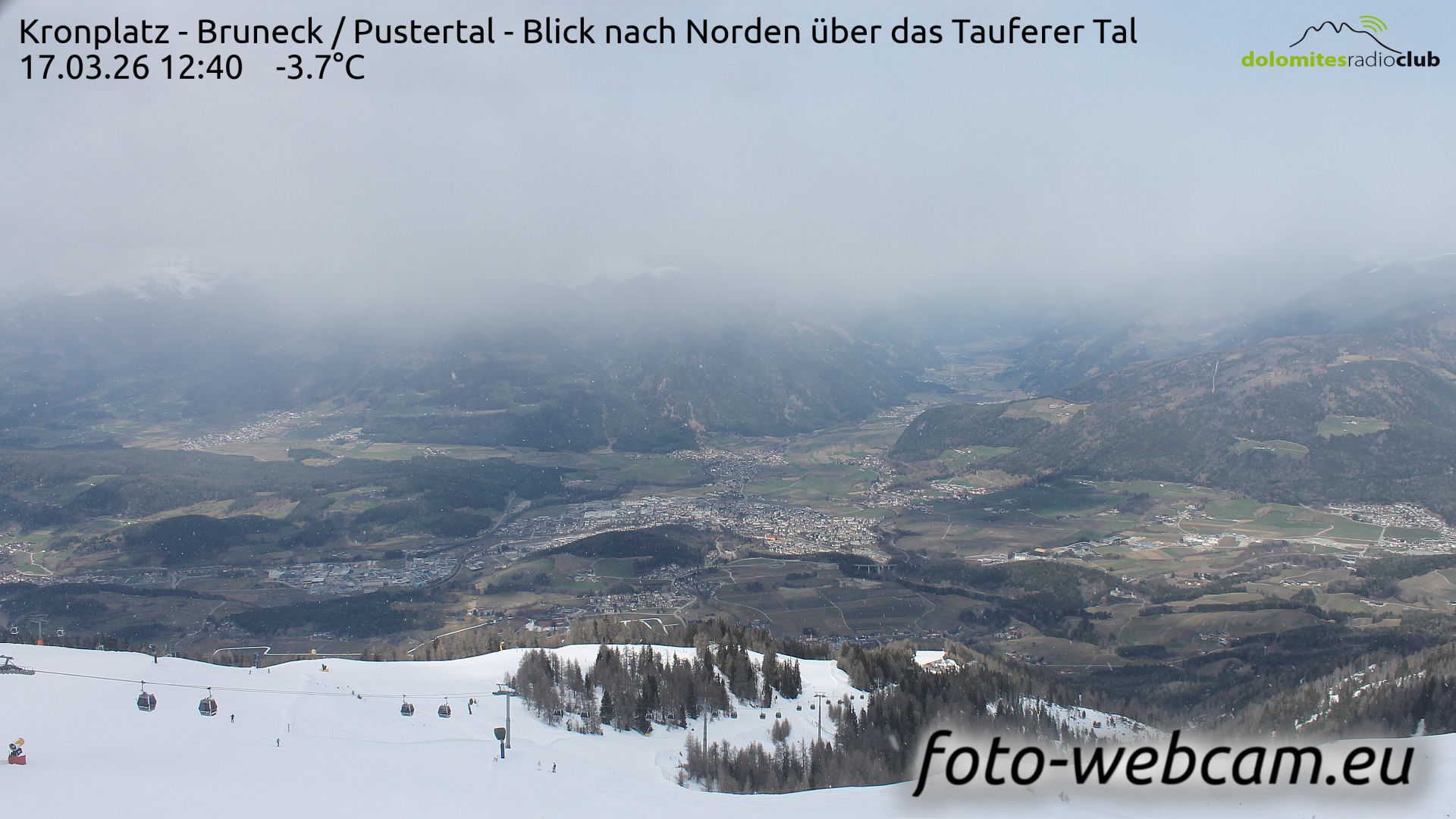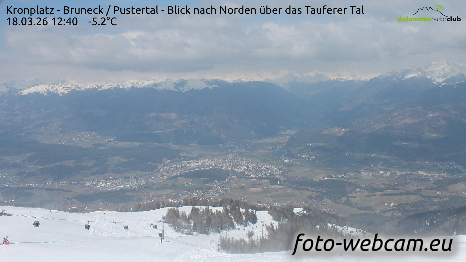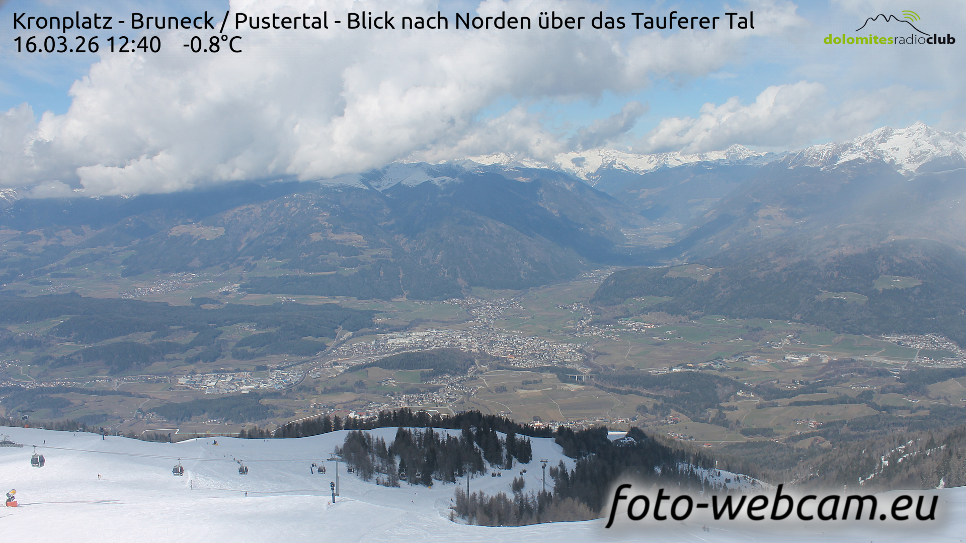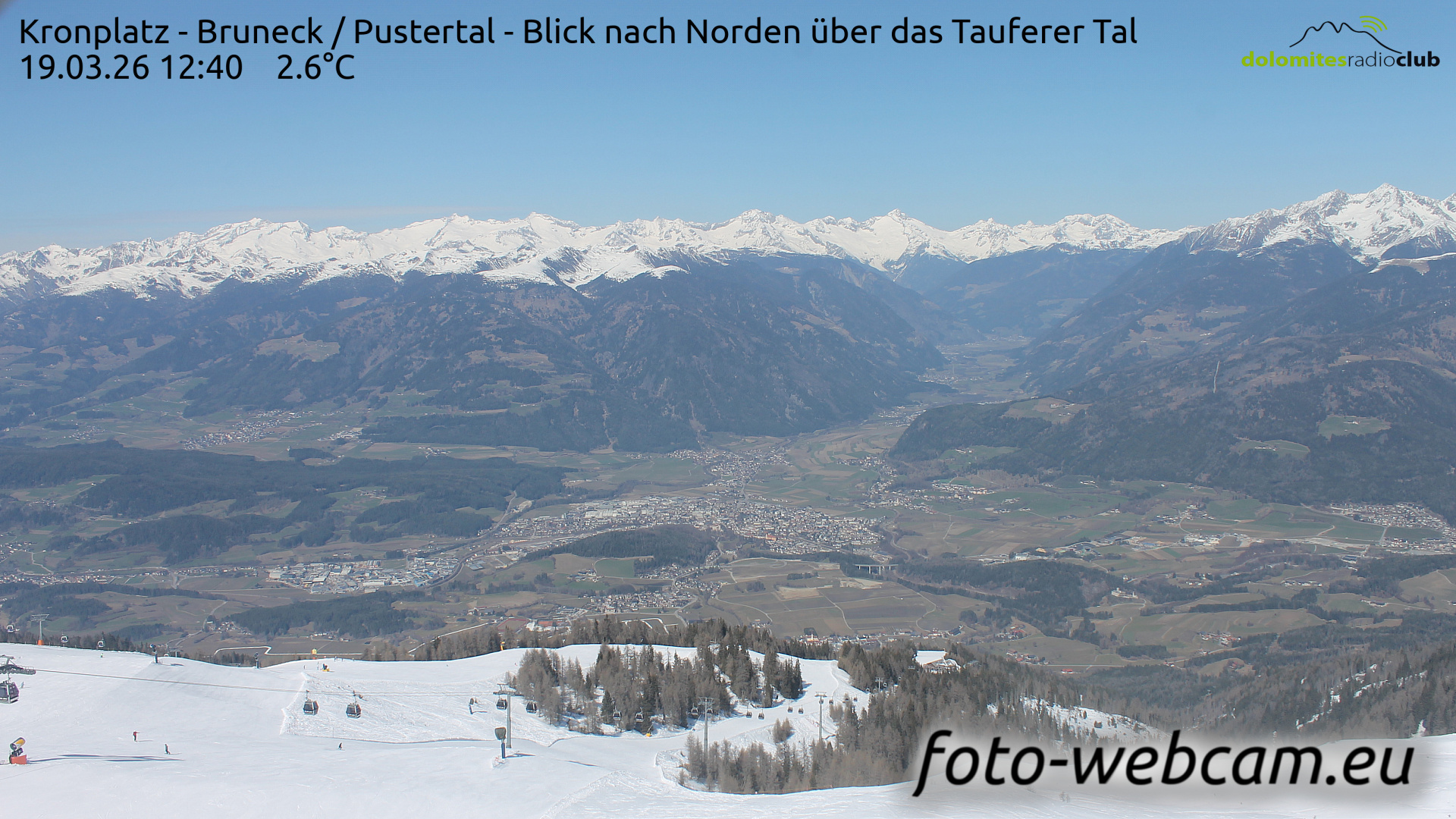 Kronplatz, Italien - 6.2 km von Welschellen: HD Foto-Webcam Bruneck und Tauferer Tal - Panoramablick vom Kronplatz Richtung Norden über Bruneck und das Tauferer Tal.