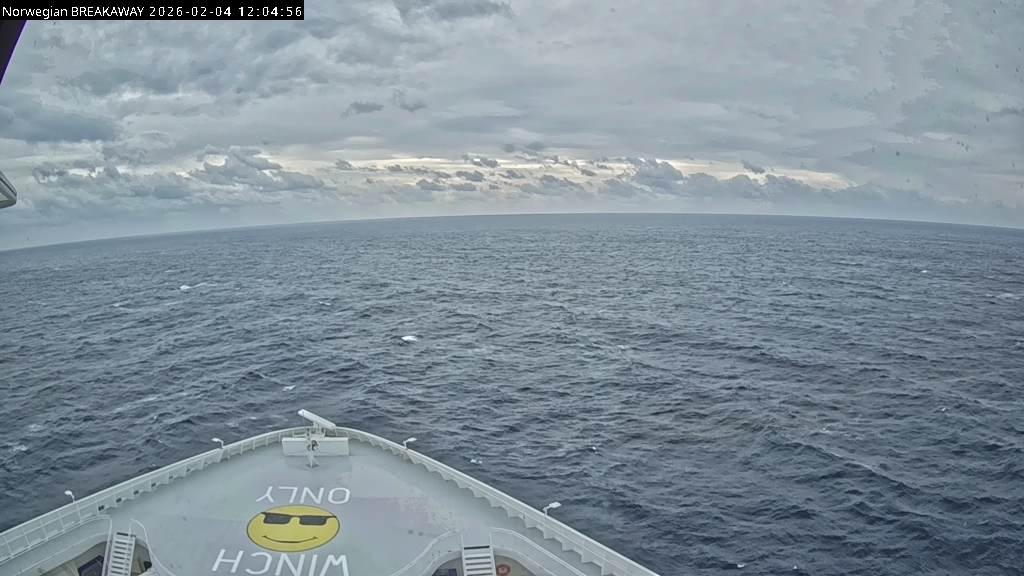 Norwegian Breakaway, Norwegian Cruise Line - 249.8 km von Point Harbor: Live auf See - Werfen Sie einen Blick von der Brücke des Kreuzfahrtschiffes Norwegian Breakaway auf die See.