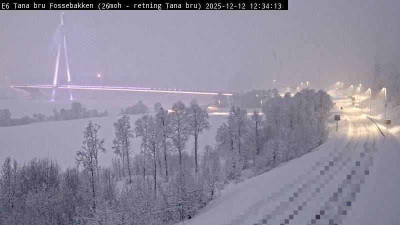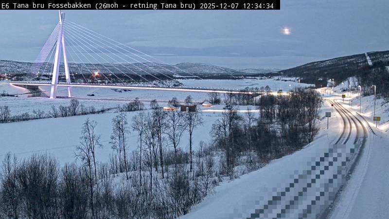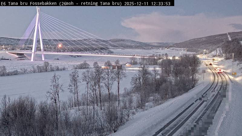 Tana, Norwegen - 124.3 km von Skoganvarre: Verkehr E6 bei Tana Bru Fossebakken