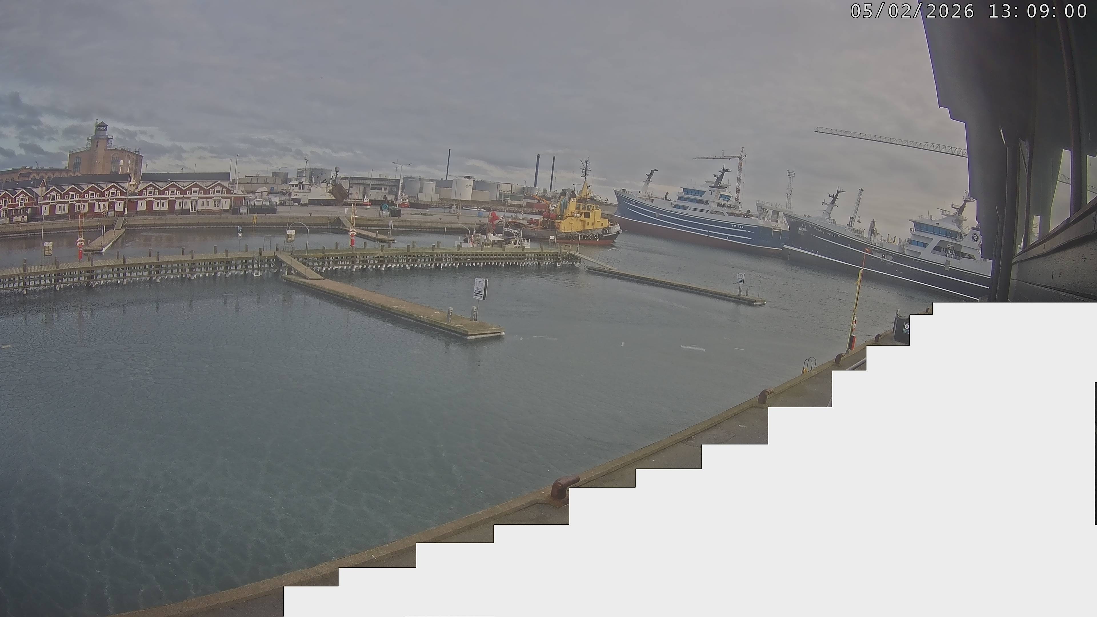 - Vorupør live Strandkamera mit Aussicht über die Fischerboote, Mole und den Strand.