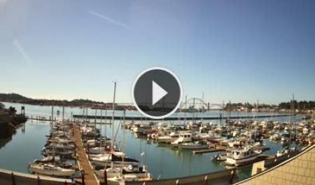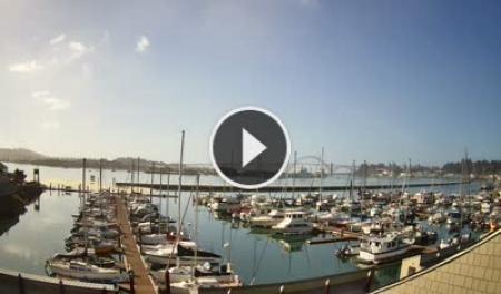 - Blick auf die Embarcadero Marina und die Bucht, Yaquina Bay Bridge im Hintergrund.