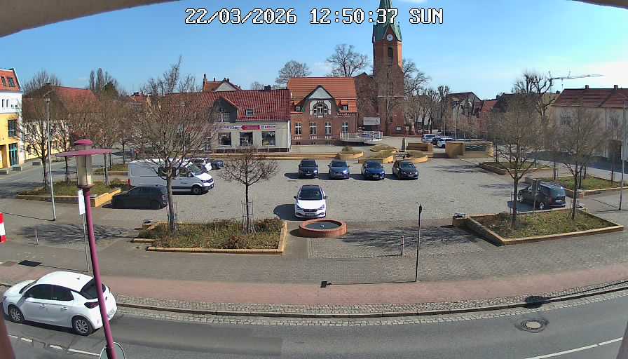 Schwedt (Oder), Deutschland - 117.4 km von Nowa Wioska: Schwedt, Kreuzung Lindenallee/Berliner Straße - Die Kamera befindet sich in 25 Metern Höhe auf dem Dach der Uckermärkischen Bühnen Schwedt und blickt auf die Kreuzung Lindenallee/Berliner Straße, über die Stadt Schwedt bis zur PCK Raffinerie GmbH am Horizont.