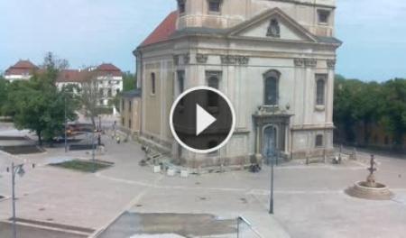 - Blick auf die Großkirche auf dem zentralen Platz von Pápa.