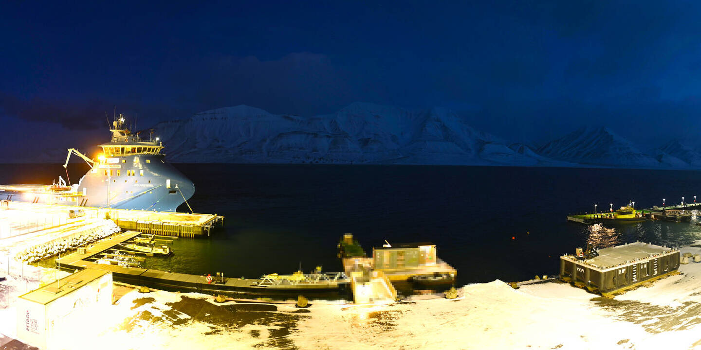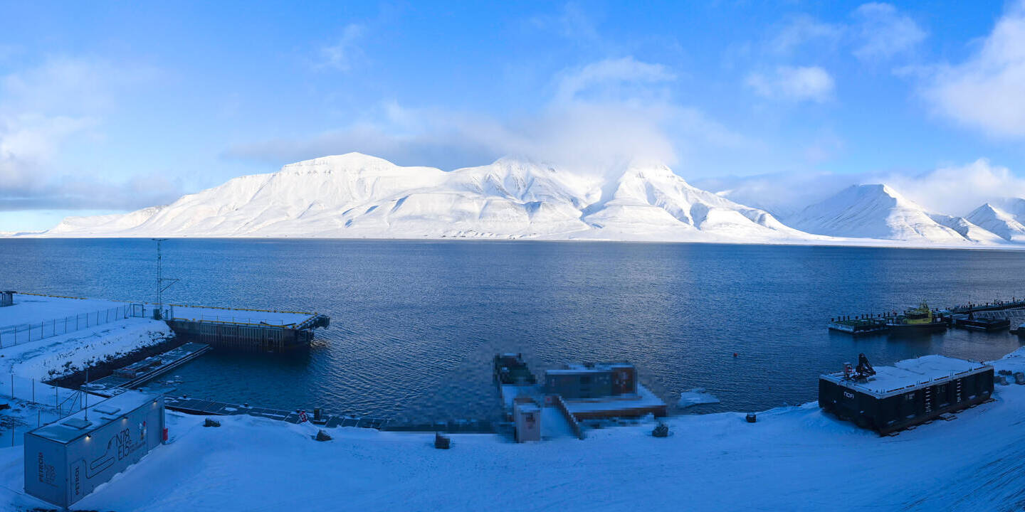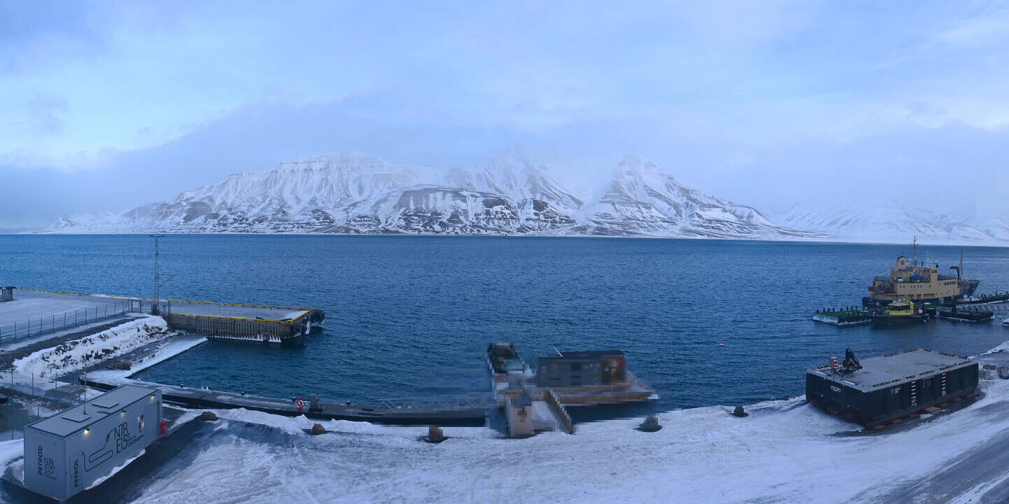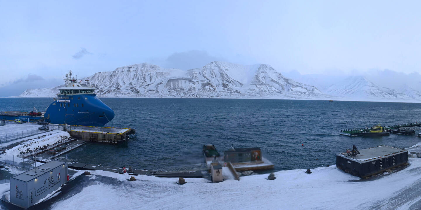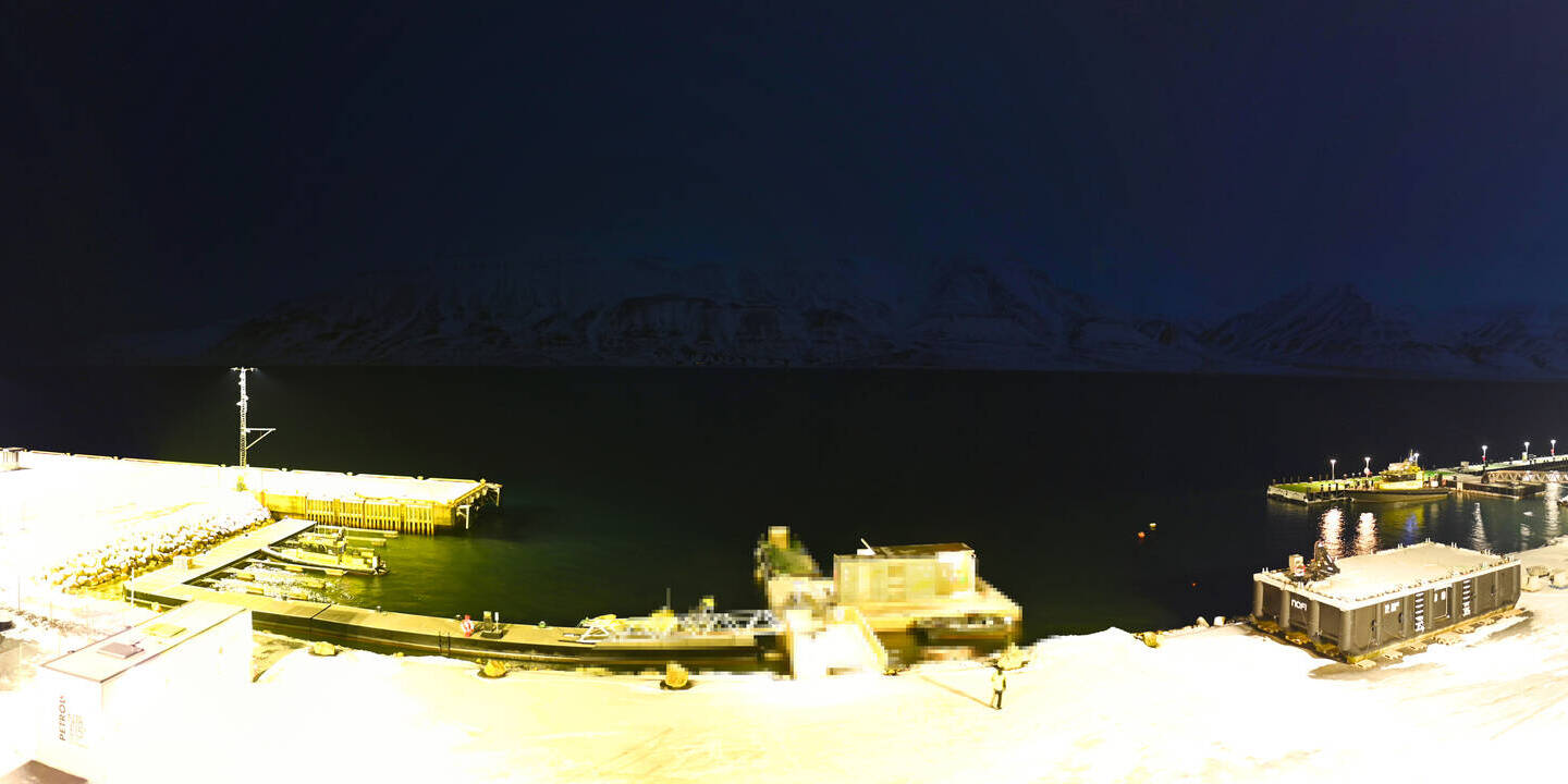 Longyearbyen (Spitsbergen), Norwegen - 36.5 km von Barentsburg: 360°-Panorama Hafen - Ein schöner Panoramablick über den Hafen von Longyearbyen, Spitzbergen.
