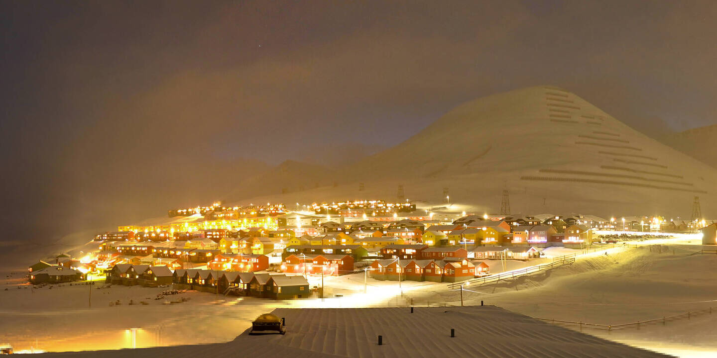 Longyearbyen (Spitsbergen), Norwegen - 2.2 km von Ostre Sverdrupbyen: Panorama Longyearbyen - Ein schöner Panoramablick über Longyearbyen, Spitzbergen.